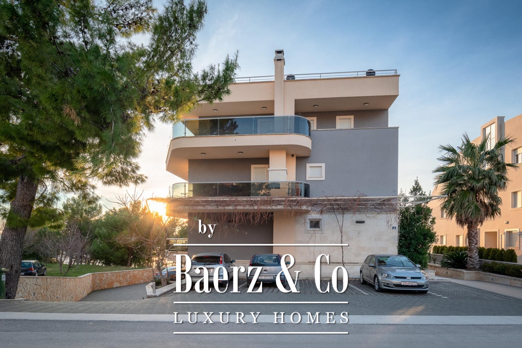 Three terraces, totaling 18.38 m², frame panoramic vistas of the Adriatic, the outlook protected and unchanging. The living areas are bathed in natural light, accentuated by extensive glazing and optimal orientation. A dedicated workroom houses laundry amenities, and a separate wardrobe enhances organization. Throughout, a smart system integrates underfloor heating, air conditioning, air recovery, alarm and smoke detectors, a central vacuum system, solar panels for hot water, electric roller shutters and awnings, and high-end appliances. A traditional brick fireplace on the terrace invites connection with the Dalmatian outdoors.