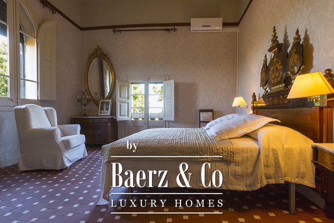 The surrounding grounds extend the experience outdoors with a swimming pool, tennis court, exterior kitchen, terraces, and stately gardens. Auxiliary buildings include a warehouse for machinery, three private water wells, and additional agricultural facilities, reinforcing both the practical and private aspects of the property.
