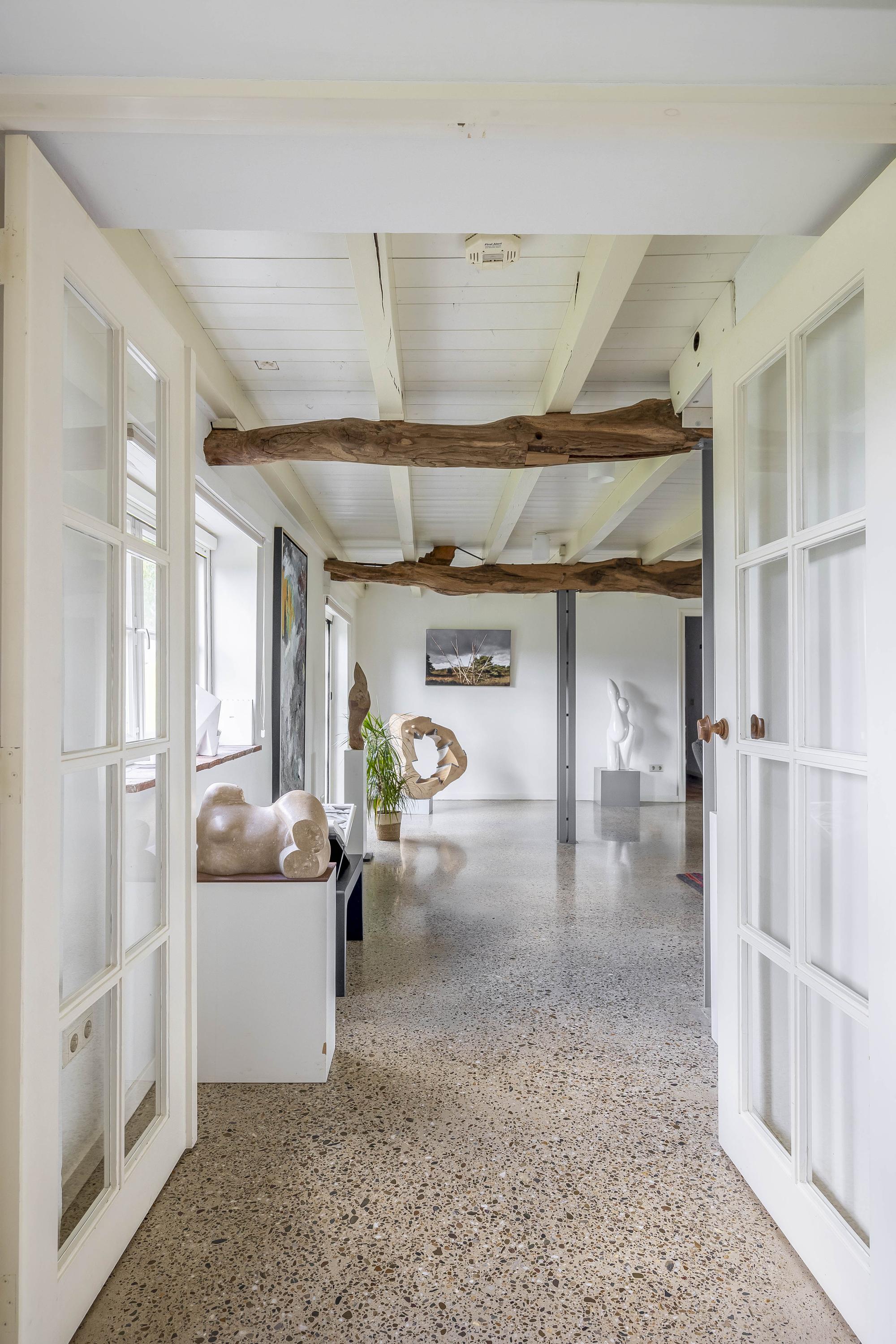 Double doors from the kitchen lead to the living room, which has a smooth, polished concrete floor with underfloor heating. The living room has stucco walls and a beautiful wooden beamed ceiling with attractive old oak beams. A large window at the front and double French doors at the rear offer a beautiful view of the garden. Here too, a wood-burning stove has been installed for extra warmth and cosiness.