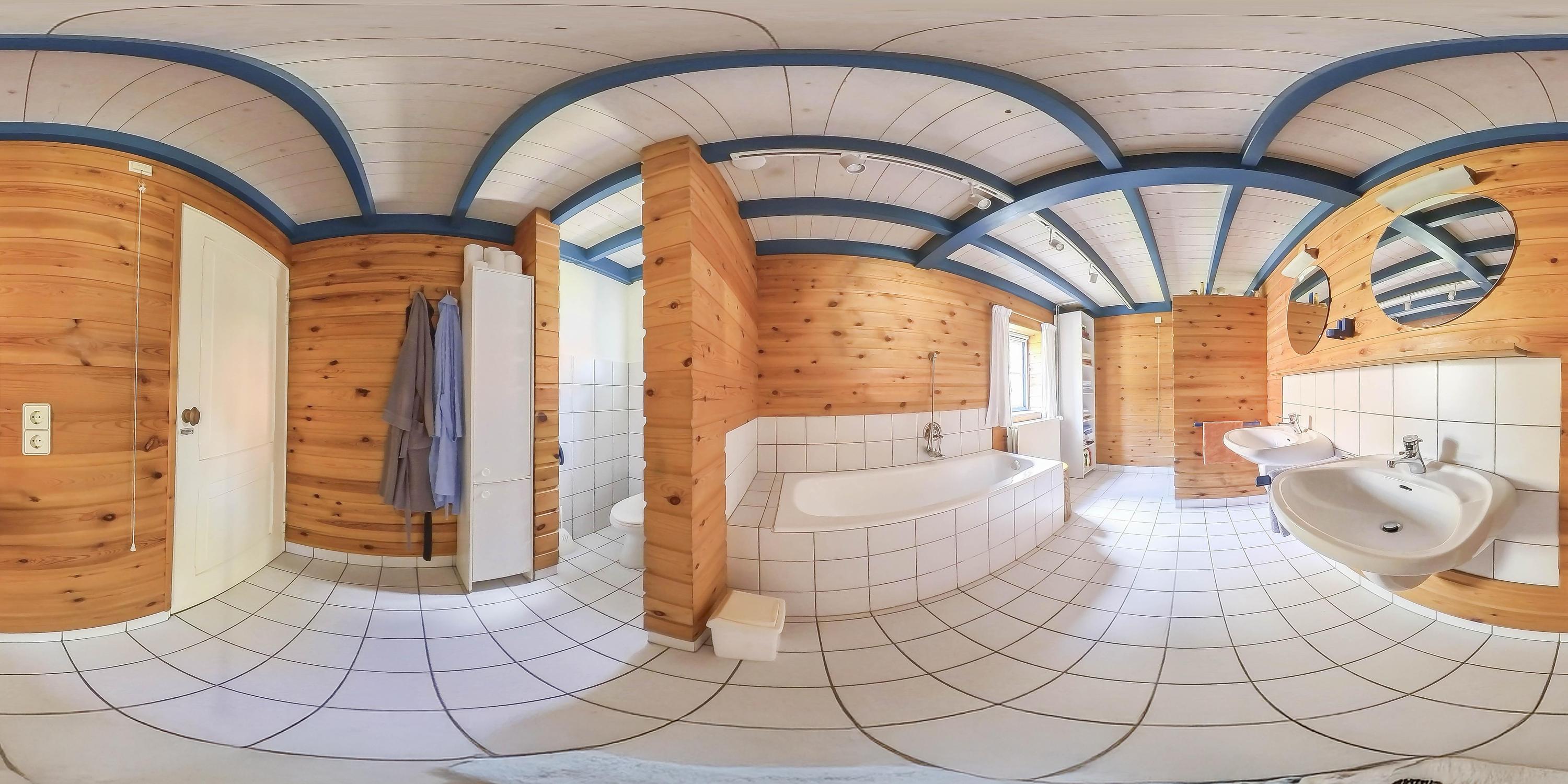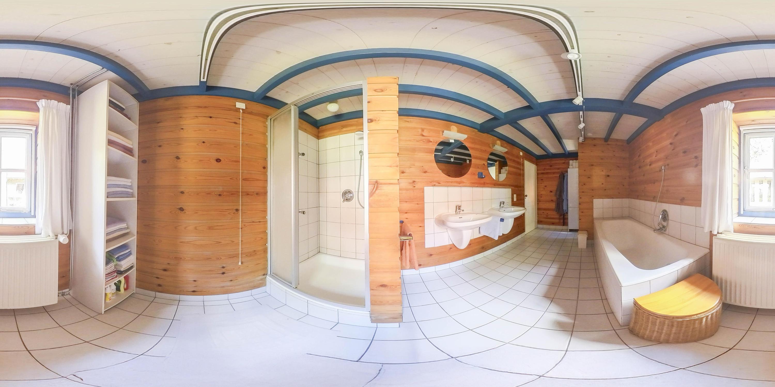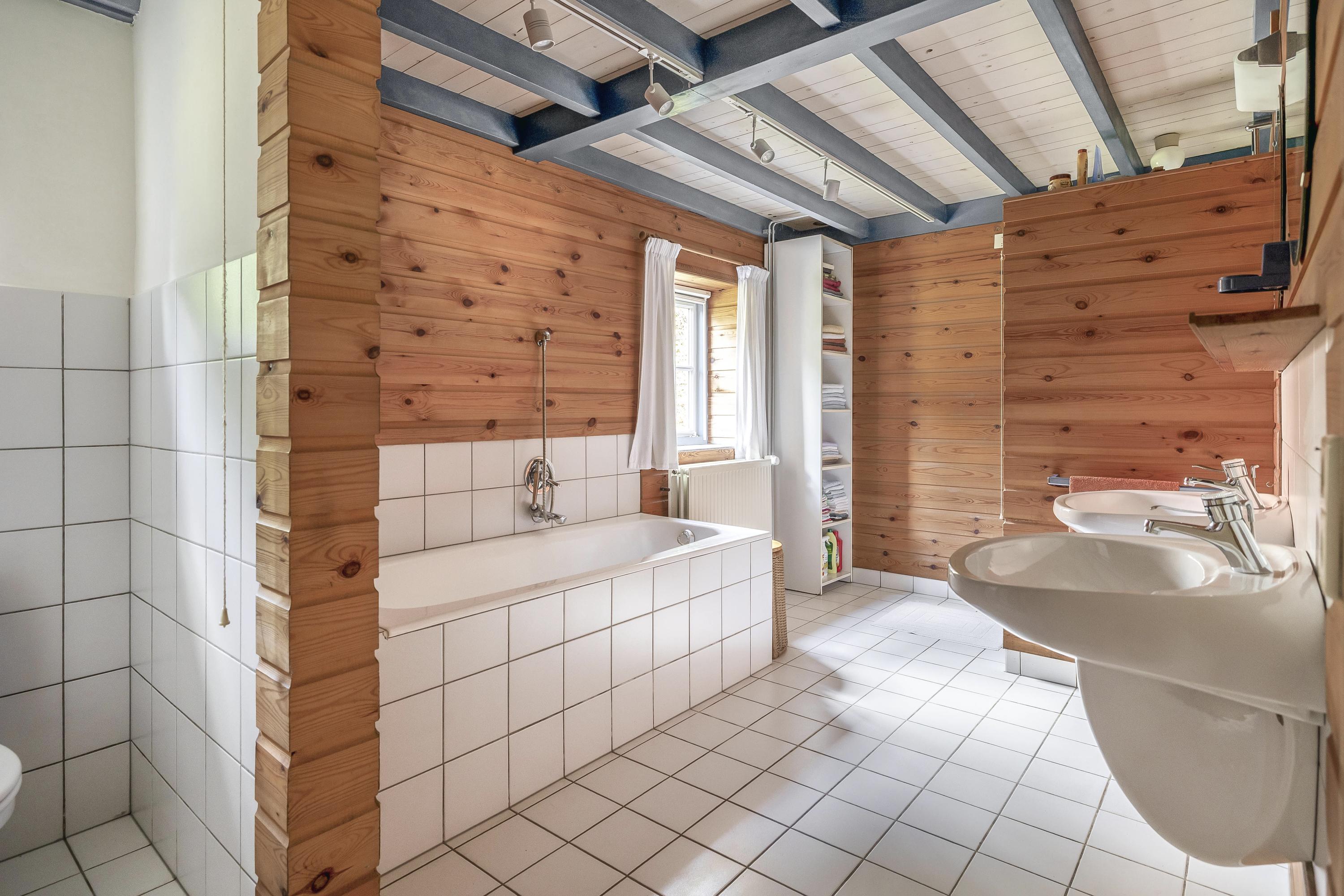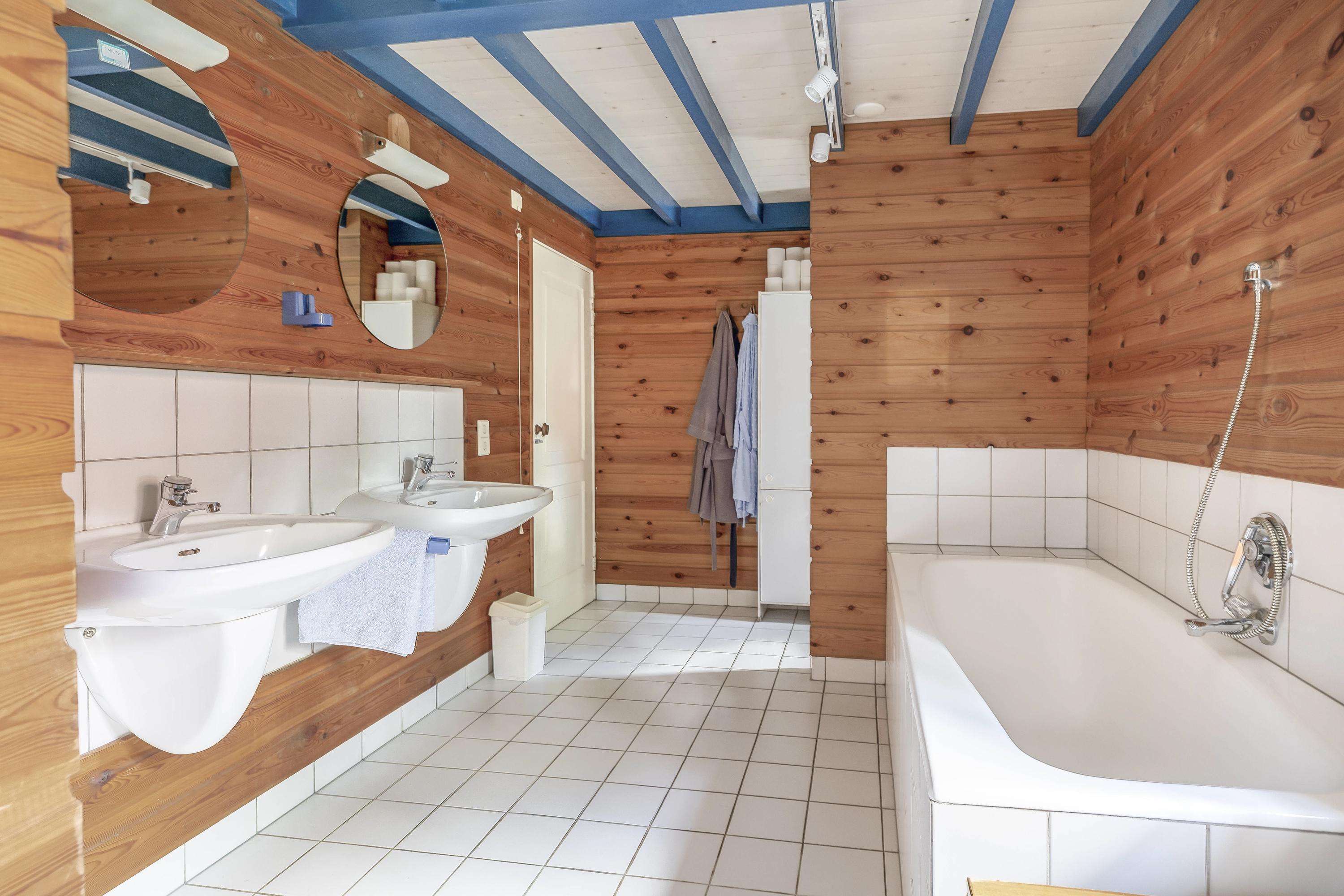The bathroom on the ground floor is partially tiled and fully equipped with a bathtub, shower cabin with wall-mounted thermostatic tap and side jets, two fixed washbasins with mixer taps, and a toilet.