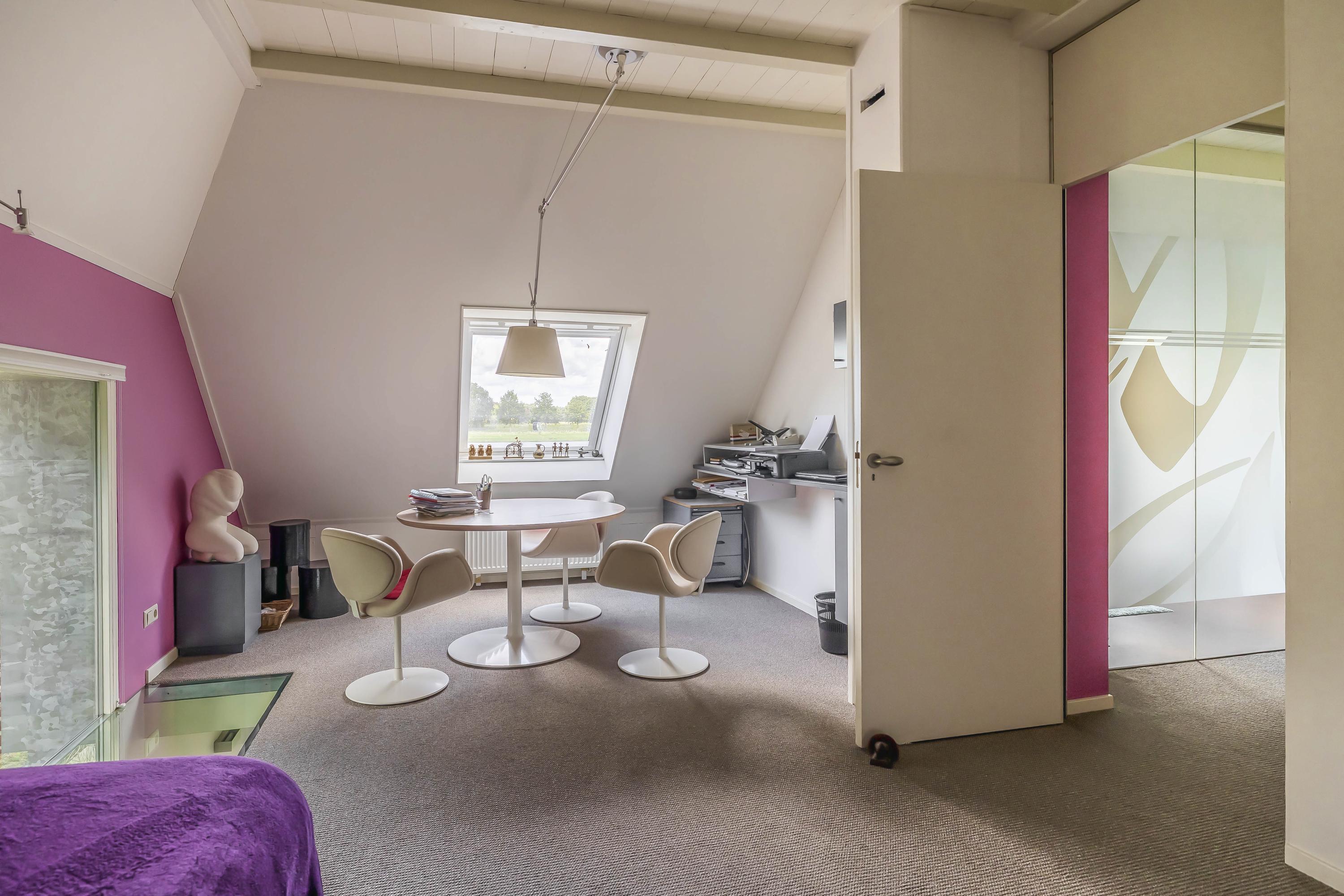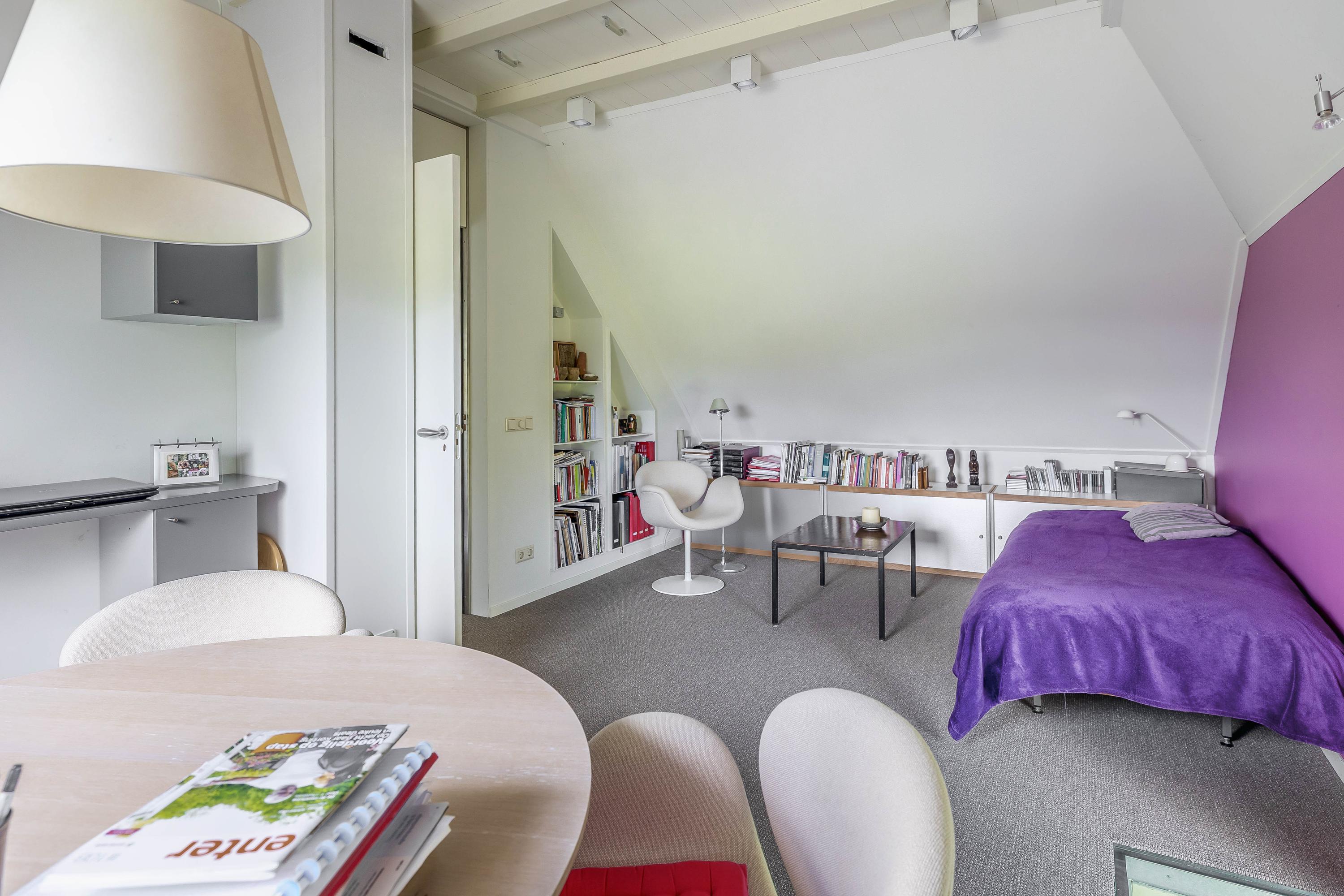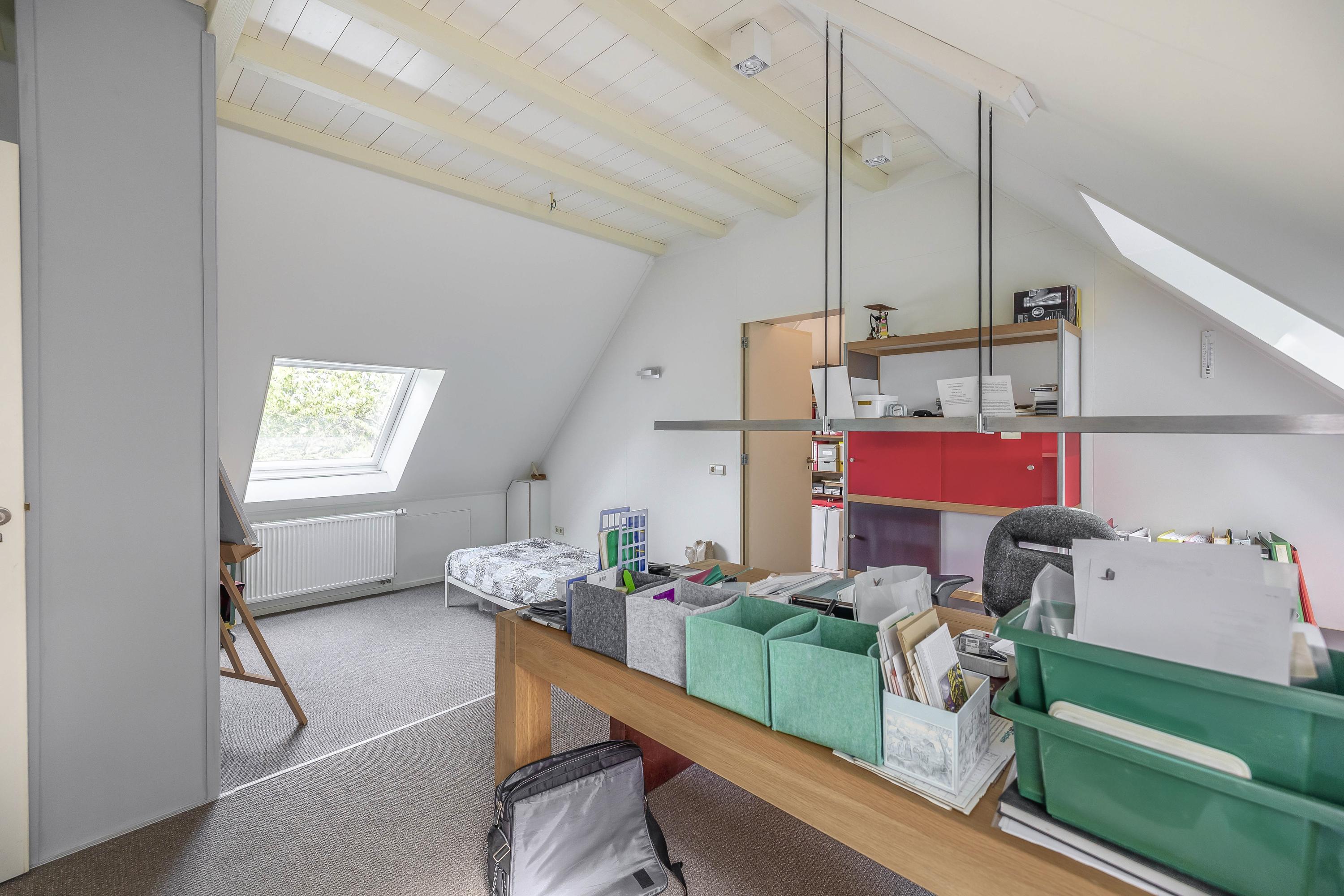 In addition, there is a large attic floor, which can be freely divided into extra rooms. This spacious room has three large skylights (one at the rear, two at the front). The Nefit central heating combi boiler (built in 2012) is also located here. A fixed staircase leads from this space to the garage. The entire floor offers plenty of potential for your living requirements and the creation of extra room(s).