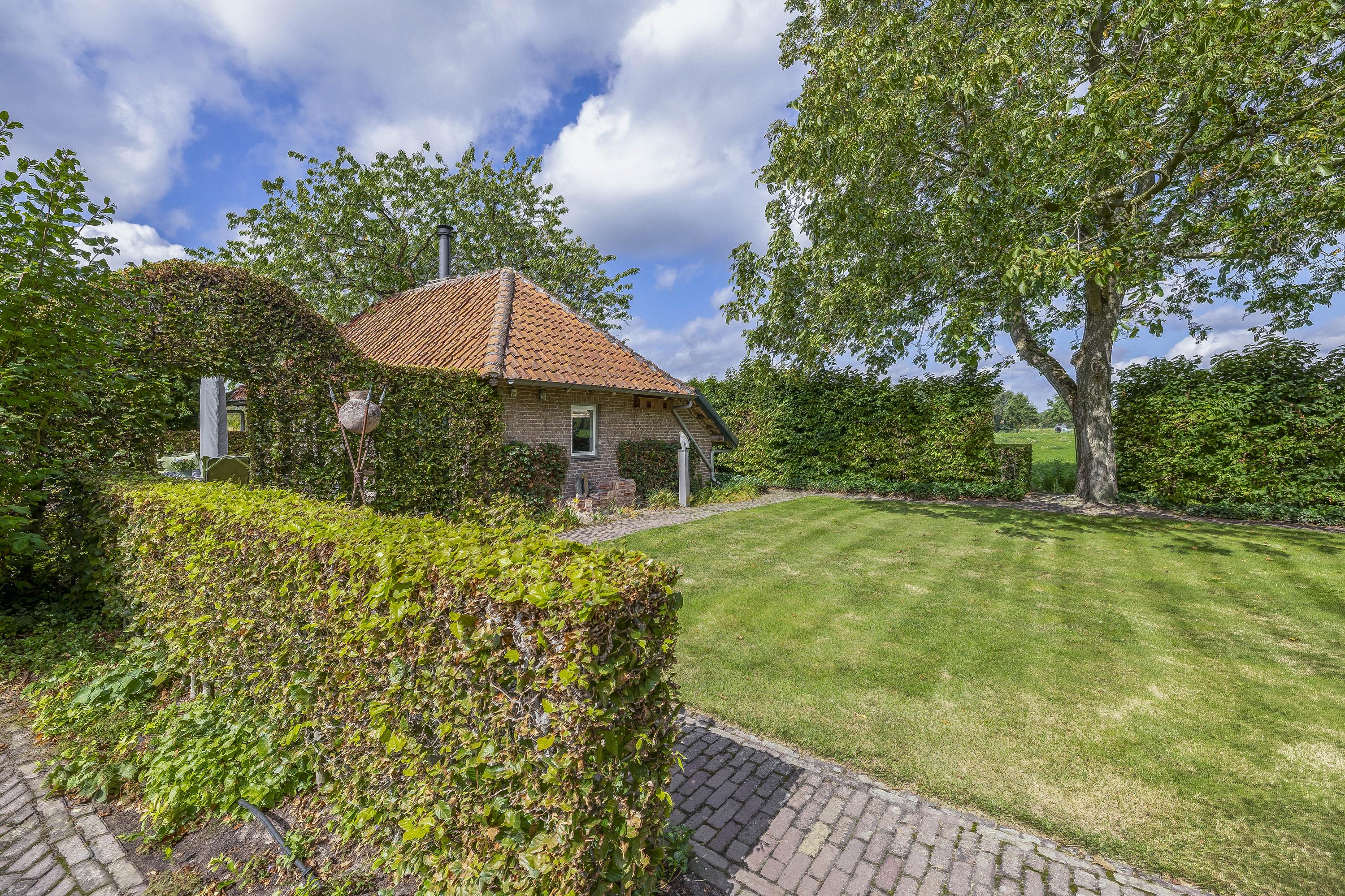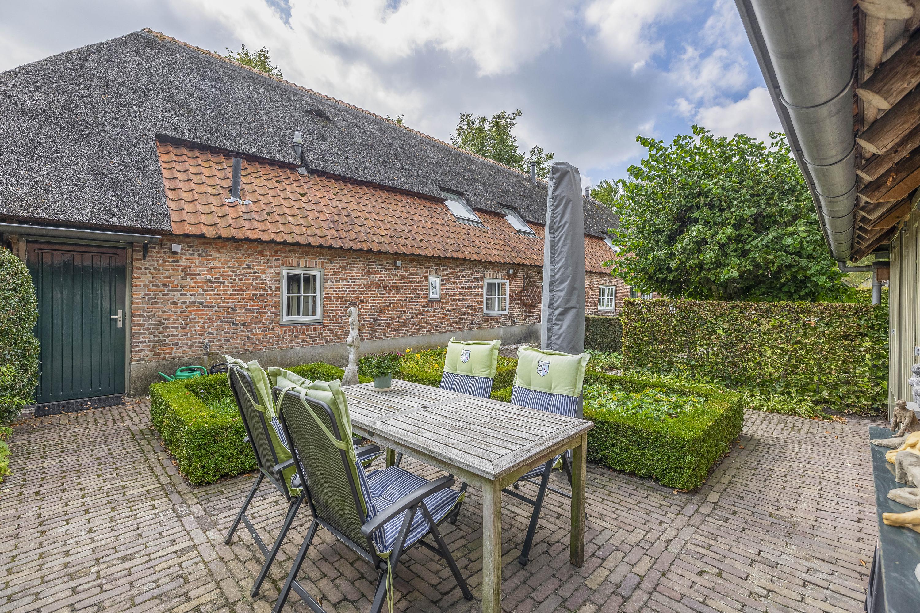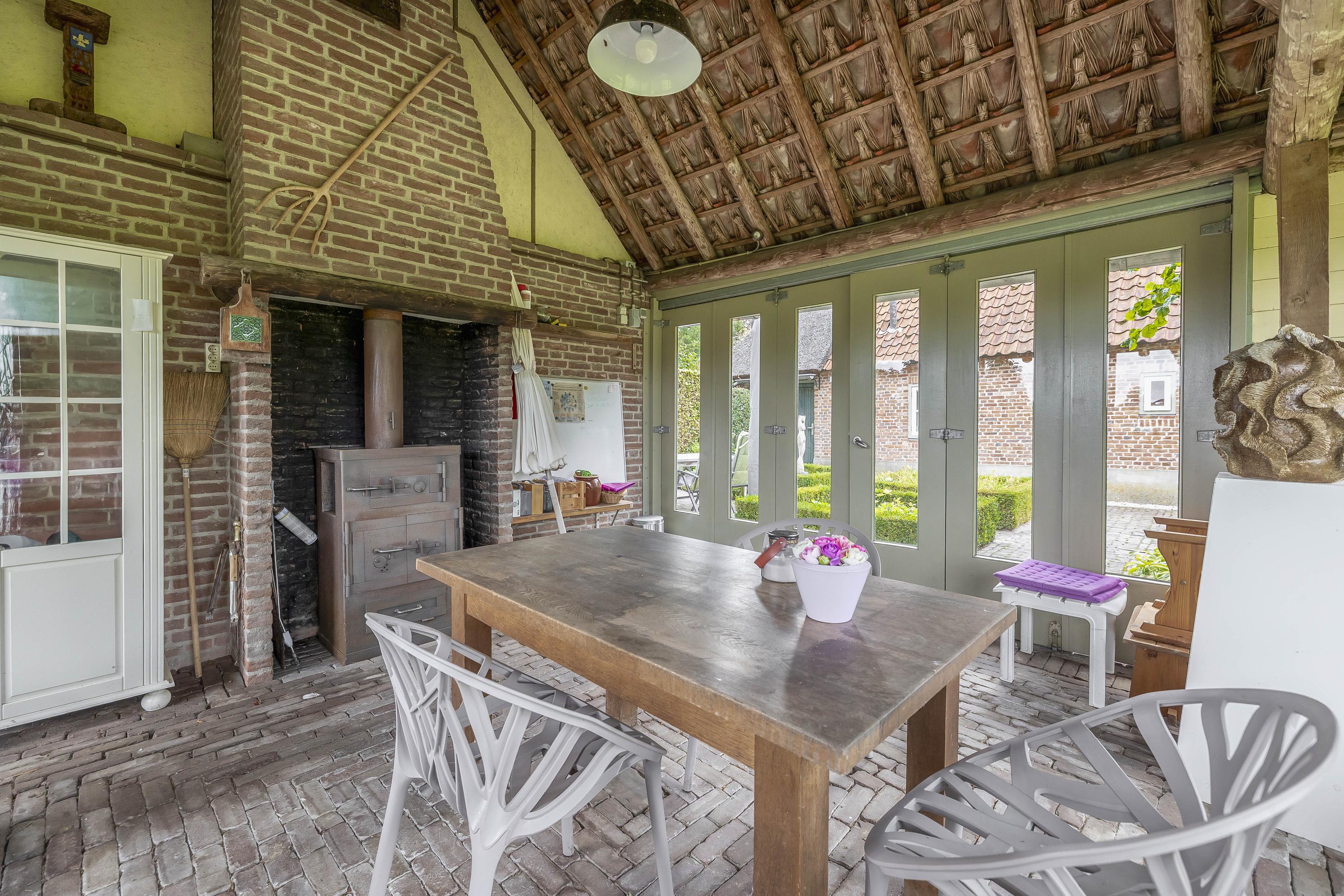 To the right of the farmhouse, you will find a second, large outbuilding in different segments: a detached double garage with storage room. This is accessible via a double gate from the driveway at the front and offers parking space for two cars. The outbuilding consists of two garage sections, equipped with two double doors, two large skylights, a concrete floor, and electrical facilities. It is a beautiful wooden barn with old wooden trusses, equipped with roof, cavity, and floor insulation and a wood-burning stove. The rightmost part of this outbuilding is another storage room. This storage area is also accessible via double doors at the front and also has a concrete floor and electricity. To the right of the barn, there is another wood storage area.