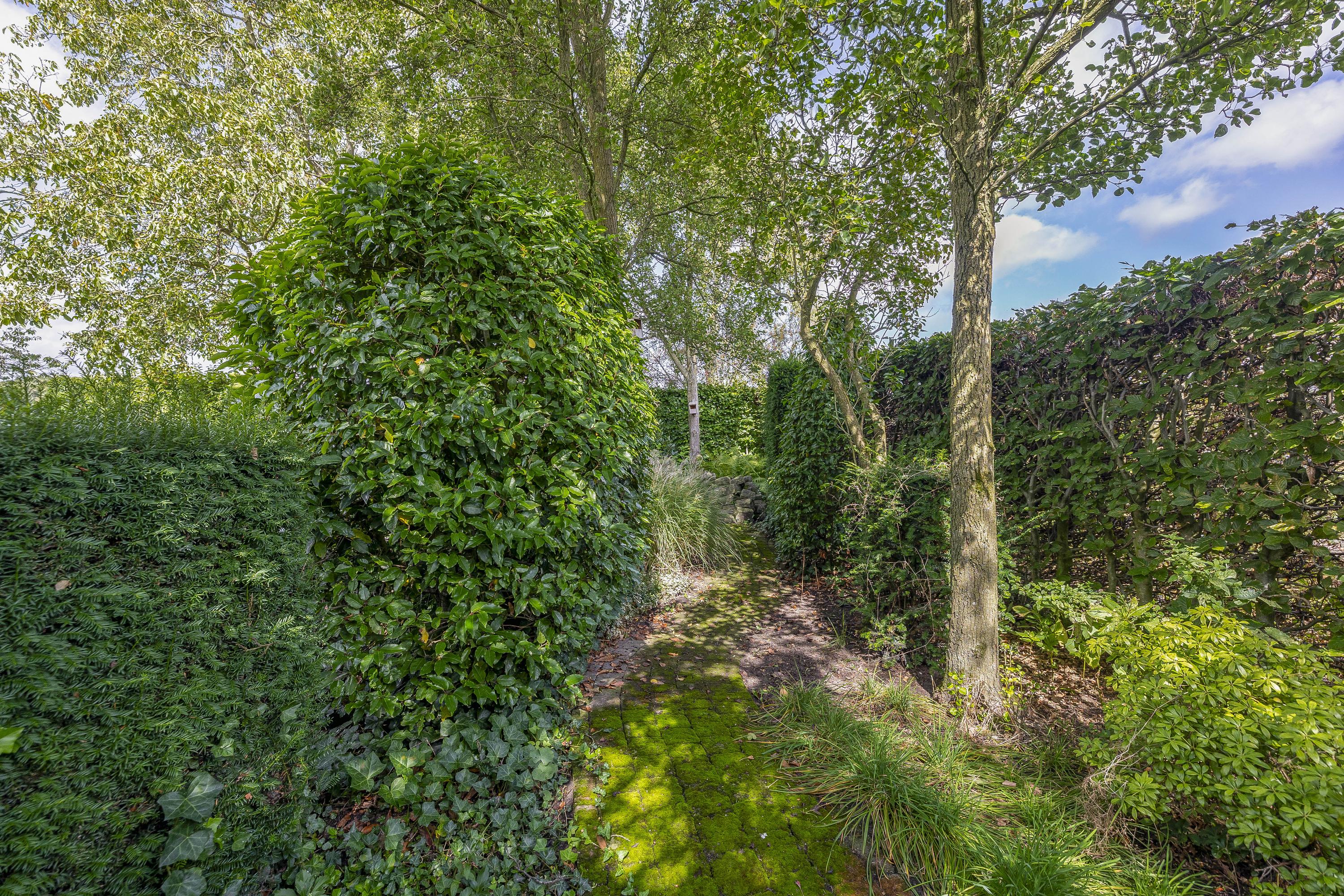 Behind the house and on the sides is a beautifully landscaped garden. On the left side is a nice, spacious area with a lawn, plant borders, old baked clinker paving, and various beech hedges. At the rear, you can enjoy a beautiful view, a large pond (with biological filter), a spacious lawn, plant borders, and mature vegetation. The garden is well laid out and well maintained. There is a double driveway on the right side of the property. The garden even offers the possibility of keeping small animals. There is also a section of the garden with a “lovers' lane.” To the left of the house is a landscaped jeu-de-boules court.