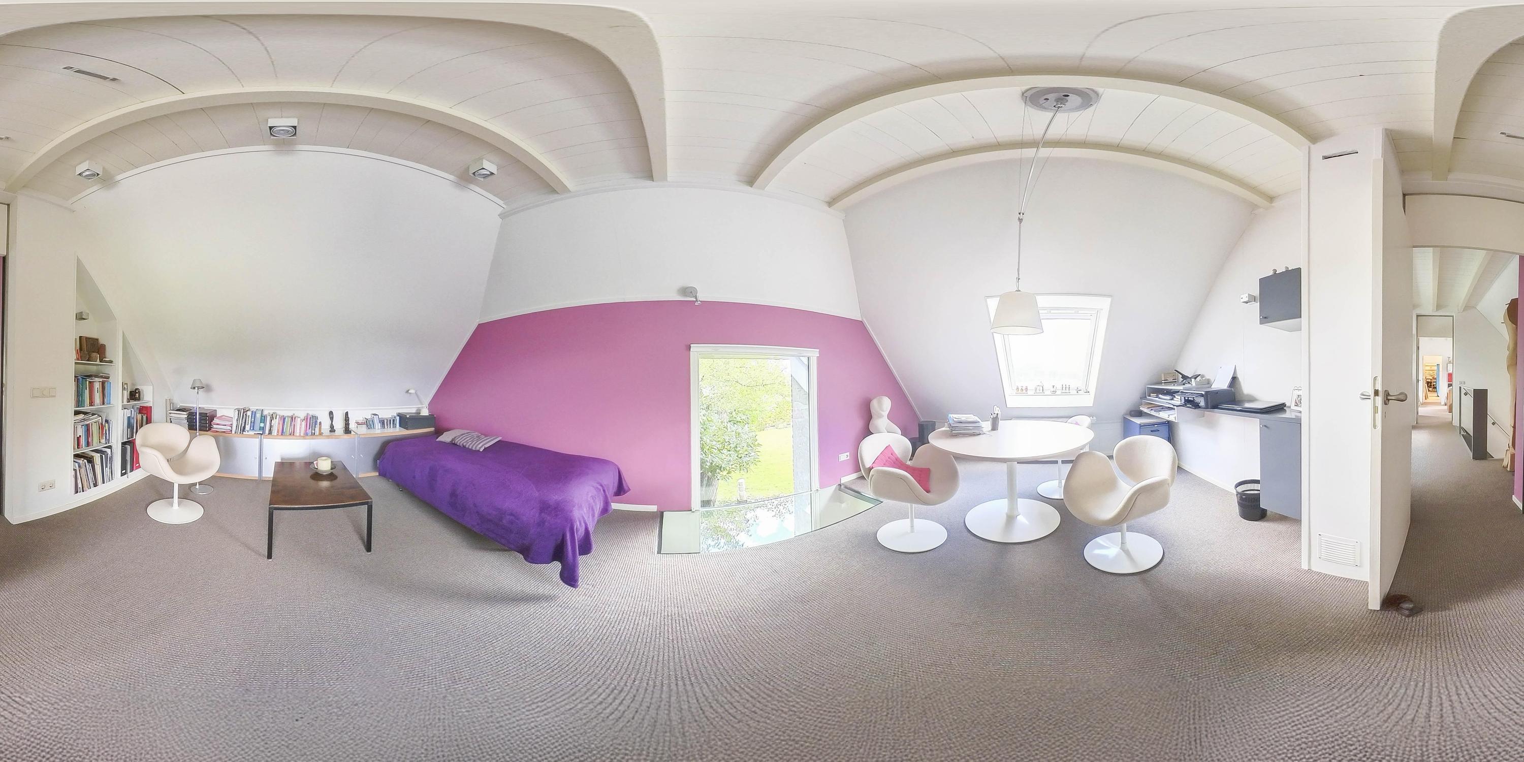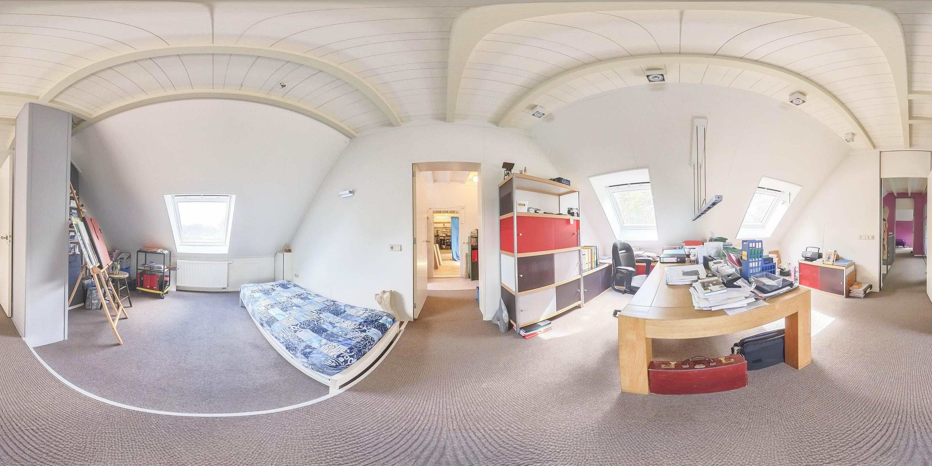 Adjacent to these two rooms on this floor is a connecting room, which could also be used as an extra bedroom or home office. This room has carpeted floors, plasterboard ceiling finish, and a large Velux skylight with blackout blinds.