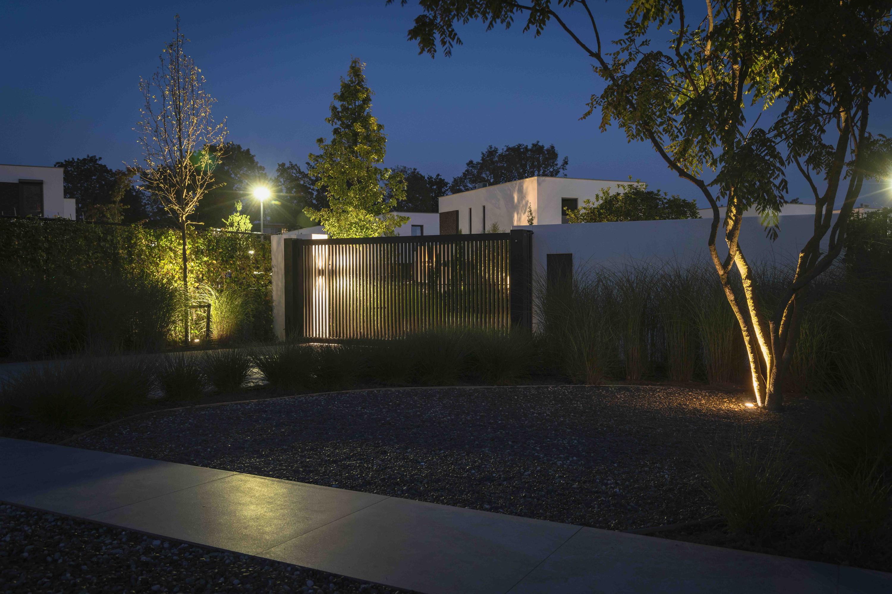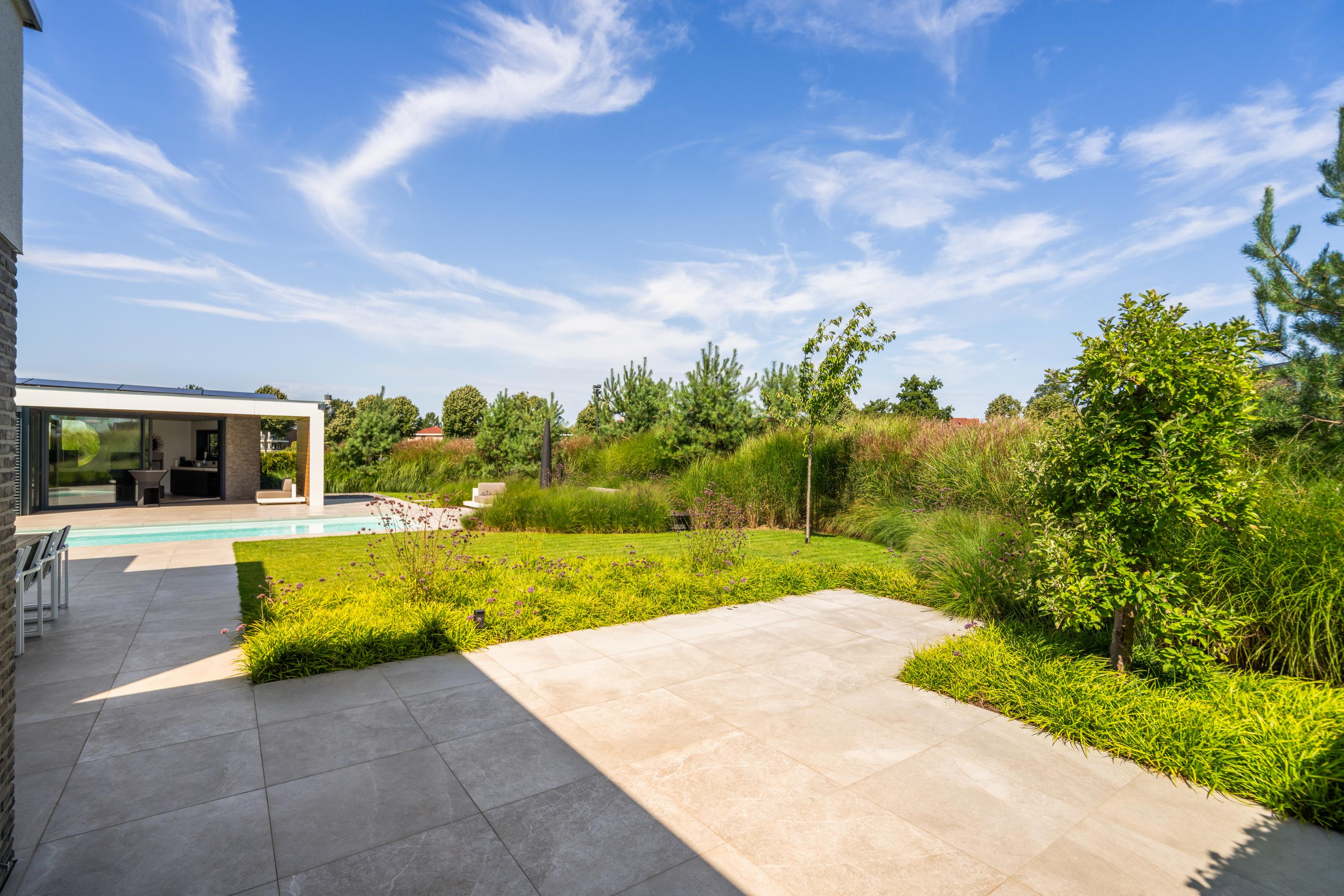 Multiple terraces invite you to enjoy long dinners, drinks, or peaceful moments in the sun. The garden features lawn, gravel, and various plantings — a perfect balance between greenery and the modern character of the home.