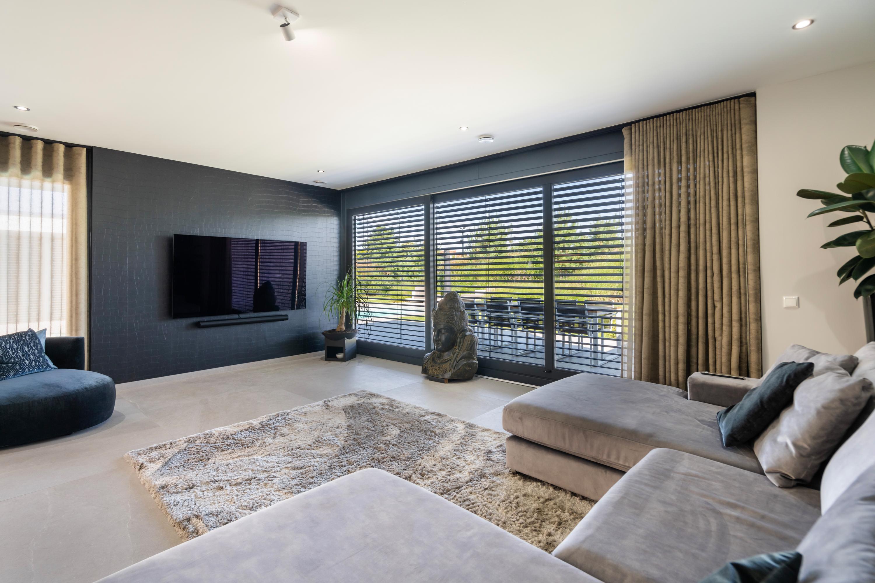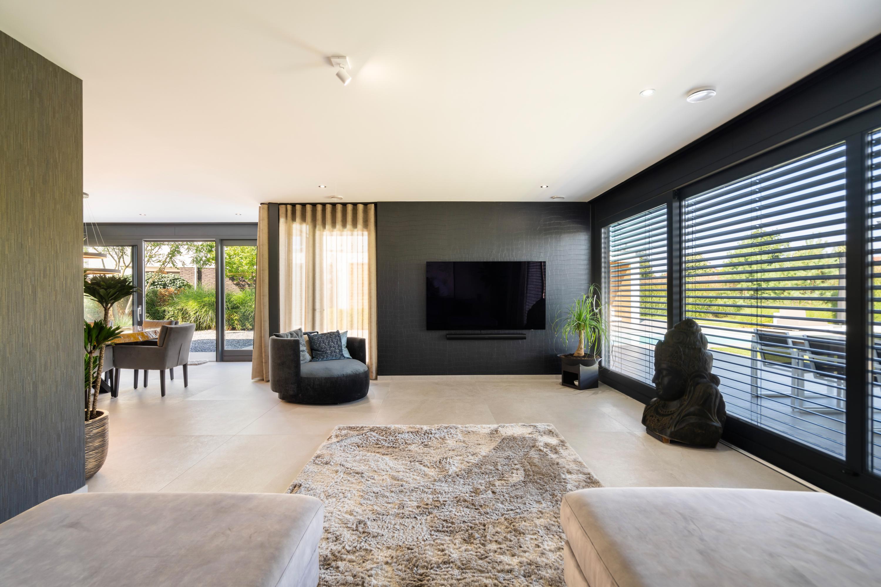 At the front, the villa is embraced by a generous garden that immediately sets the tone for the exclusive character of the property. The carefully designed combination of modern paving and green borders creates a harmonious and refined whole. The private driveway, finished with high?quality tiles and subtle greenery, leads you stylishly to the entrance.