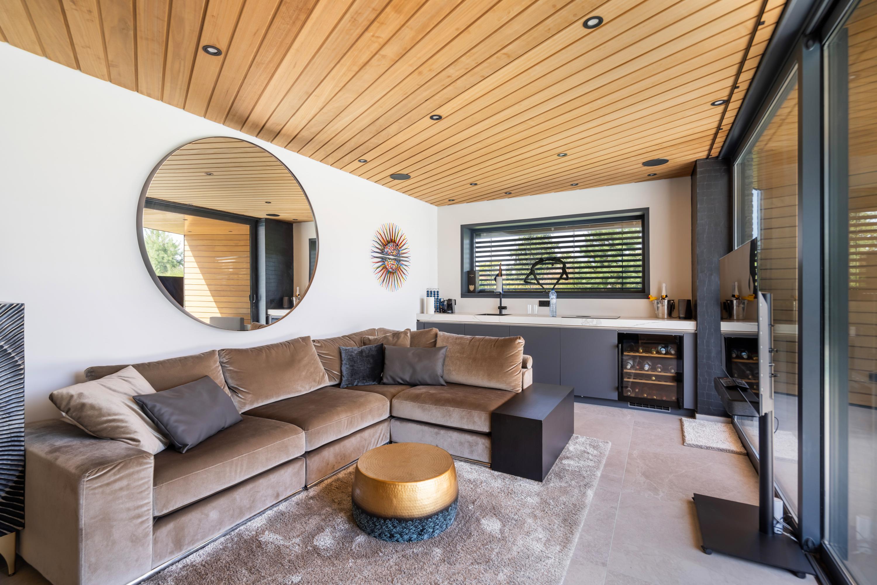 The pool house is equipped with a kitchenette with sink, wine climate cabinet, refrigerator, induction hob with Bora extraction, and various storage cabinets. Built?in speakers and lighting are also present. Outside, you will find an outdoor shower with thermostatic tap. A separate room houses all technical installations.