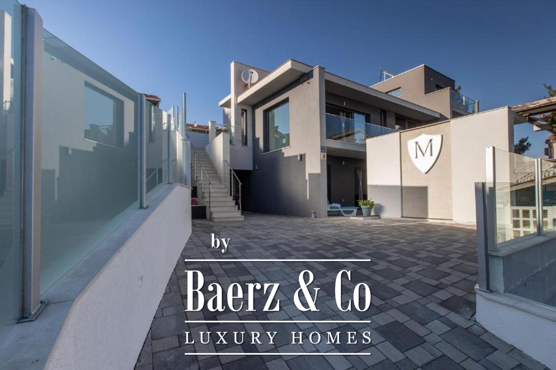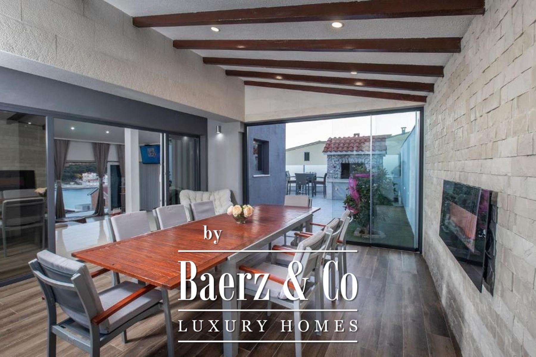 The upper level presents a luminous living space with a kitchen and dining area, two bedrooms, and two bathrooms, with each main room connecting to balconies oriented towards sea and pool views. Flexibility is integral, as the first floor can be separated into independent apartments to suit a range of lifestyles or hospitality needs. Refined finishes and premium furnishings underscore every detail, while thoughtful amenities include a tavern with barbecue, an inviting space for dining and gathering, and a sunlit yard. Three parking spaces complete the picture of relaxation and opportunity in Croatia’s coastal landscape.