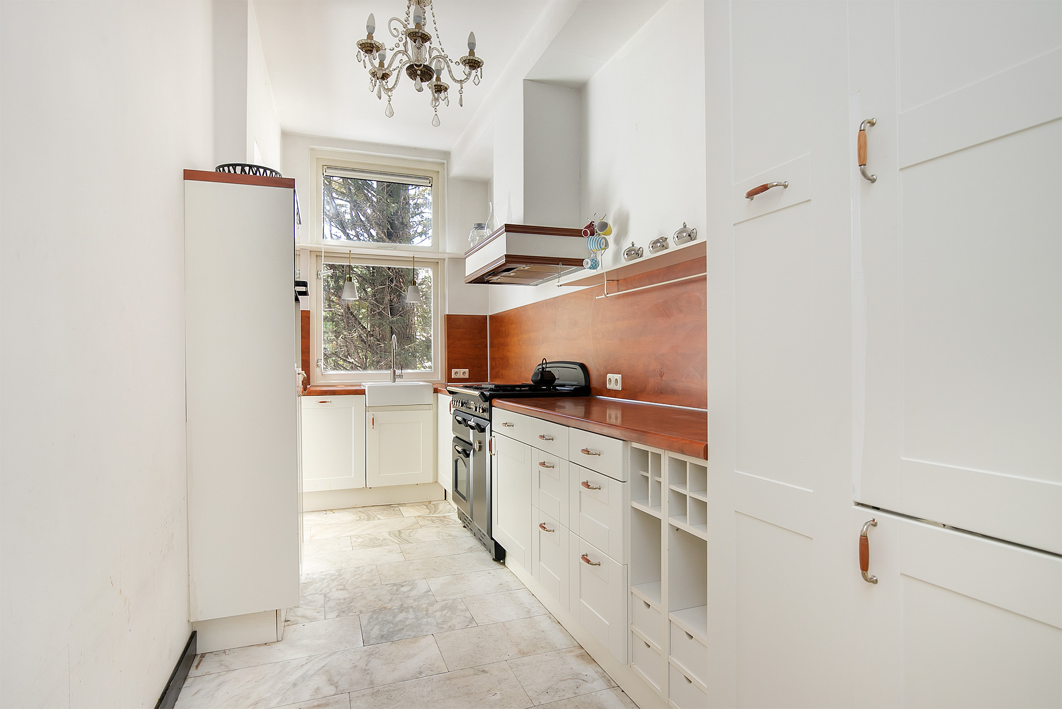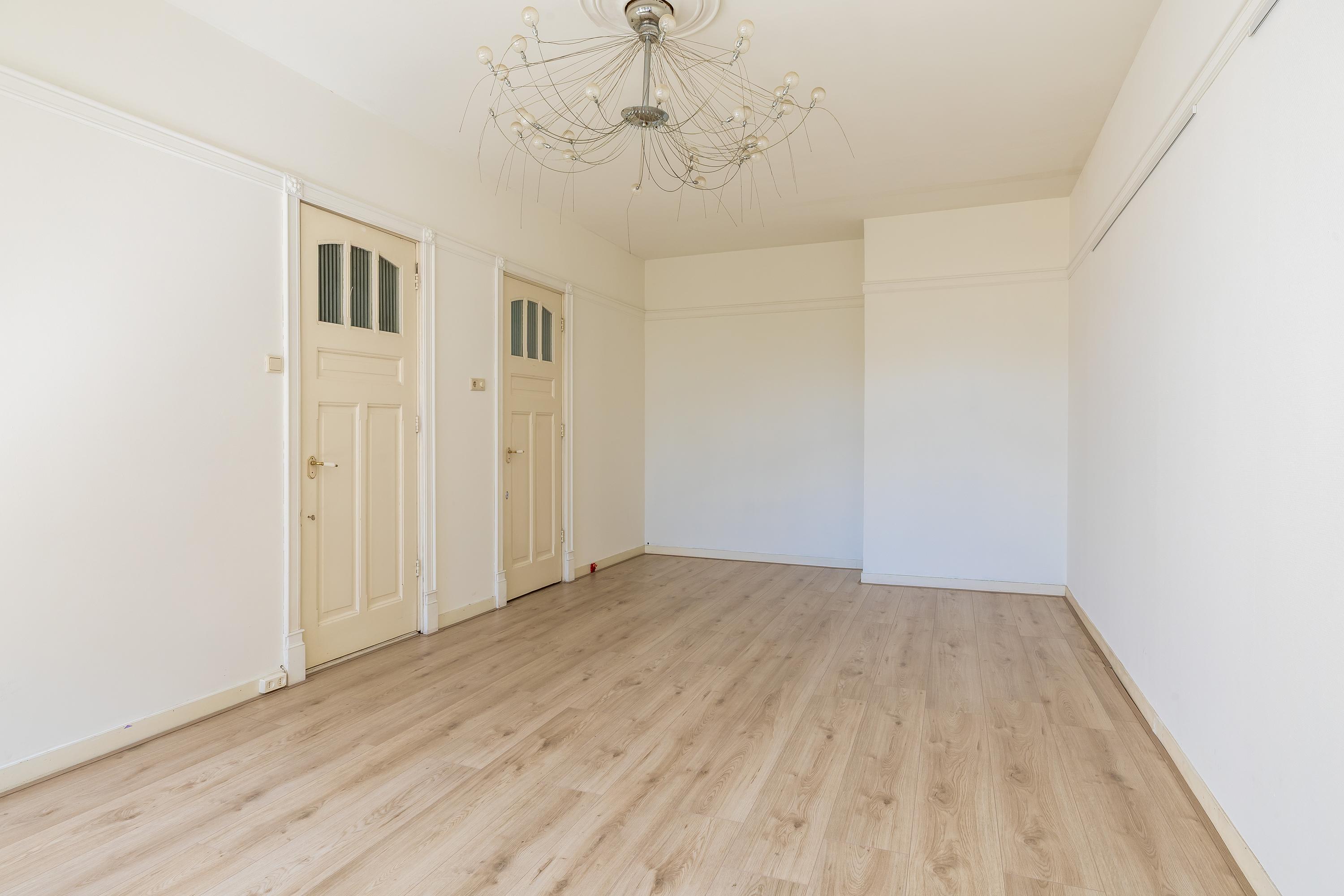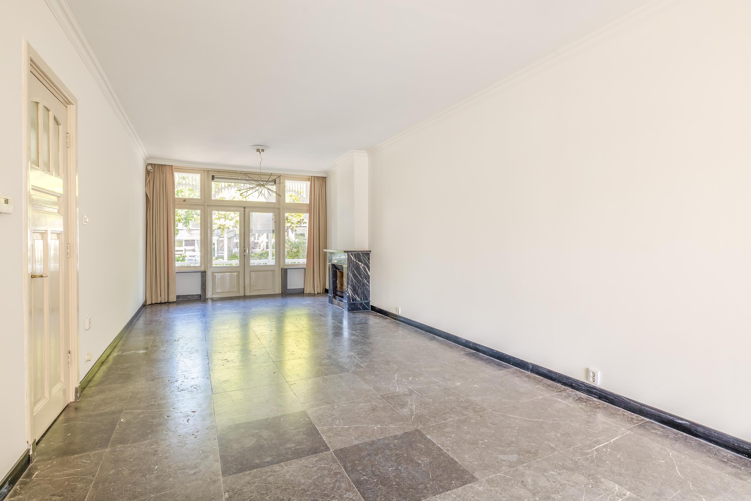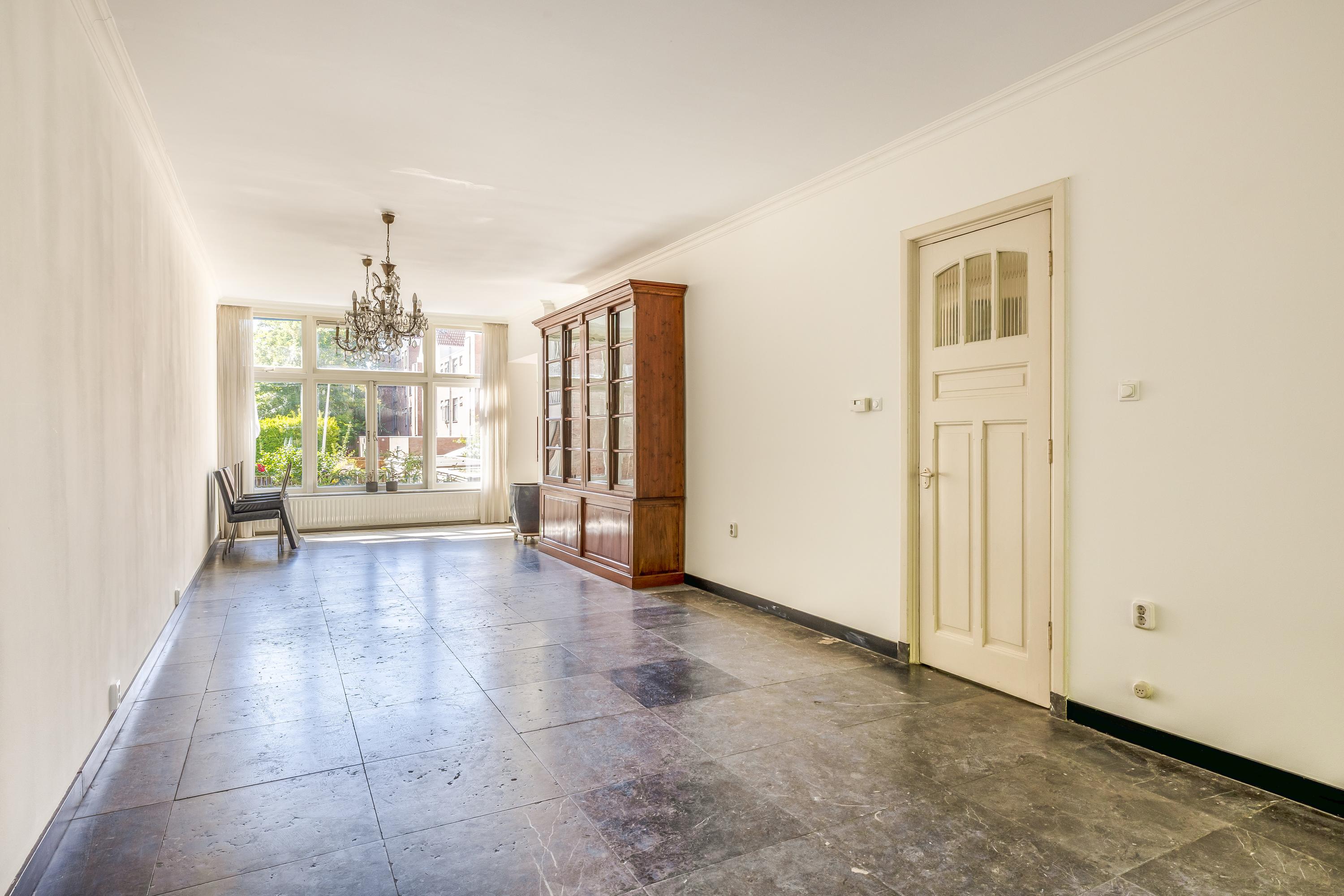 Bij binnenkomst kom je in de imposante entree met marmeren tegels. Vanuit hier is de lange hal met toilet en trapkast toegankelijk, die het leefgedeelte verbindt. Direct valt de hoogte van de plafonds op. De woonkamer van 14 meter lang is momenteel ingedeeld in een zitgedeelte aan de voorzijde en een eetgedeelte aan de achterzijde, met toegang tot de halfopen keuken. Door de ruime indeling heb je voldoende mogelijkheden om de ruimte helemaal naar eigen smaak in te richten. Voorheen was het souterrain bereikbaar via een trap in de eetkamer, maar het is ook mogelijk om deze verbinding opnieuw te realiseren. De keuken is uitgerust met een 5-pits gasfornuis met oven, afzuigkap, vaatwasser, spoelbak en koel-vriescombinatie. Dit is een heerlijke plek waar je tijdens het koken interactie kunt hebben met je gezelschap.