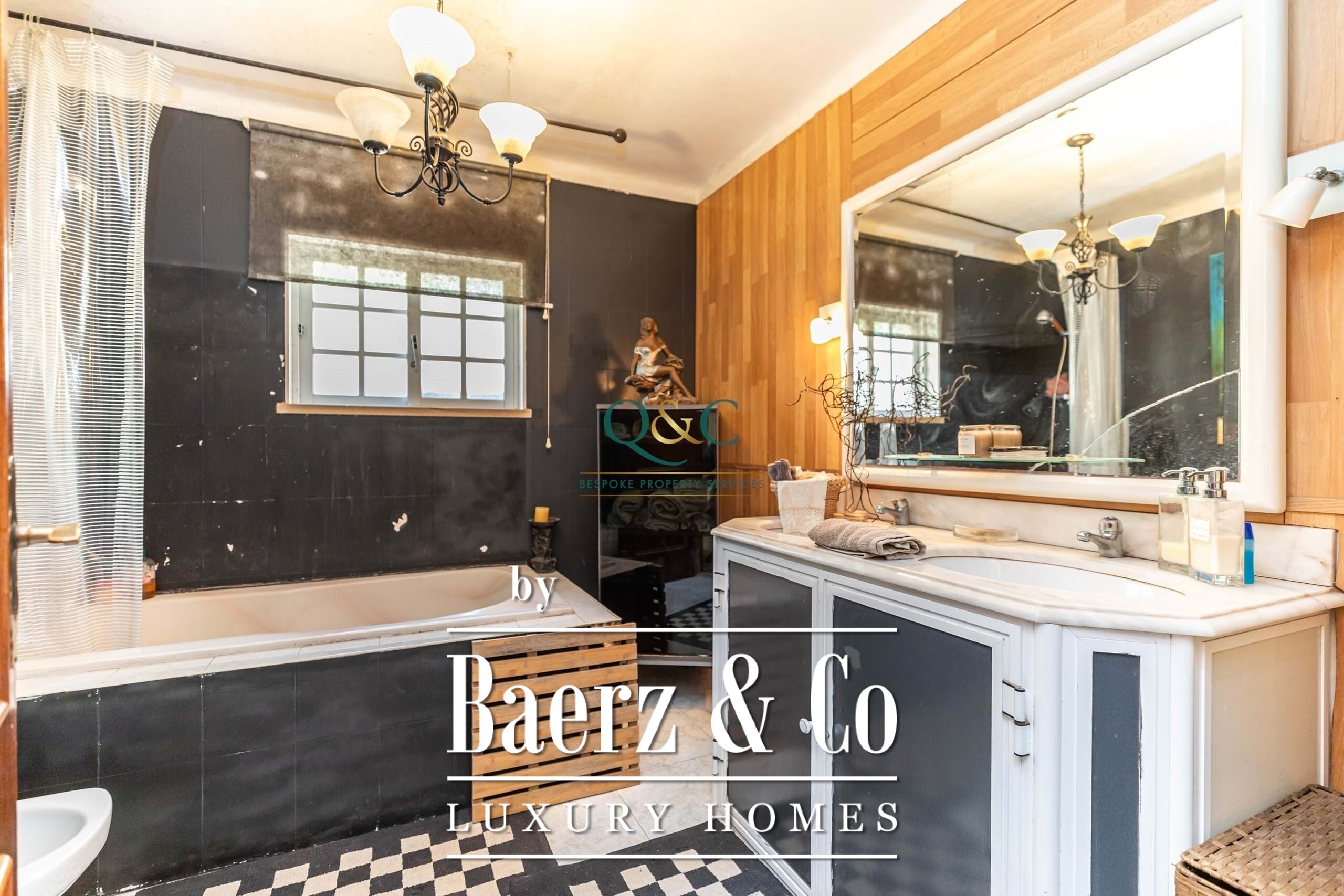 Set behind electric gates, the fully enclosed gardens provide a variety of inviting spaces for both relaxation and entertaining. From the driveway with ample parking, steps lead up to a covered main terrace and double doors opening into a grand entrance hall. This flows into a bright sitting room with fireplace and sliding doors back onto the terrace, as well as a semi-open dining room. A sweeping staircase adds a touch of grandeur, leading to the upper floor.