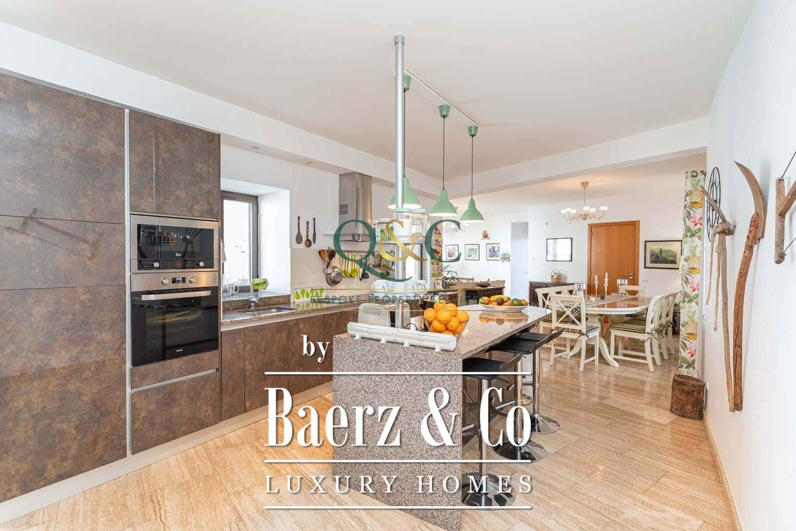 A calcada driveway introduces the estate, leading to a spacious garage and practical utility area that connects to the heart of the home—the equipped kitchen and dining area. The main reception hall welcomes light and garden views, flowing seamlessly to living and entertaining spaces. The principal suite, framed by dual garden aspects, includes an en-suite with a roll-top bath and walk-in shower, establishing a private sanctuary within the home. Each of the four bedrooms features an en-suite bathroom, while a mezzanine level in one creates a retreat for work or leisure, spilling onto a sheltered roof terrace.