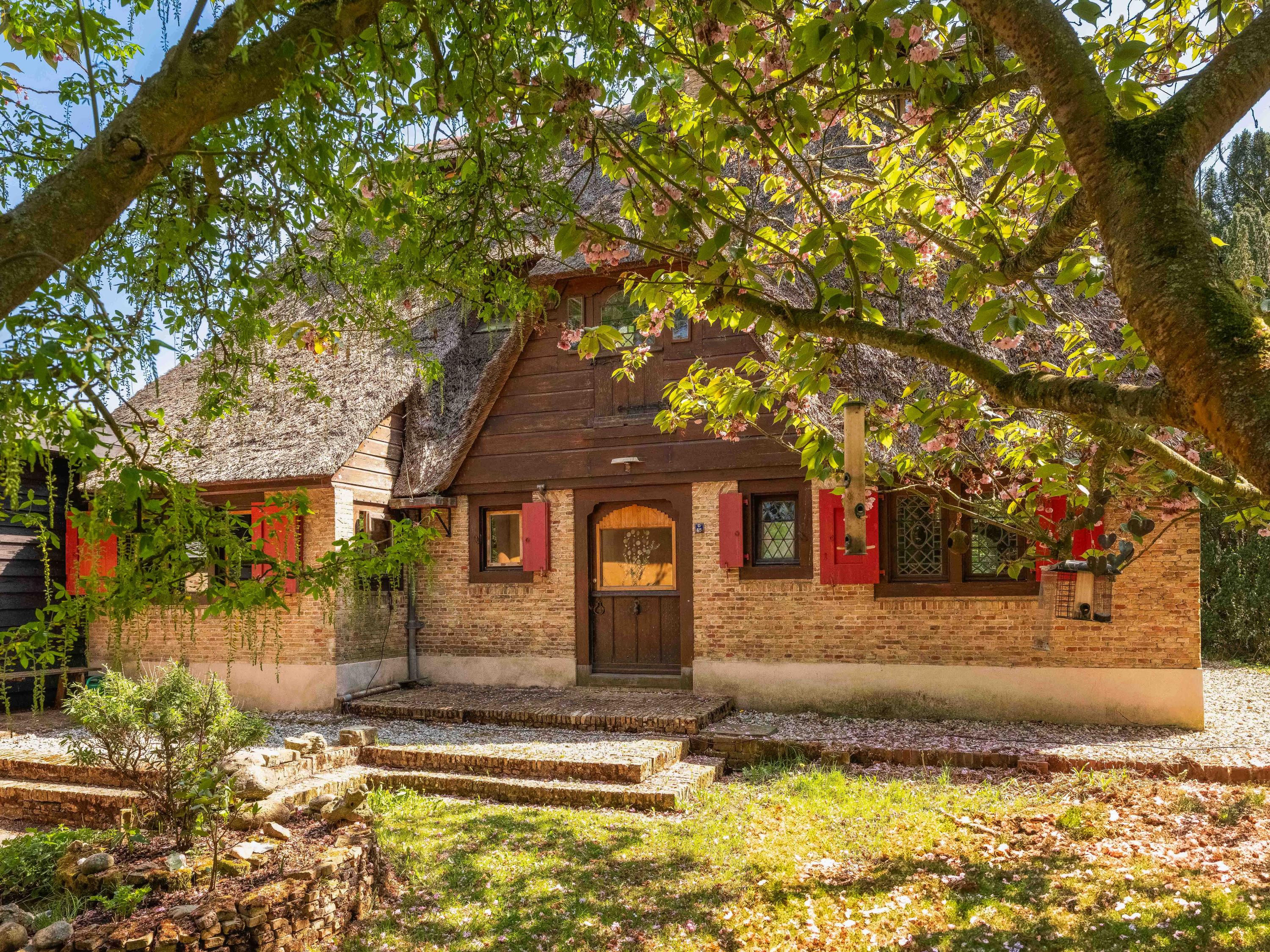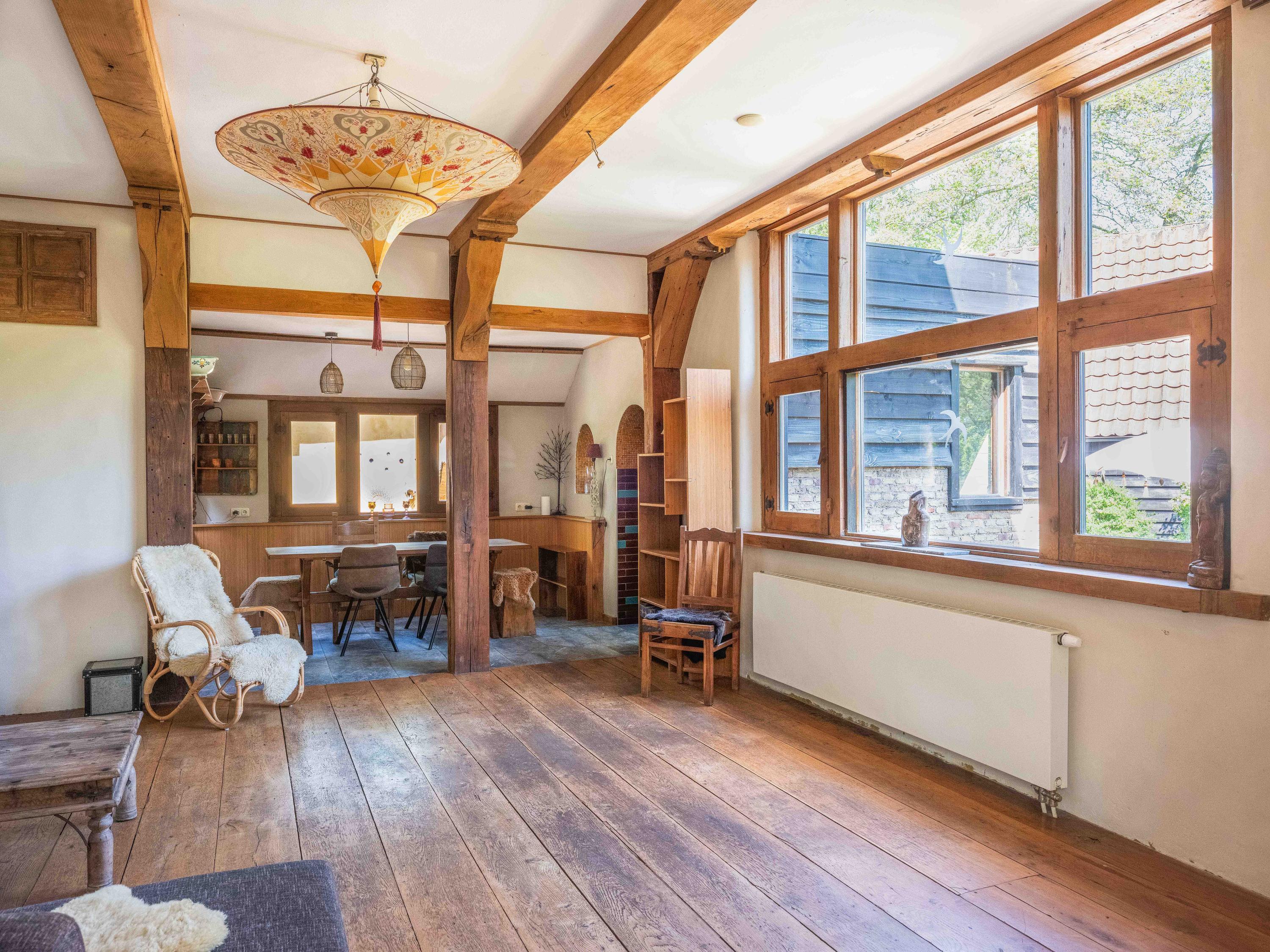 A long forest path leads you to this striking property, built in 1935 using 17th-century materials and designed by architect Royaards. The house exudes character and history: robust fireplaces – currently not functional but eligible for renovation – antique elements such as solid oak beams and floors, and clay-plastered walls that create a pleasant indoor climate and promote restful sleep. Here, you experience the luxury of silence, space, and privacy, surrounded by the scent of the forest, the gentle rustling of trees, and the songs of countless birds – this is truly a bird lover’s paradise.