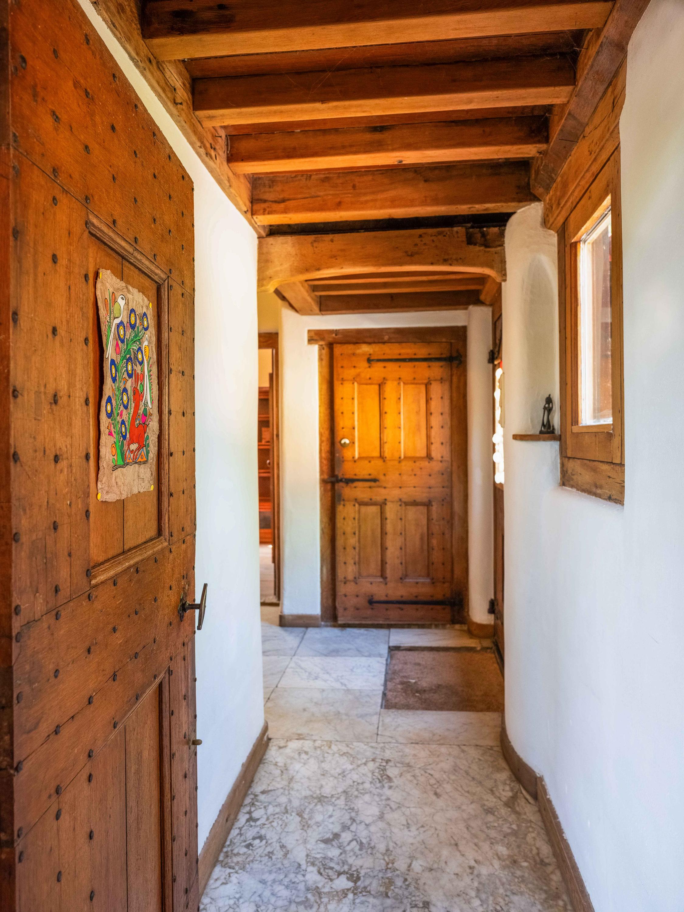 Upstairs, the spacious landing leads to two bedrooms with built-in wardrobes and a modern bathroom finished in tadelakt, complete with a toilet, bathtub, sink, and shower. It’s also wonderful to see how the original beams have been left visible, adding to the authentic atmosphere.