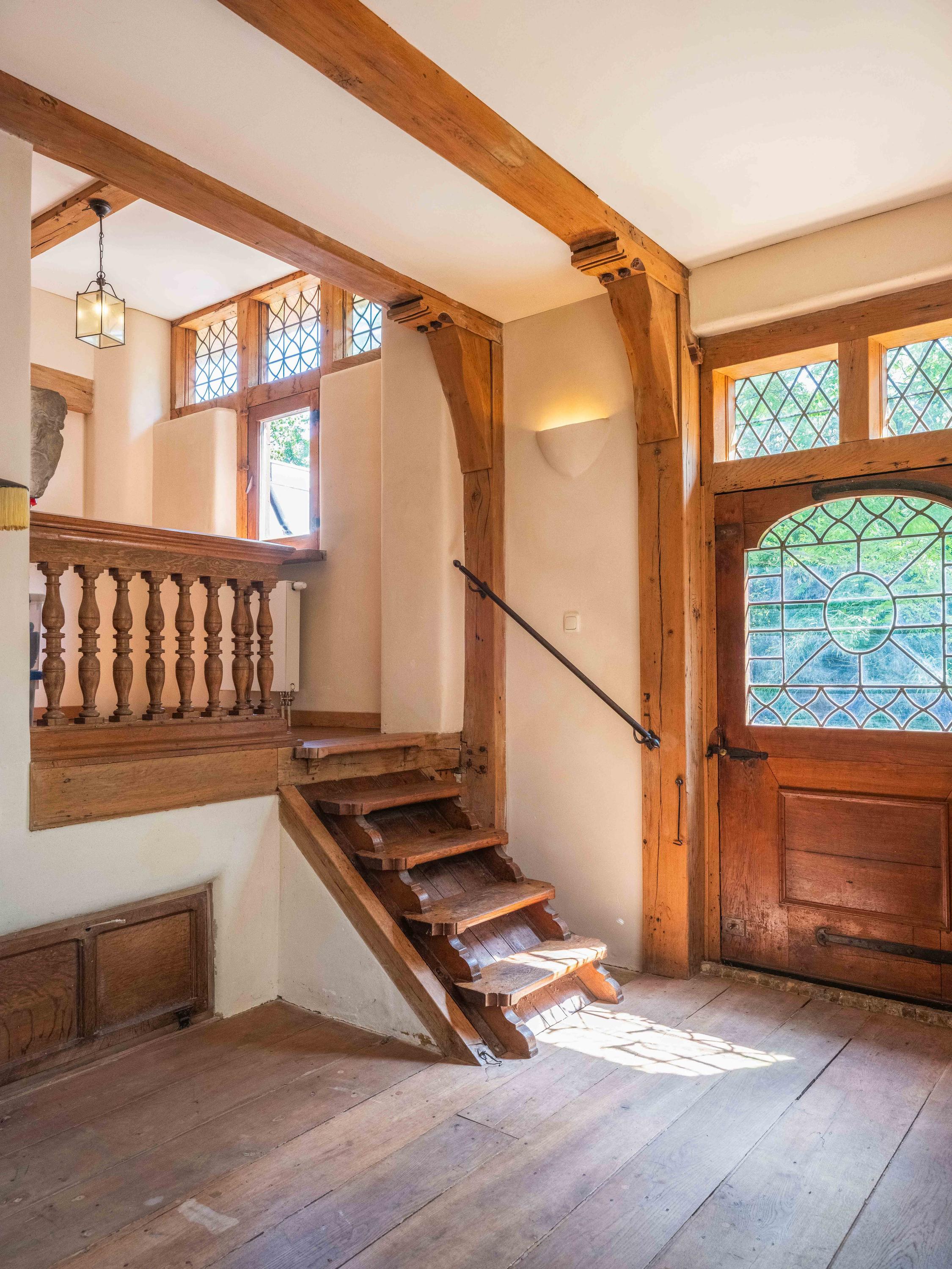 Let us take you inside the main residence. The ground floor welcomes you with a bright entrance, an open staircase, and a toilet. The kitchen, utility room, and cellar offer plenty of possibilities. The attached office is a pleasant and inspiring space. The garden-side living room features a charming fireplace, while the front living room includes a second fireplace and a raised alcove.