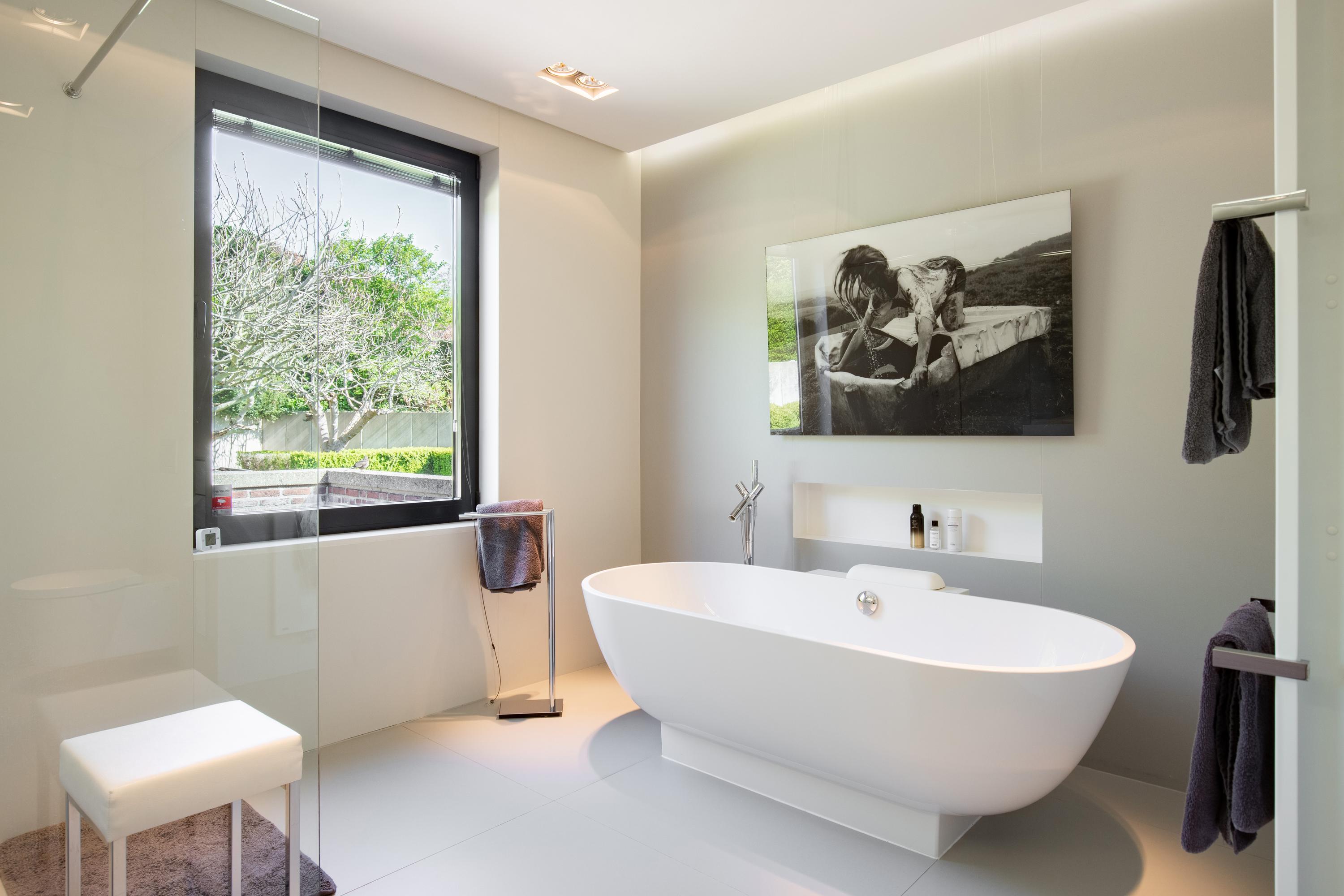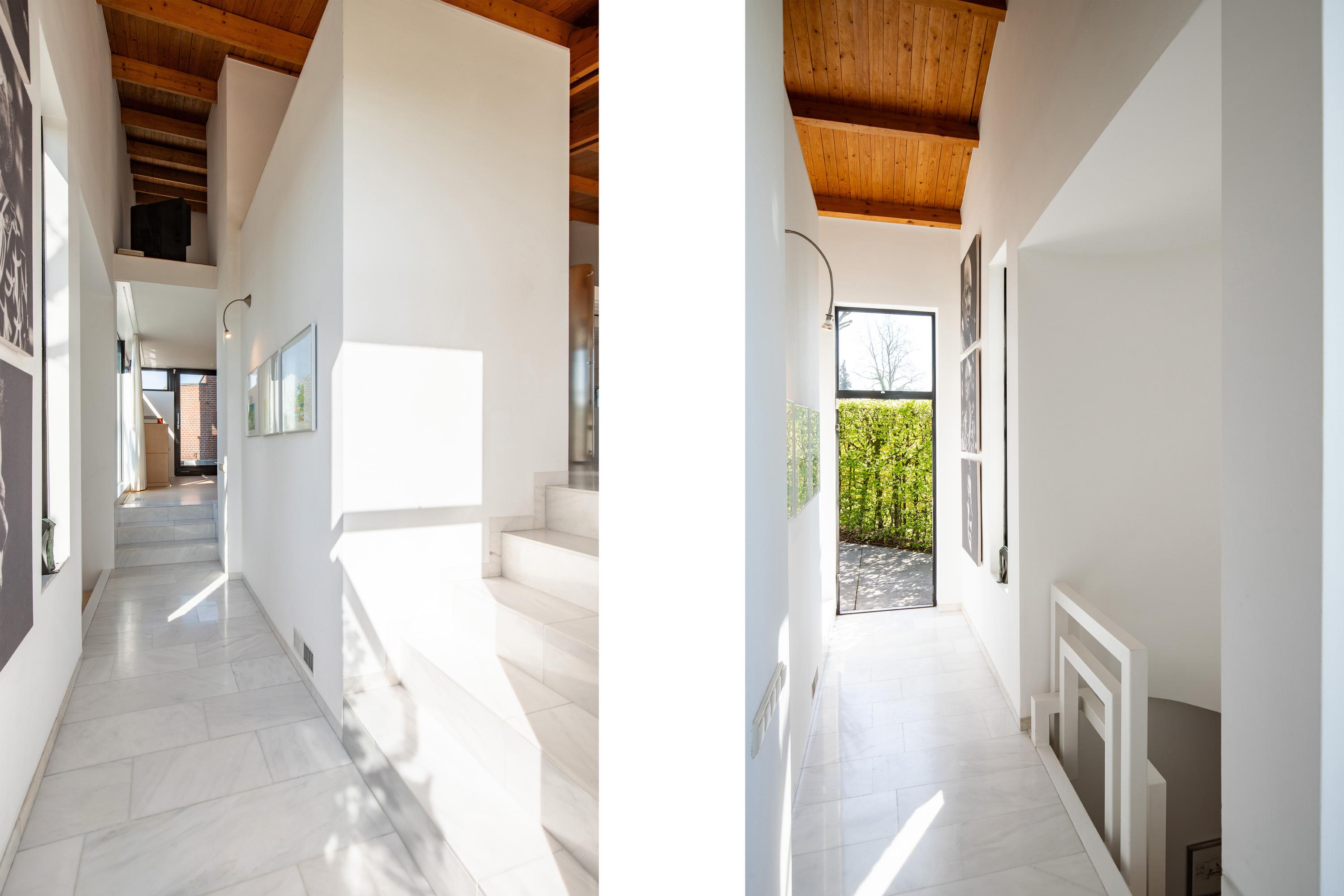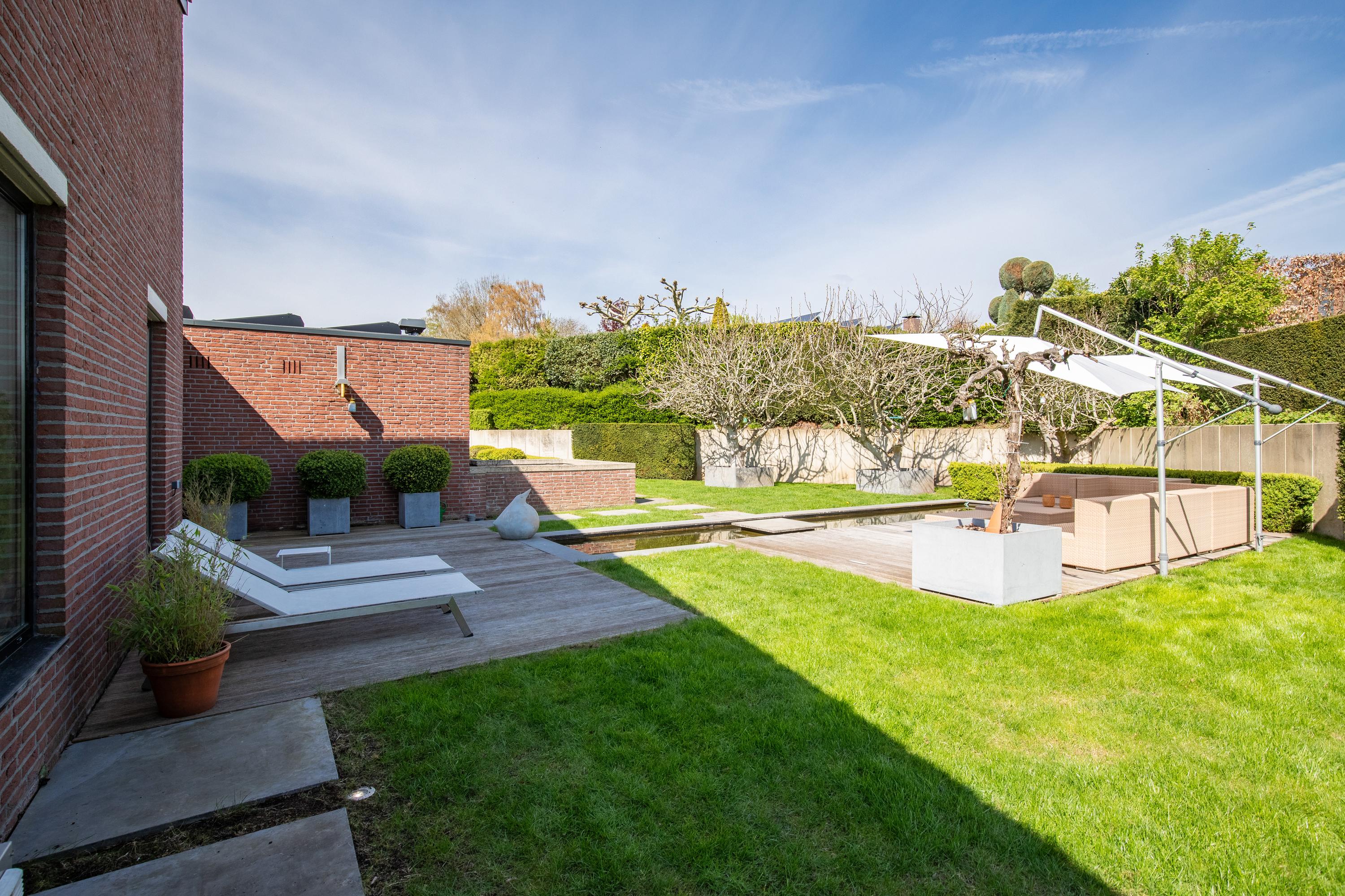 The sleeping areas are connected to the living room and kitchen via a hallway lined with windows on both sides. A beautifully tiled half-bathroom. Three bedrooms, some of which feature built-in closets. A spiral staircase leads from the master bedroom down to the pool at ground level. The tasteful and luxurious bathroom is finished with high-quality materials and accessible from the hallway. First, there is a spacious walk-in closet with built-in cabinetry, followed by access to the bathroom. This has been recently fitted with a wall-hung toilet, a walk-in shower with a tempered glass screen, a freestanding bathtub, and a bathroom vanity featuring a full-width sink with a mirrored wall. The walls and floor feature a distinctive finish with large, ultra-thin ceramic tiles laid seamlessly. Finally, ceiling lighting with elegant recessed spotlights has been installed. The bathroom features underfloor heating. From each of the living areas, there is a direct connection to the exterior of the villa and a magnificent view of the rolling hills and the architecturally landscaped garden. Surrounding the villa are exquisitely landscaped terraces where one can enjoy the sun or shade. A water feature in an elongated concrete element with a wooden deck tastefully completes the ensemble. The beautiful fig trees are a true eye-catcher in the garden. The garden is also accessible from the front and side.