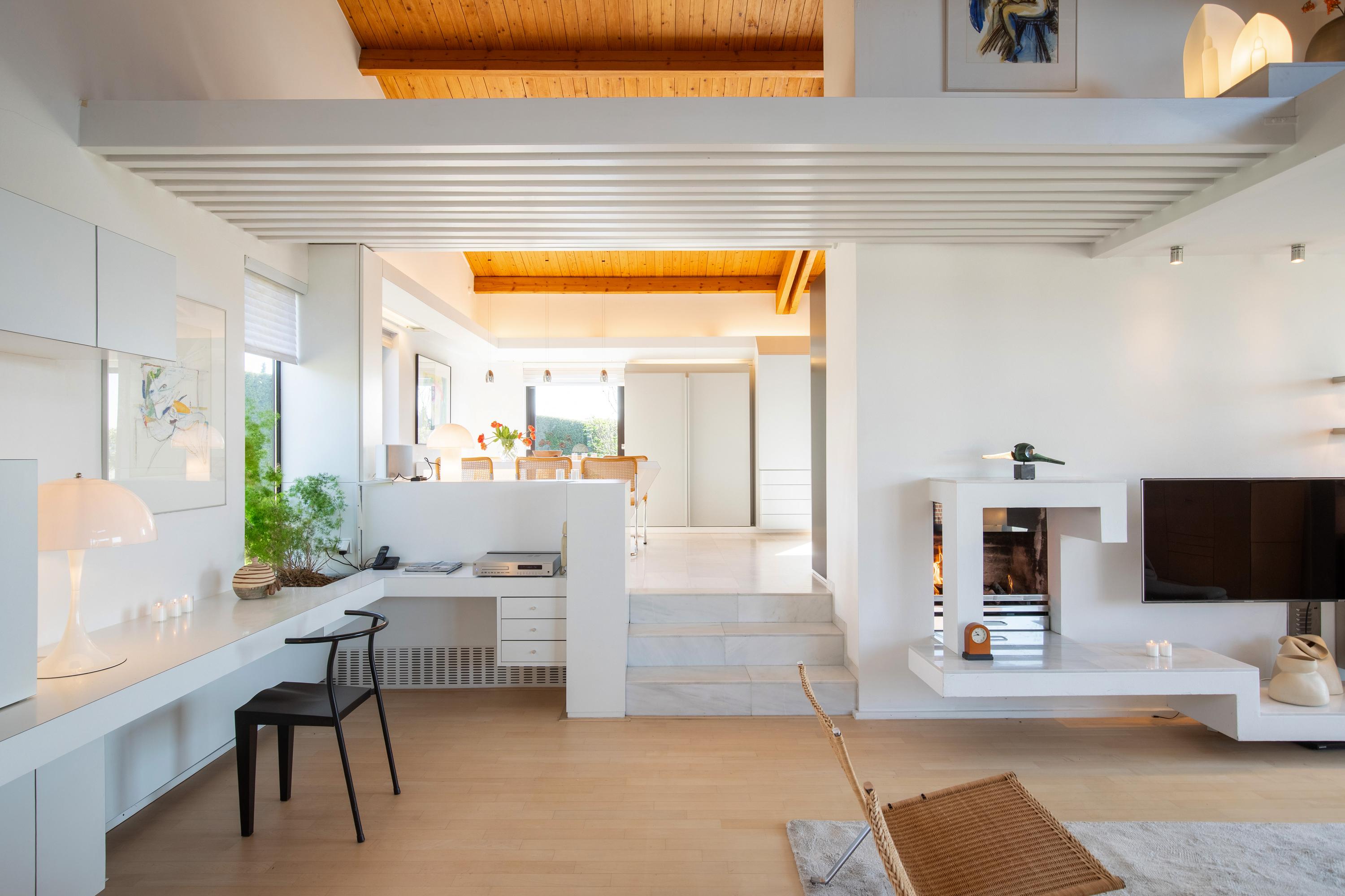 The villa features a highly varied and playful layout. The current owner uses it as a residence with a workspace, located in the spacious practice area on the ground floor. The property is accessible via a paved driveway. The driveway offers space for parking multiple vehicles. Covered entrance to the reception hall. From the reception hall, there is access to the two separate practice rooms currently used as a beauty salon. Utility room with mechanical systems. The indoor garage is equipped with two electrically operated sectional doors. The spacious garage offers parking for three vehicles. The utility room/storage area, located directly adjacent to the garage, is accessible from the garage. This space serves as the mechanical room for the indoor swimming pool. The fully tiled pool area is accessible via a spiral staircase from the master bedroom upstairs, as well as from the indoor garage. The pool measures approximately 45 m². This area also includes a separate restroom and shower room.