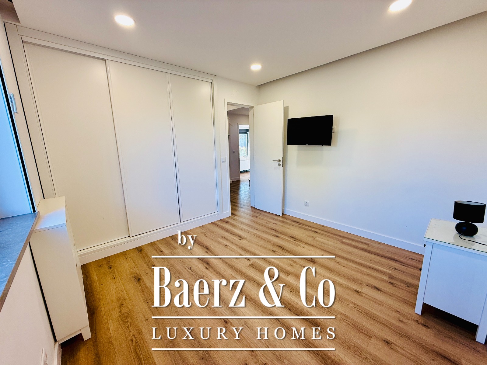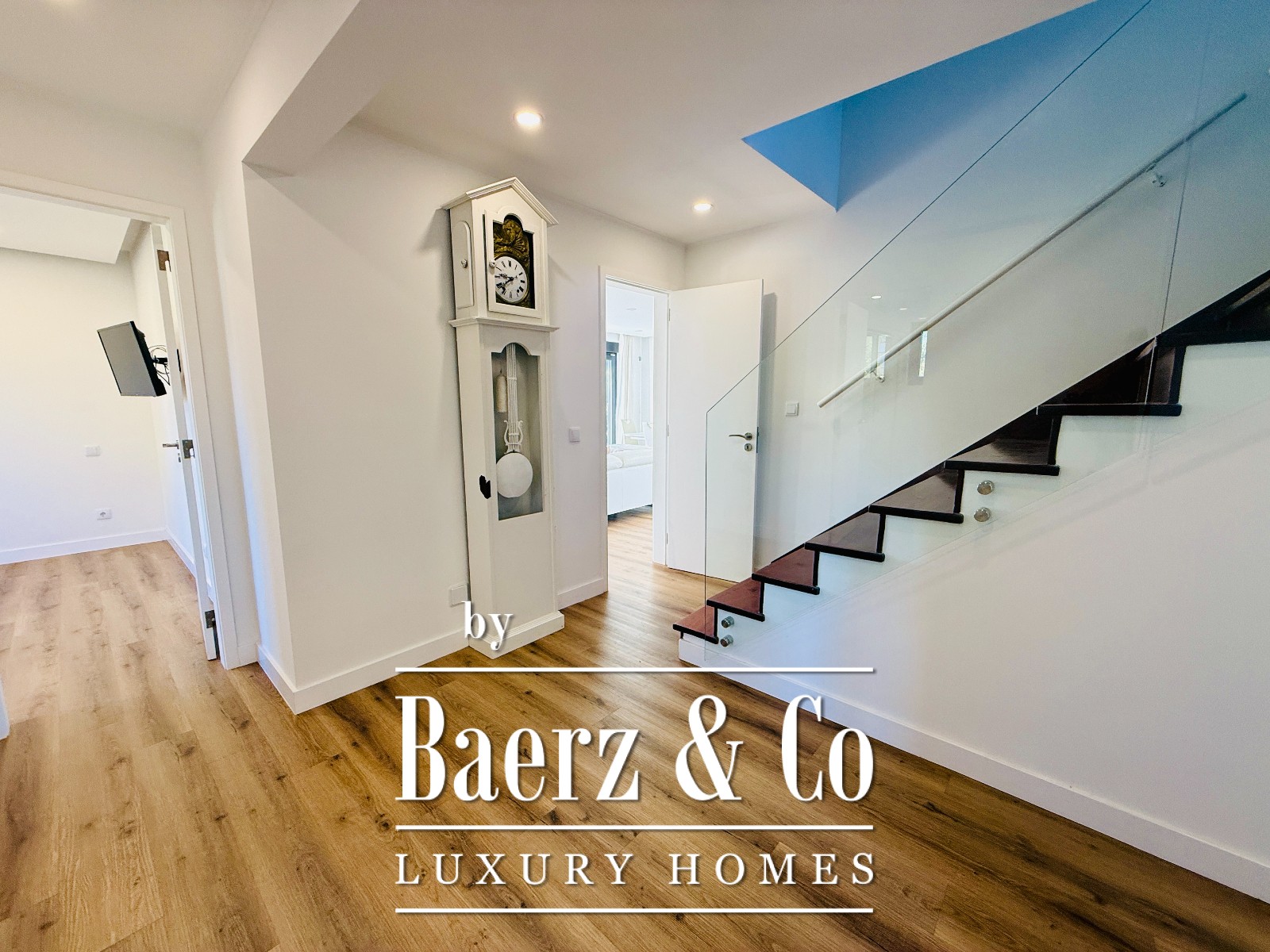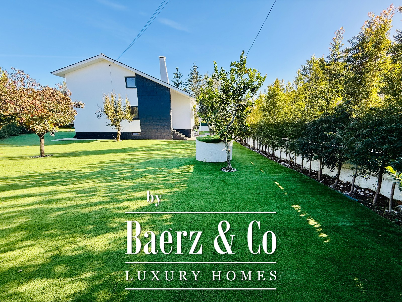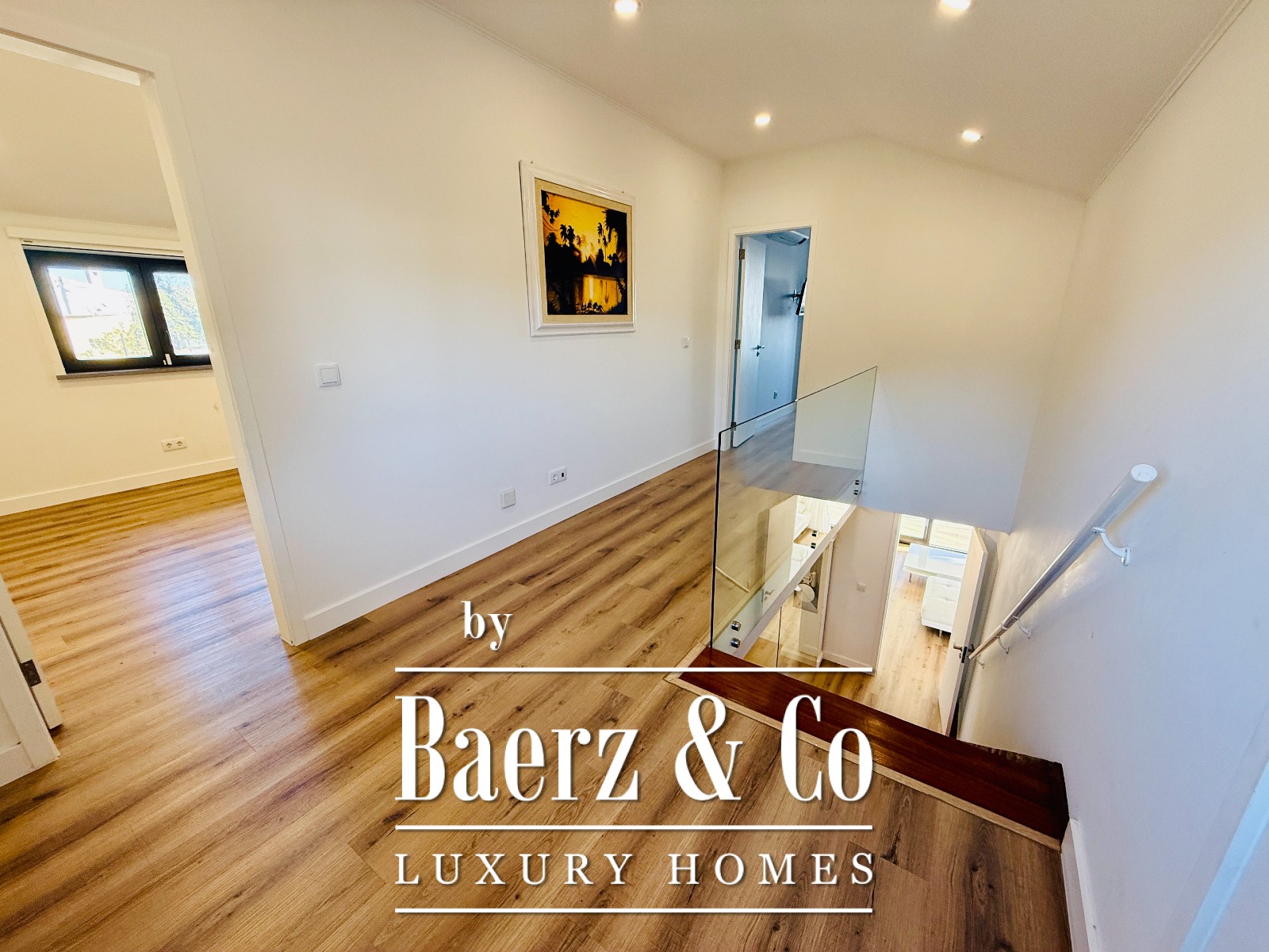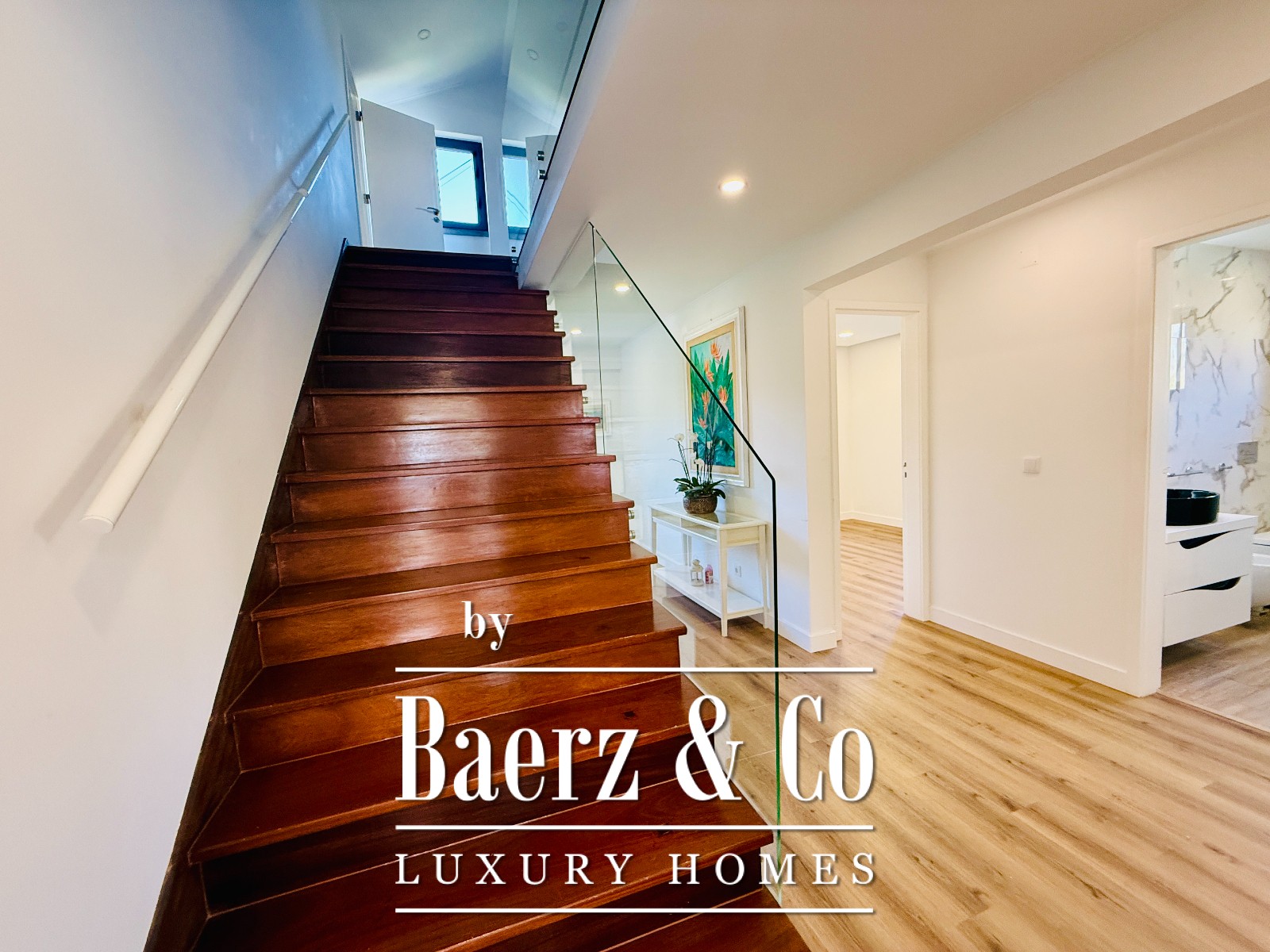 This house Sintra harmonizes contemporary renovation with a sense of privacy and calm, occupying 357 m² on an 868 m² plot. Natural light moves from east to west throughout its three levels, each thoughtfully arranged for both family life and quiet retreat. The ground floor offers a guest bedroom, additional bedroom, storage with a window, a laundry room, and an internal garage for one car. Upstairs, an American-style kitchen with a double refrigerator supports entertaining and everyday rhythm. The adjoining dining and living spaces feature a fireplace and open onto a terrace that leads directly to the heated swimming pool and garden. Two bedrooms on this level provide fitted wardrobes and are served by a well-appointed bathroom. The upper floor holds a principal suite with a walk-in closet and private bath, another suite with wardrobes, and an extra room for flexibility. Air conditioning throughout ensures comfort in every season, with the living spaces quietly set along a tranquil street. From here, Tasis School is ten minutes away, Caisl School twelve minutes, and the center of Lisbon within twenty-five kilometers, connecting daily life to the best of Sintra and the Portuguese capital. This house for sale in Sintra brings together refined practicality with understated elegance.
