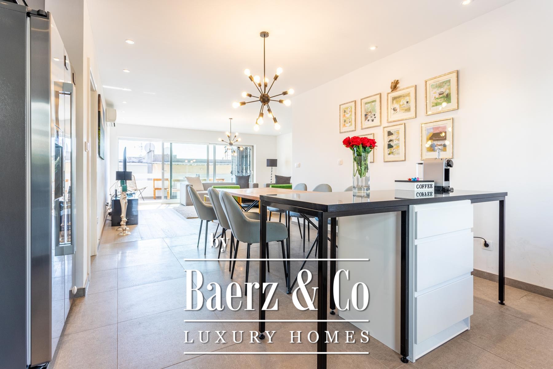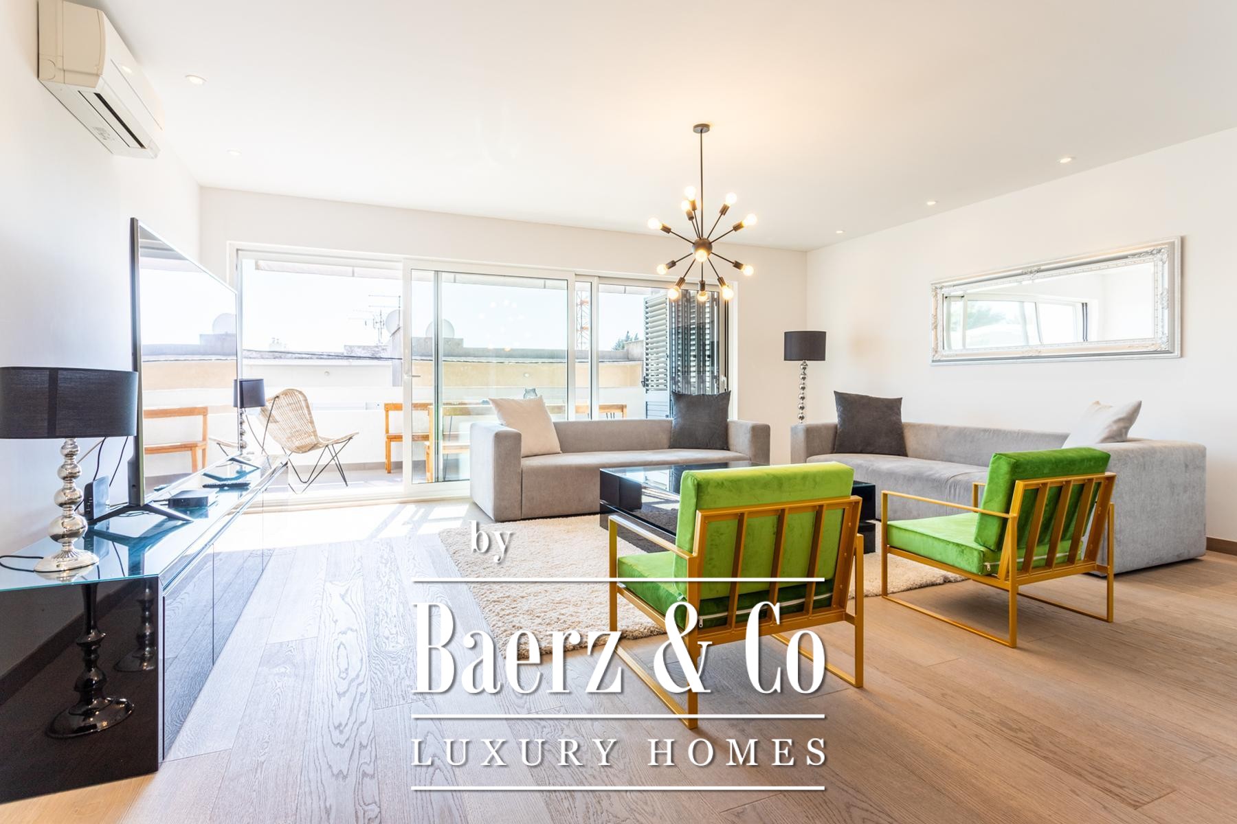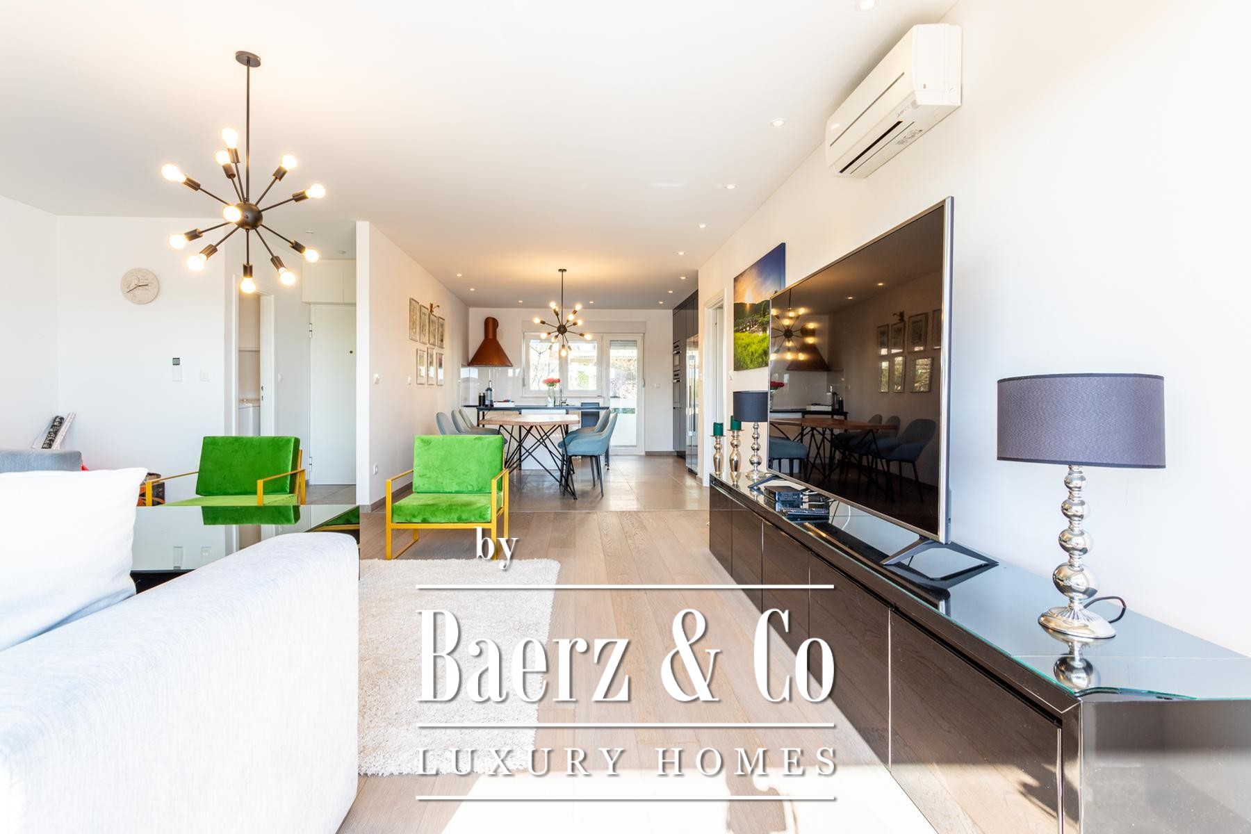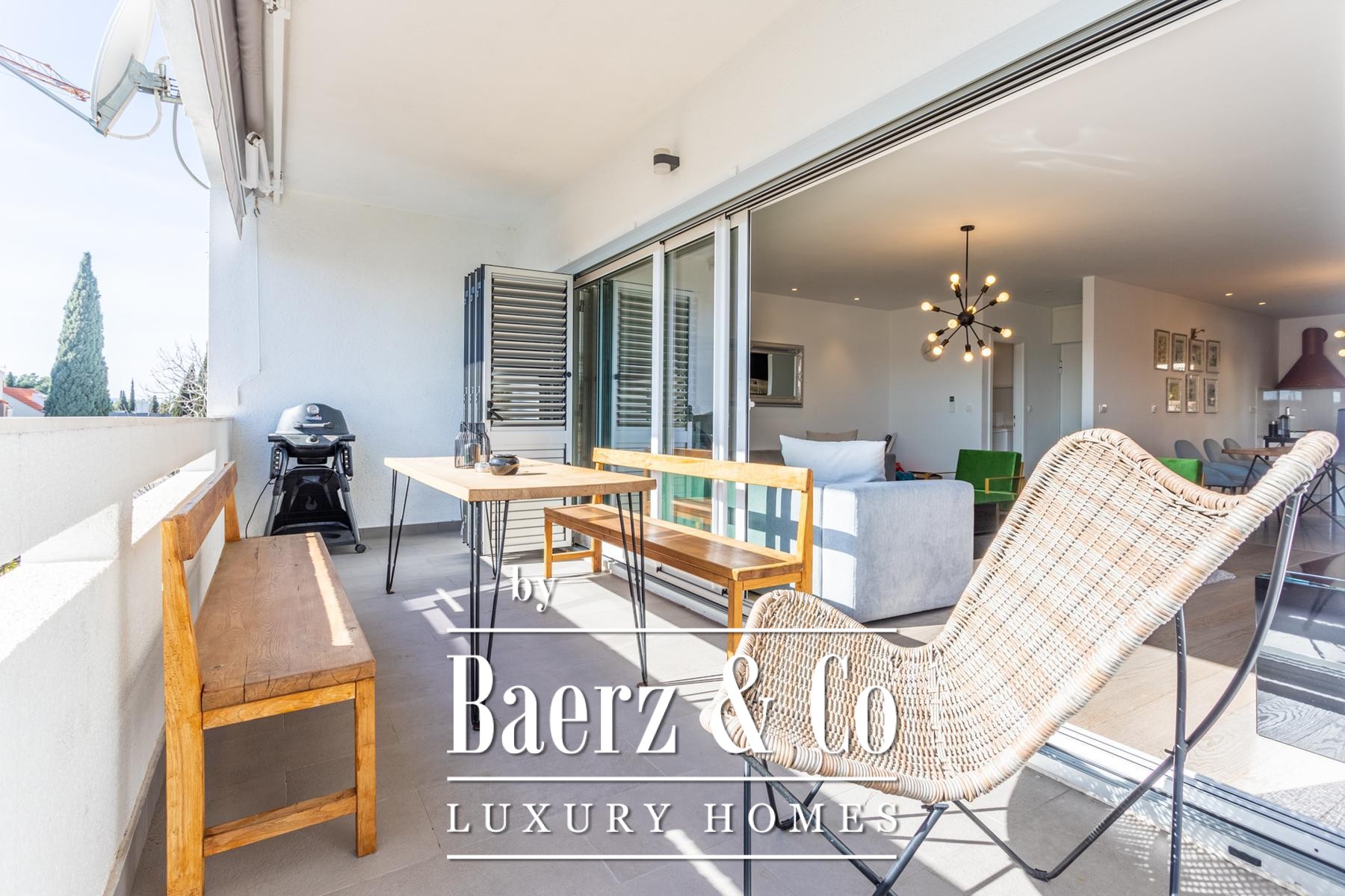 The interior, completely renovated and exceptionally decorated, is defined by understated quality and mindful design. Expansive balconies and terraces, totaling 50 m² along the eastern and southern sides, welcome abundant natural light and offer a partial sea view. An open living area seamlessly unites the kitchen, outfitted with Miele and Bosch appliances, dining, and lounge spaces, all leading to the terrace for effortless indoor-outdoor living.