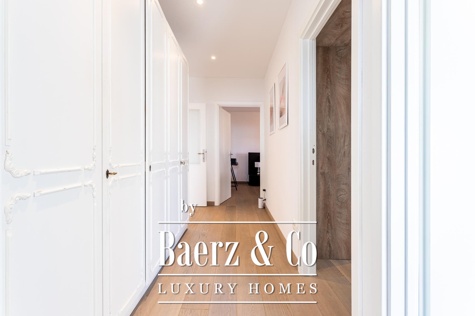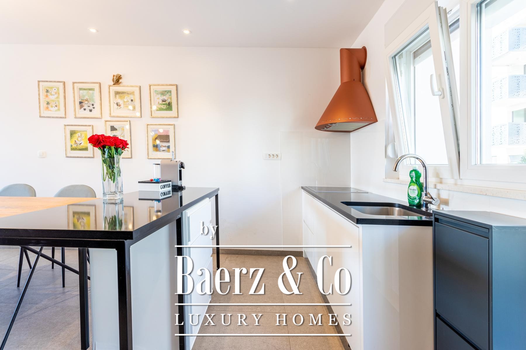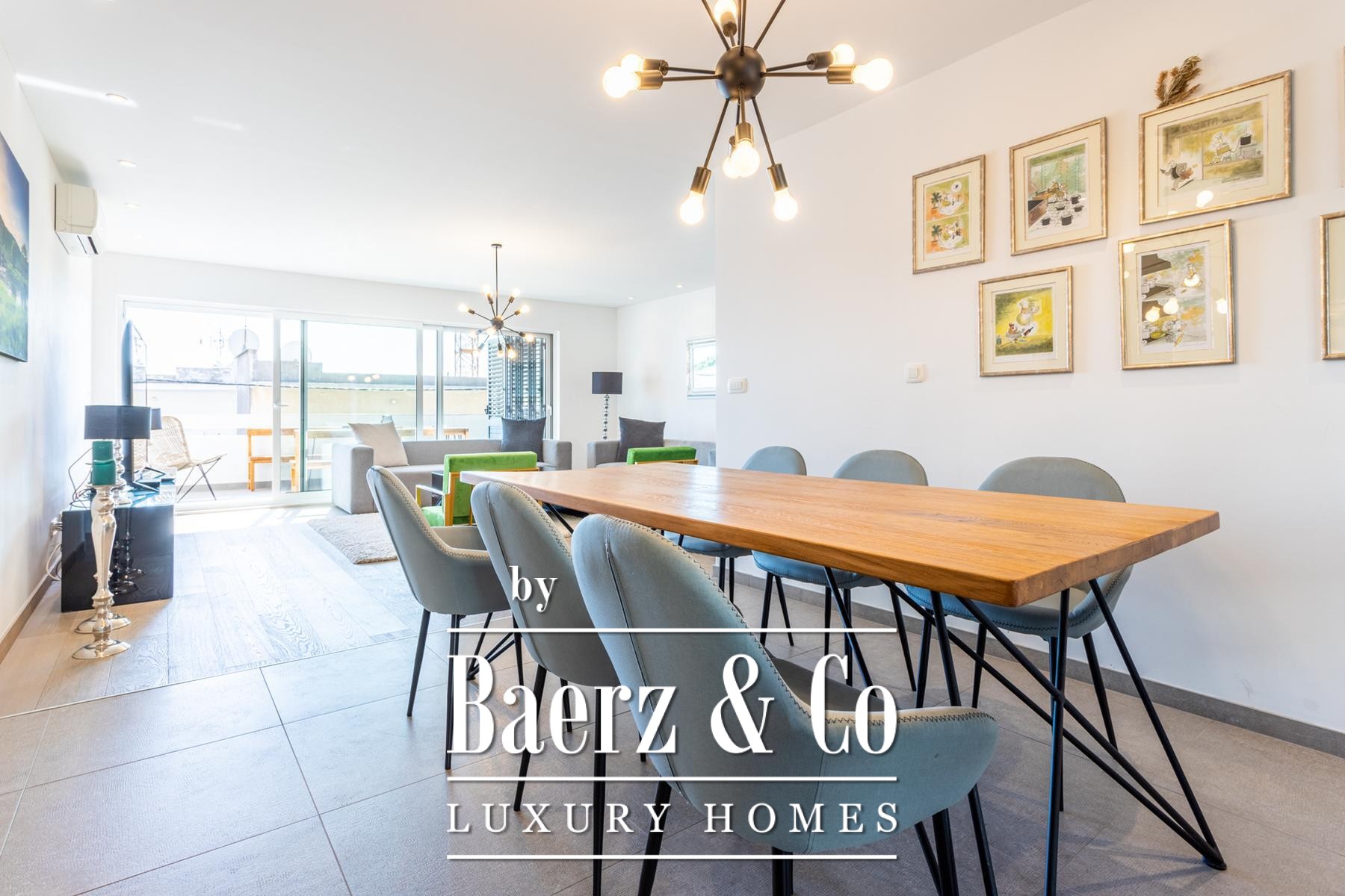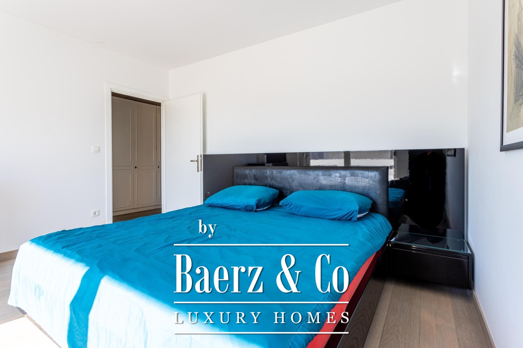 The interior, completely renovated and exceptionally decorated, is defined by understated quality and mindful design. Expansive balconies and terraces, totaling 50 m² along the eastern and southern sides, welcome abundant natural light and offer a partial sea view. An open living area seamlessly unites the kitchen, outfitted with Miele and Bosch appliances, dining, and lounge spaces, all leading to the terrace for effortless indoor-outdoor living.
