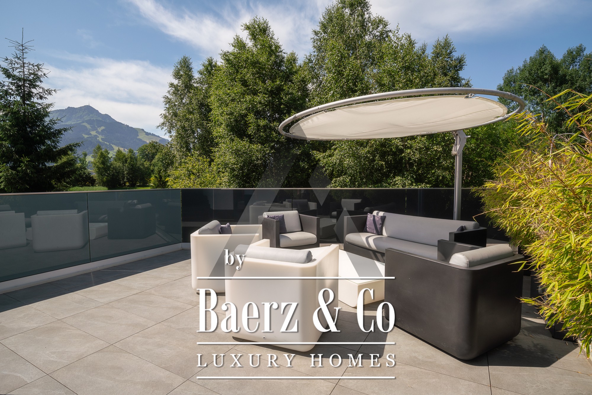 Inside, exposed concrete ceilings and reclaimed oak flooring introduce a subtle sophistication. The open-plan ground floor forms the heart of the home, where panoramic windows fill the living, dining, and designer Miele kitchen spaces with natural light. The ground level accommodates a master suite with dressing room, children's bedroom, ample bathrooms, and seamless storage. Upstairs, a separate apartment features two bedrooms, a living area with a fireplace, and a roof terrace that frames the mountain horizon. Completing the upper floor is an 18 m², fully air-conditioned fitness suite opening to its own terrace.
