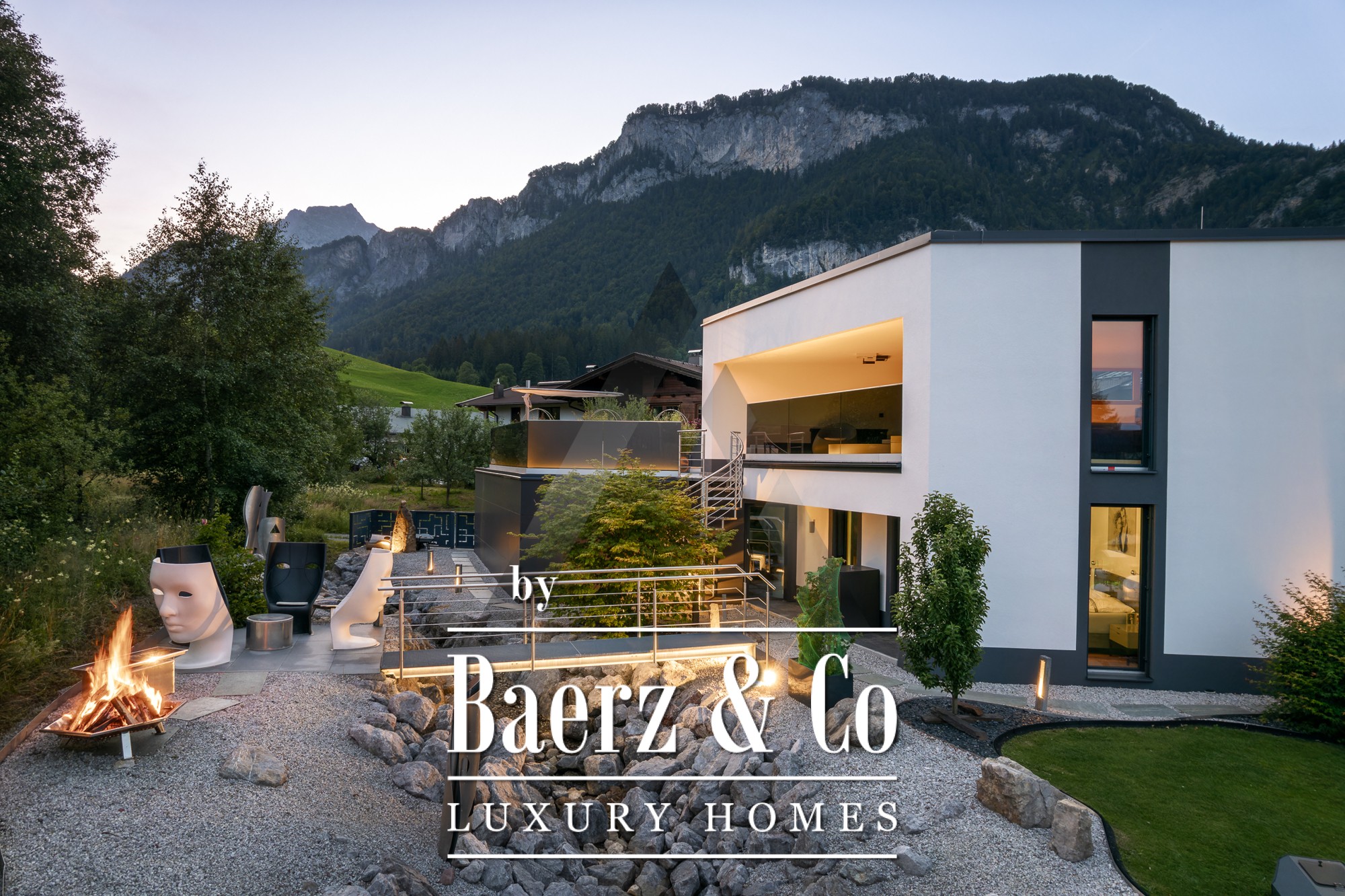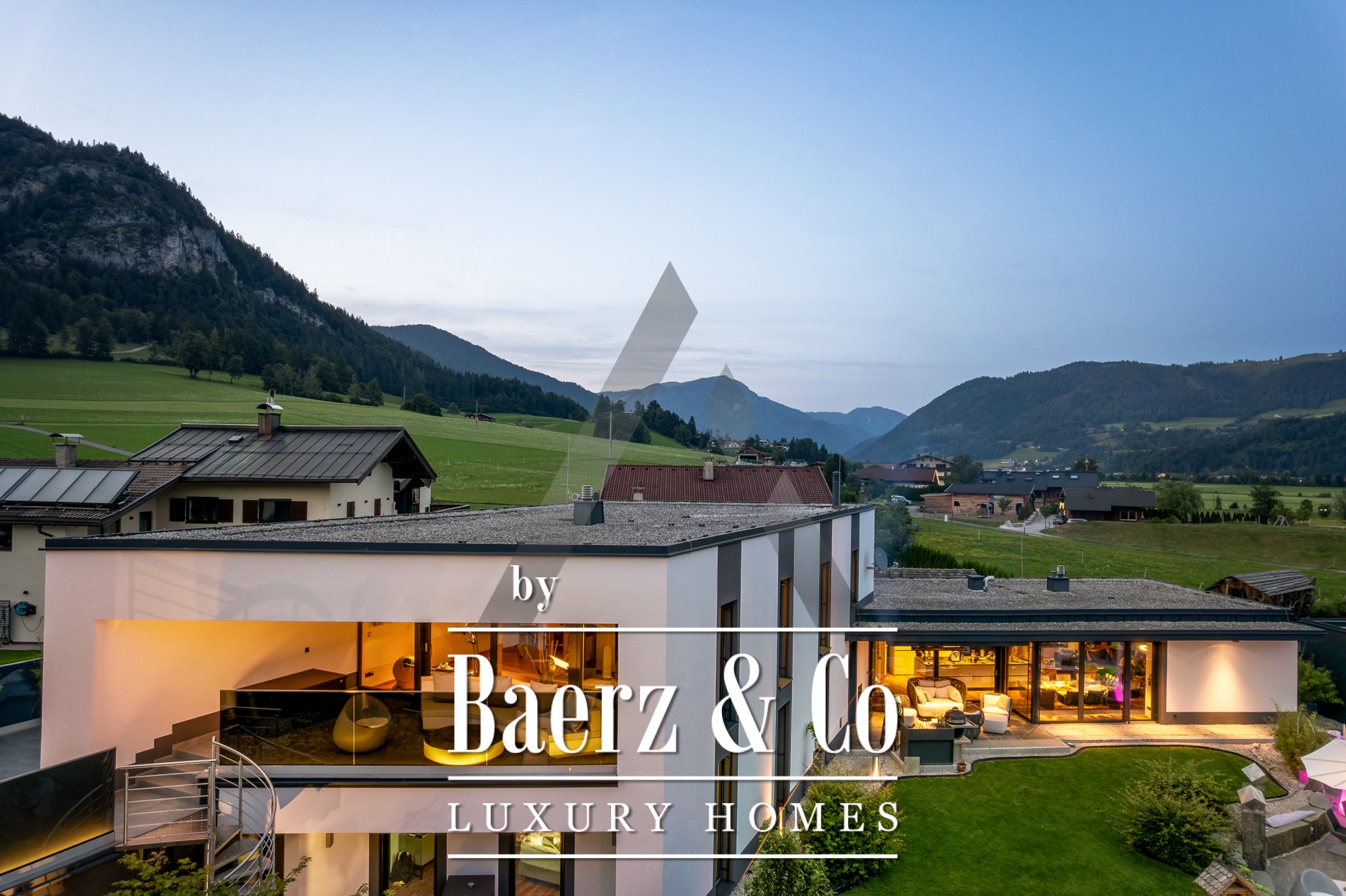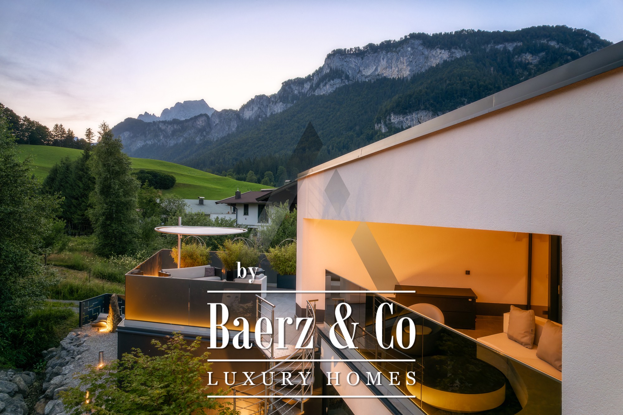Detached house St. Johann in Tirol is set in a tranquil, sun-drenched position, offering sweeping views of the Kitzbühel Horn and Wilder Kaiser mountains. This contemporary property, offering 418 m² of living space on a 1,186 m² plot, captures the essence of refined alpine living. An idyllic landscape unfolds with a pond, landscaped streams, expansive terraces, and panoramic mountain vistas. The outdoor realm is enhanced by a stainless steel pool, a Treesse designer whirlpool, and a sauna, inviting leisurely mornings and restorative afternoons.