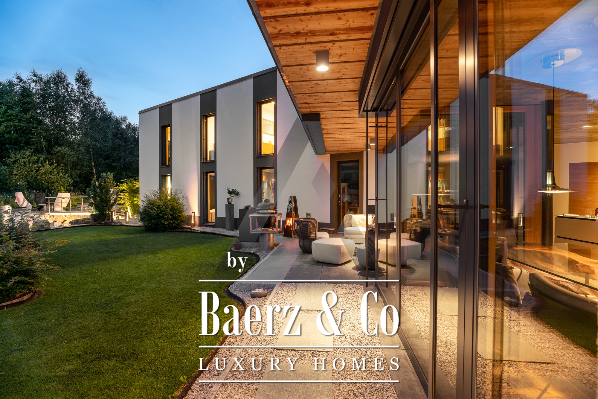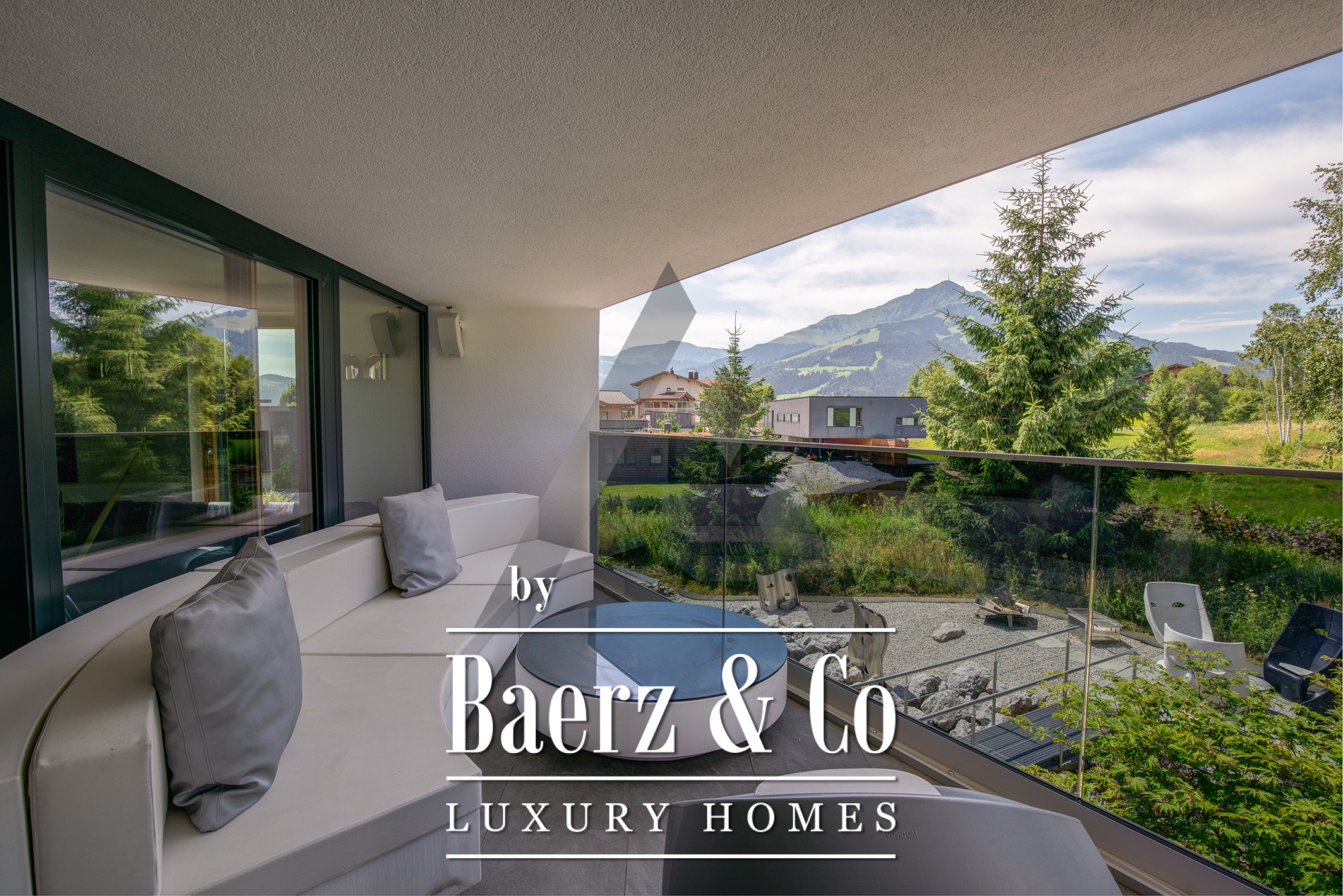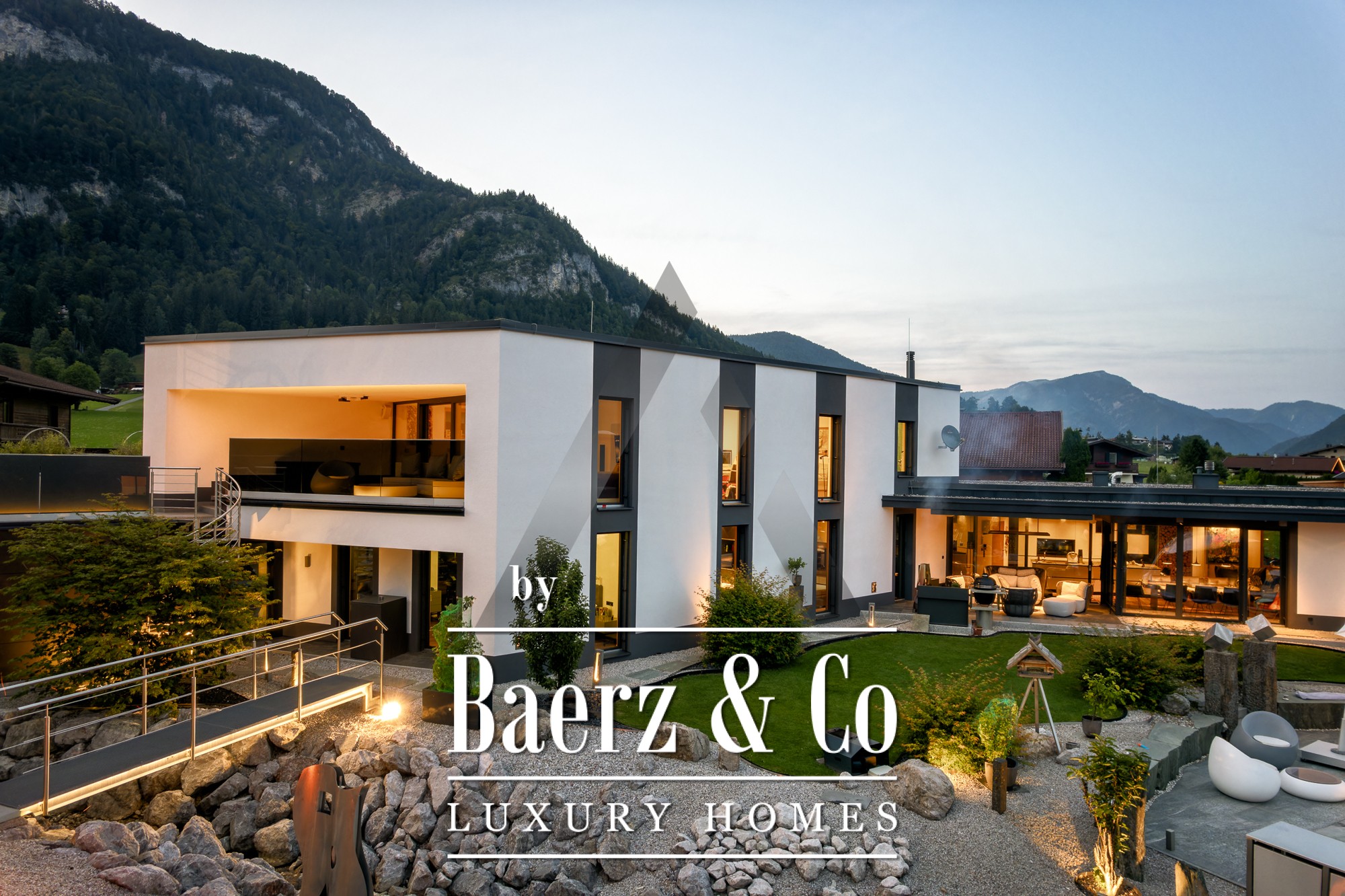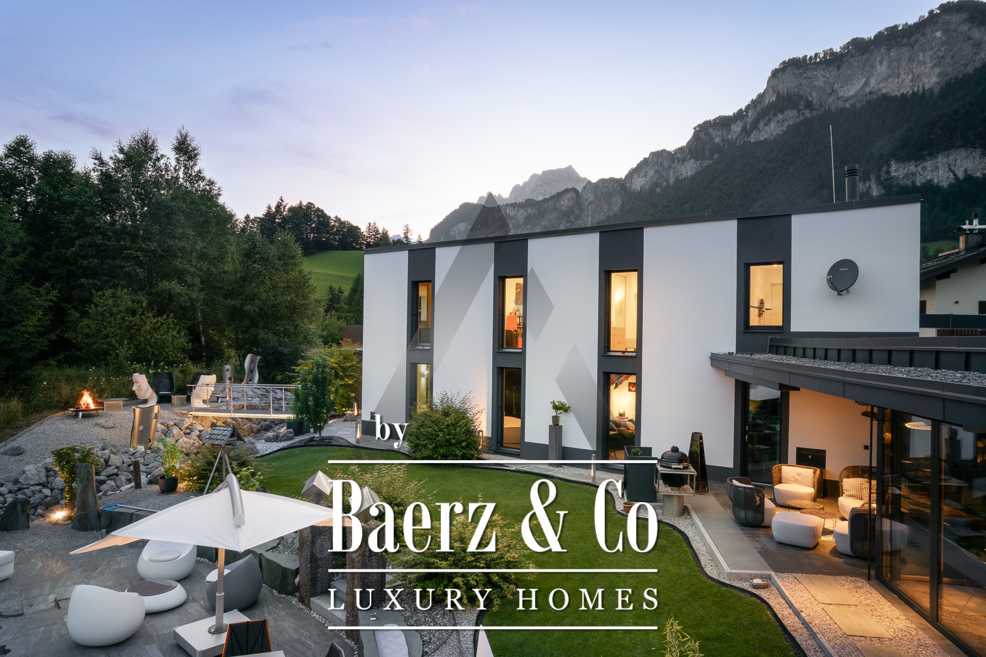 Detached house St. Johann in Tirol is set in a tranquil, sun-drenched position, offering sweeping views of the Kitzbühel Horn and Wilder Kaiser mountains. This contemporary property, offering 418 m² of living space on a 1,186 m² plot, captures the essence of refined alpine living. An idyllic landscape unfolds with a pond, landscaped streams, expansive terraces, and panoramic mountain vistas. The outdoor realm is enhanced by a stainless steel pool, a Treesse designer whirlpool, and a sauna, inviting leisurely mornings and restorative afternoons.