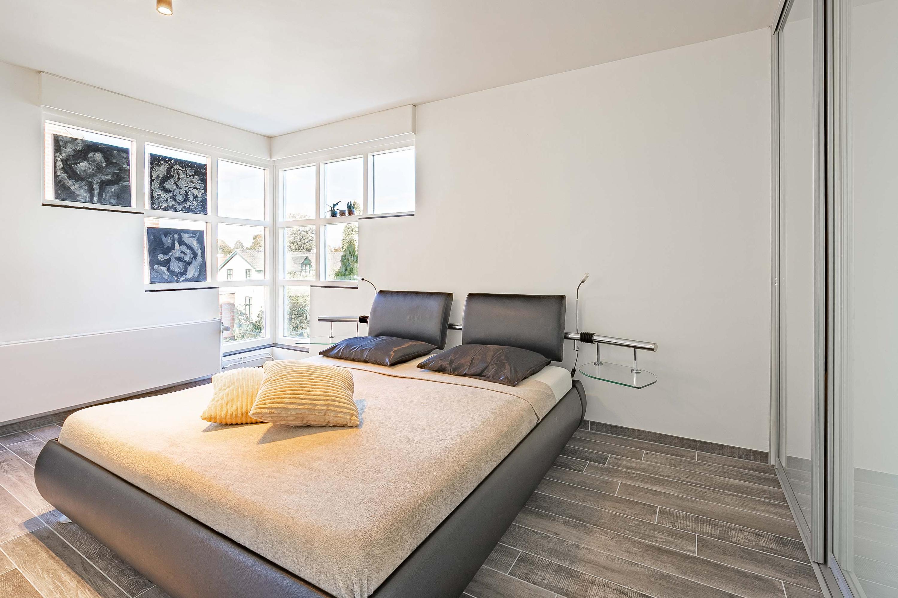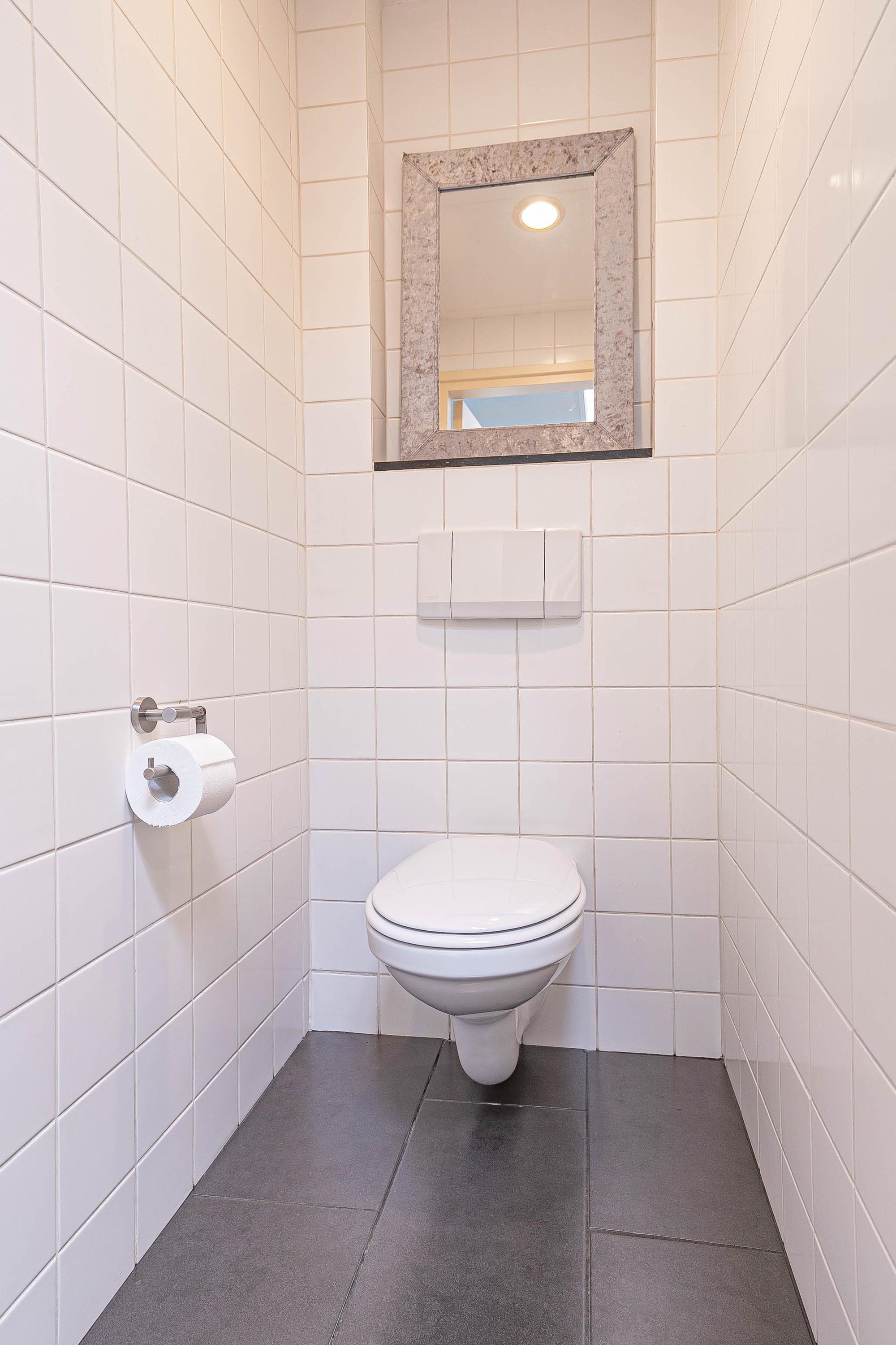 Overloop met lichtkoepel. Drie slaapkamers (ca. 12m², 10m², 9m²), waarvan twéé slaapkamers voorzien van zonneschermen. Badkamer (ca. 4m²) met douche en vaste wastafel. Ook bevindt zich op deze verdieping een separaat toilet. De gehele eerste verdieping is voorzien van houten kozijnen, dubbel glas en een keramische vloer. De eerste verdieping heeft een hoogte van 2,45m met uitzondering van de oppervlaktes onder het dakschuin.
