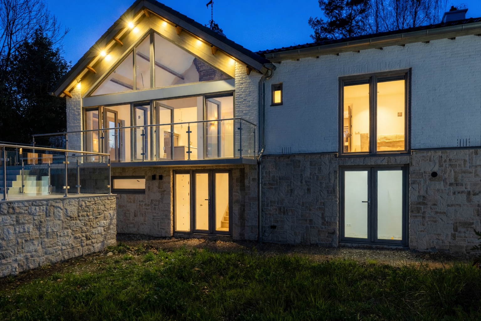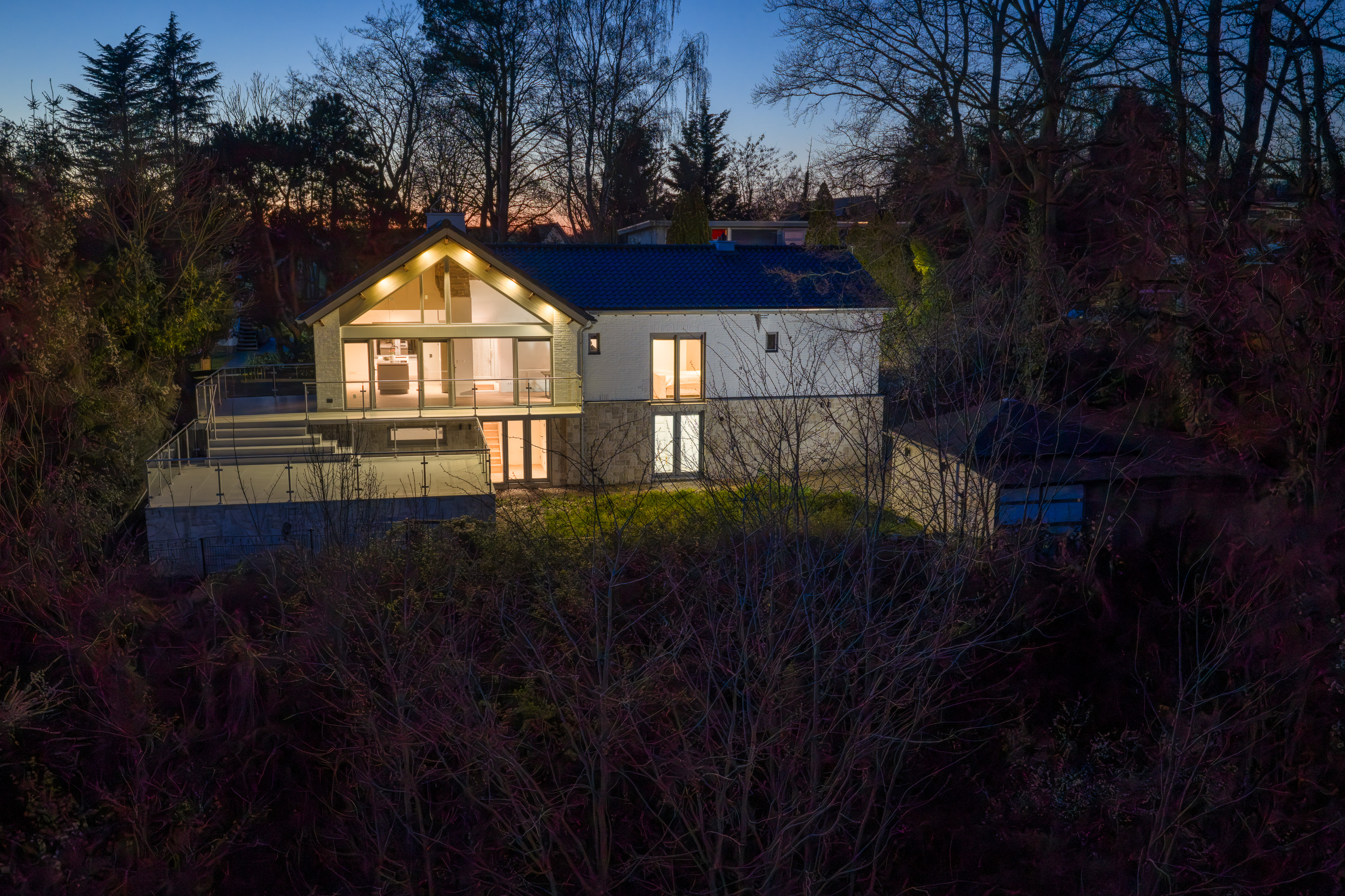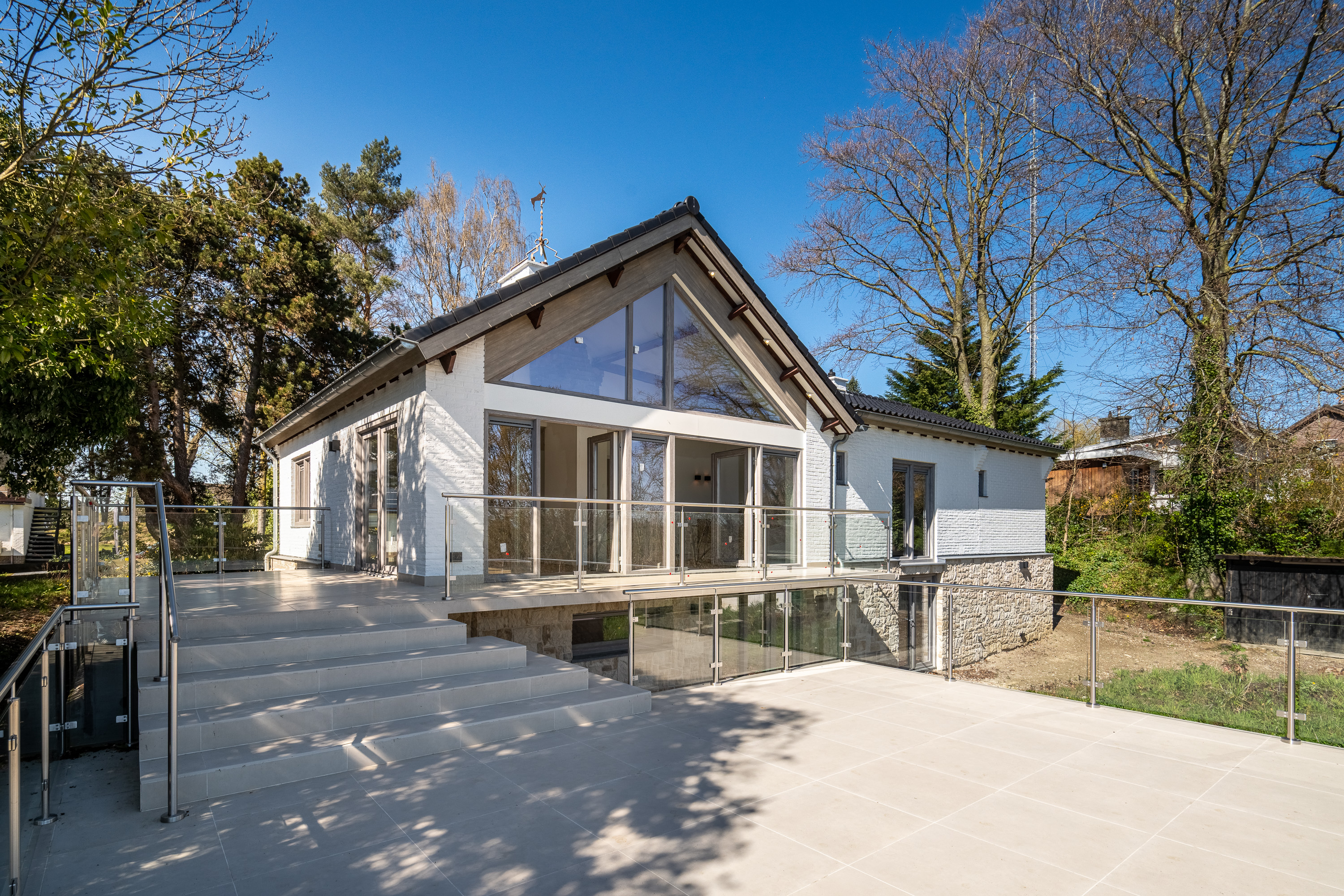 The living area is located at the rear and is fully oriented toward the panoramic view. Thanks to the large windows, natural light floods in, and the indoor and outdoor spaces blend seamlessly. With an XL garage, a practical layout, and all essential living amenities on the ground floor, this home combines luxury with lifetime-ready living. The home features a spacious, multifunctional basement and a practical attic.