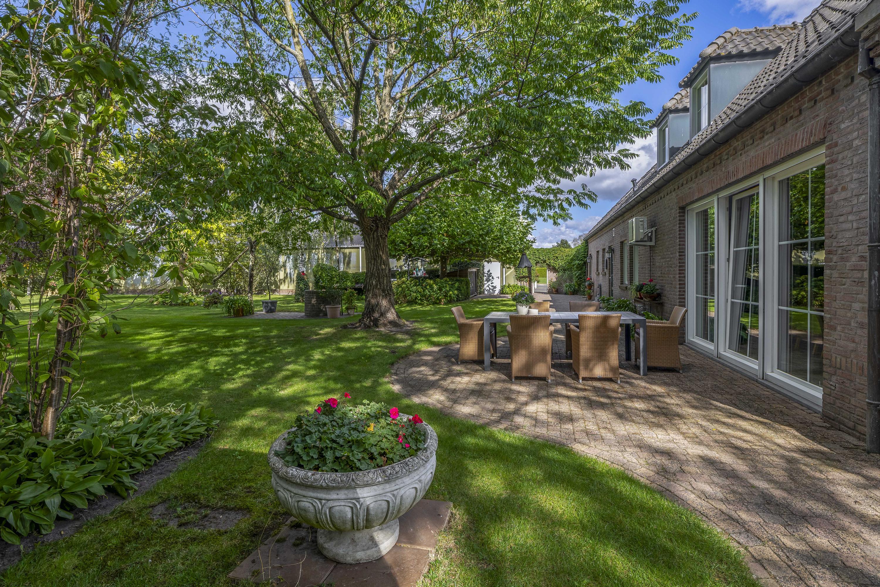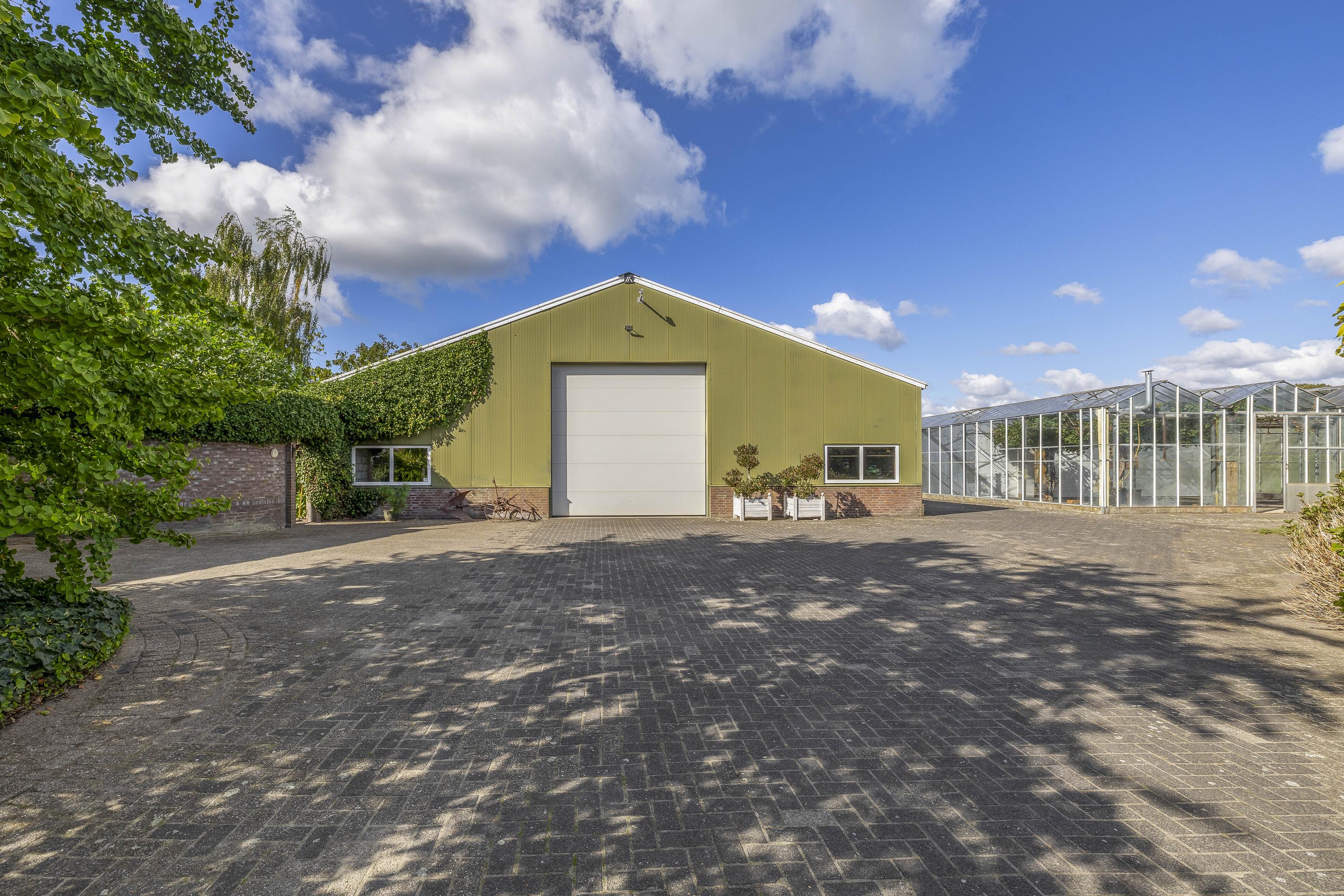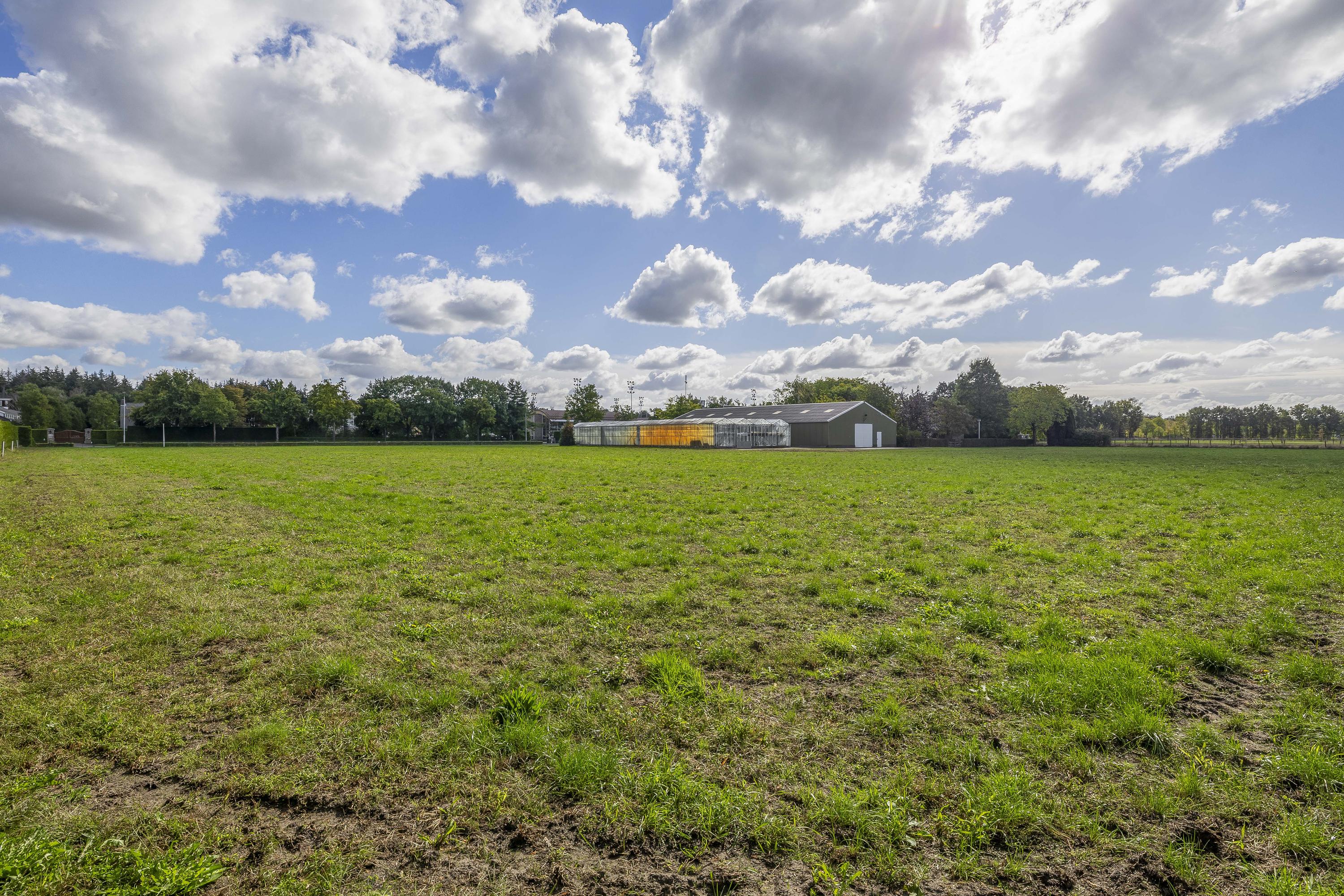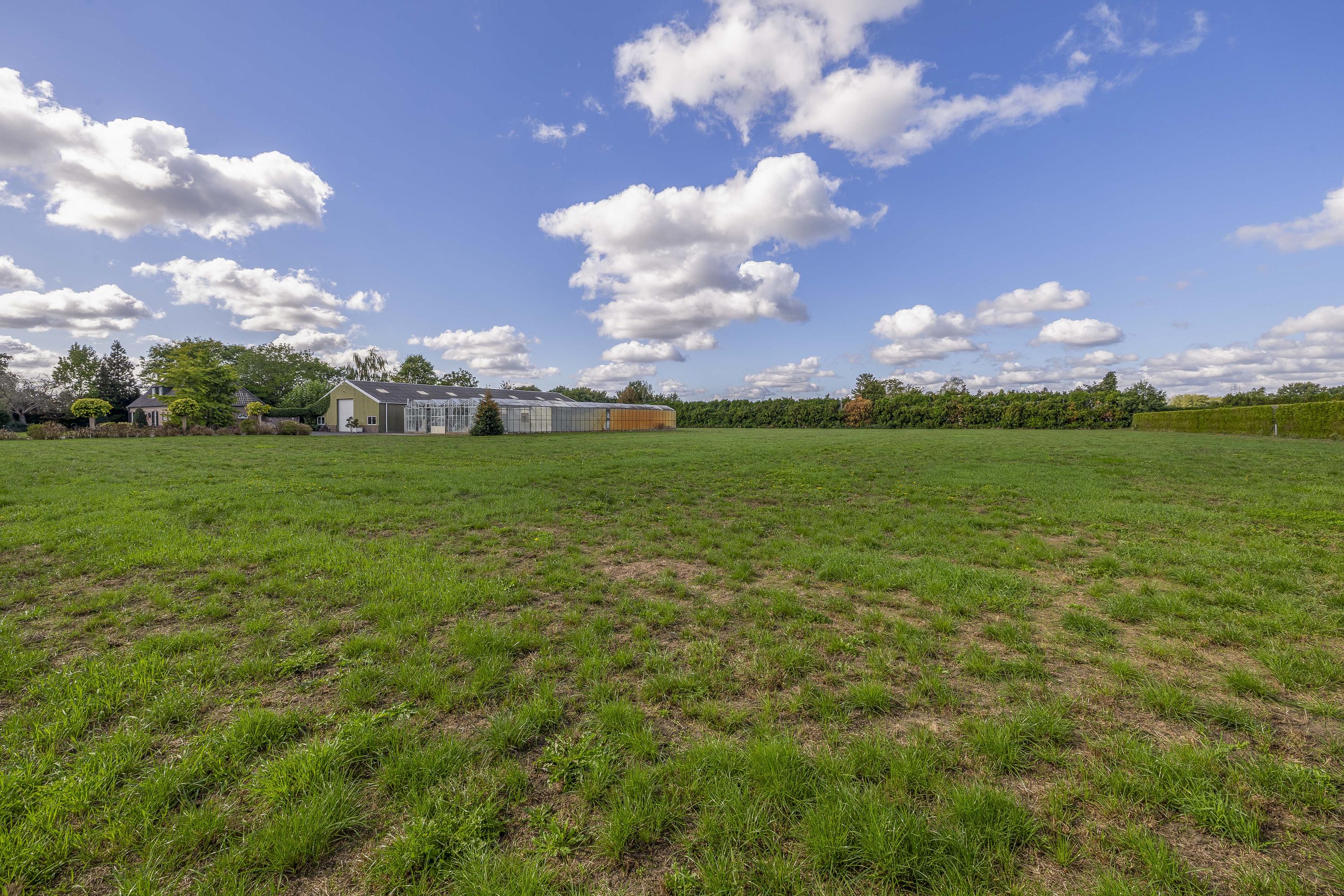 en-suite bathroom. There is also a practical utility room and an indoor garage. Outside, a spacious, well-maintained garden awaits you, featuring a large lawn, mature trees that add character, natural hedges, a terrace at the rear and a covered terrace. The detached barn and adjacent greenhouse offer plenty of opportunities for establishing an (agricultural) business. In addition, the adjacent plot of cultivated land can also be used for commercial purposes, but it is of course also ideal for keeping horses as a hobby.
