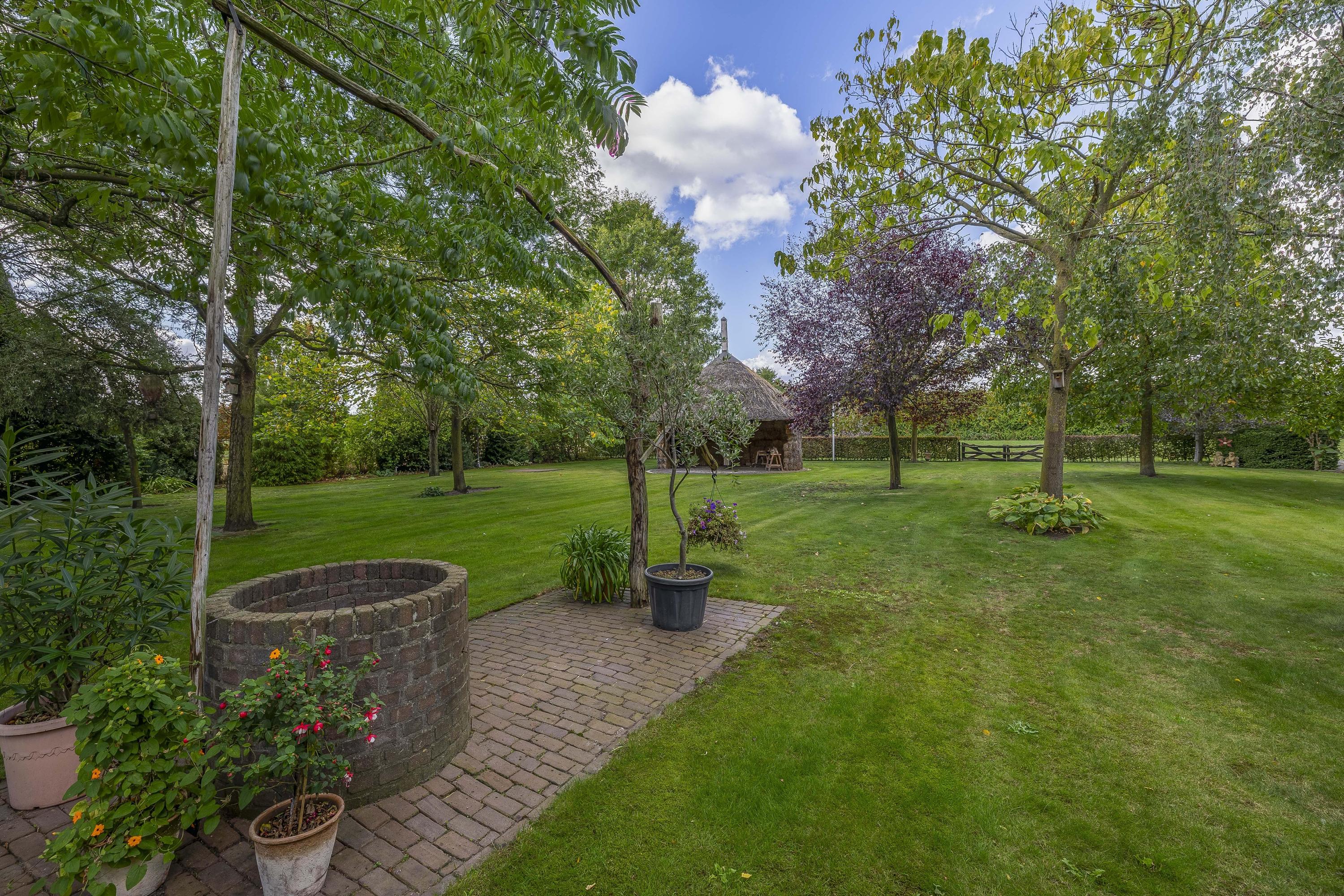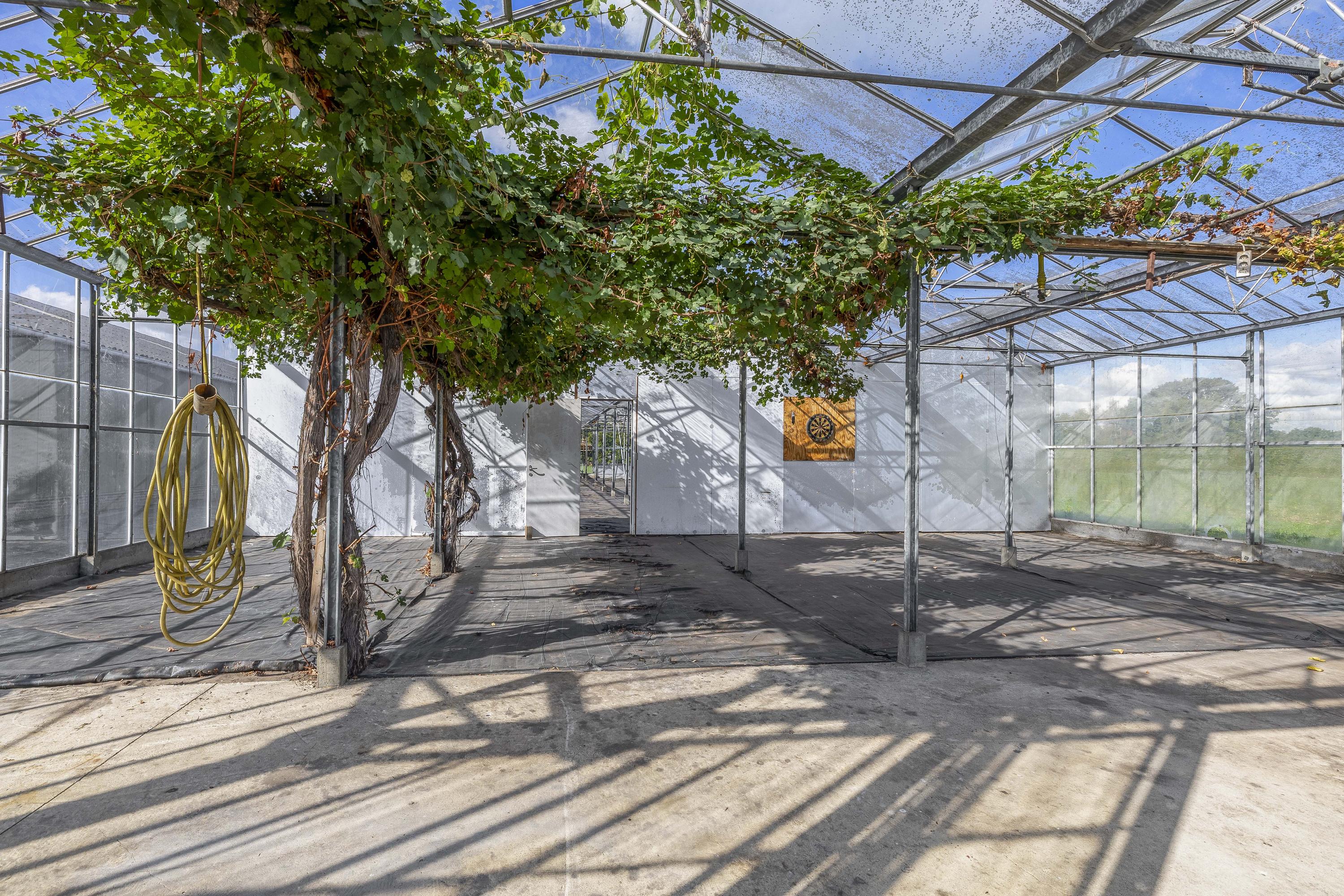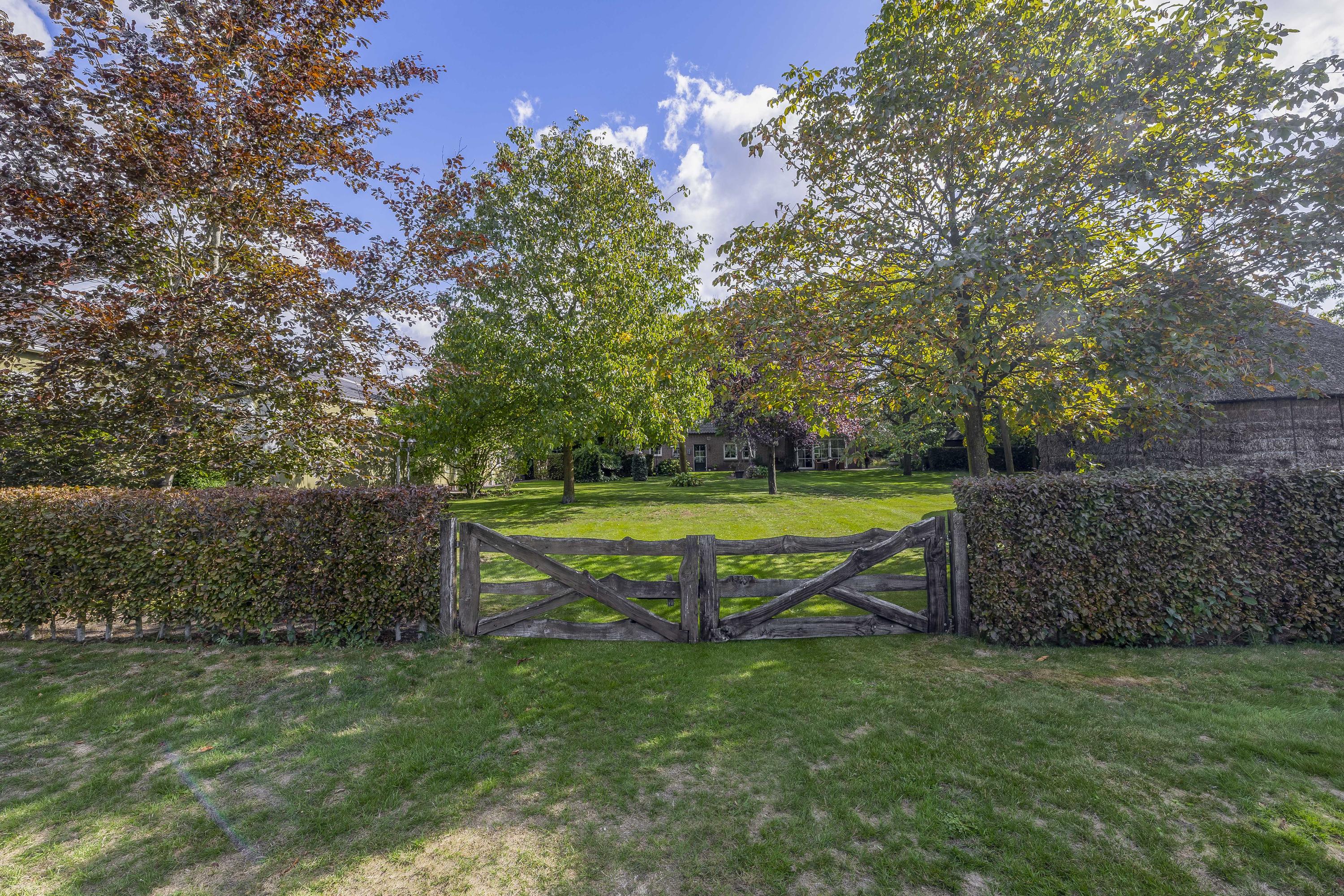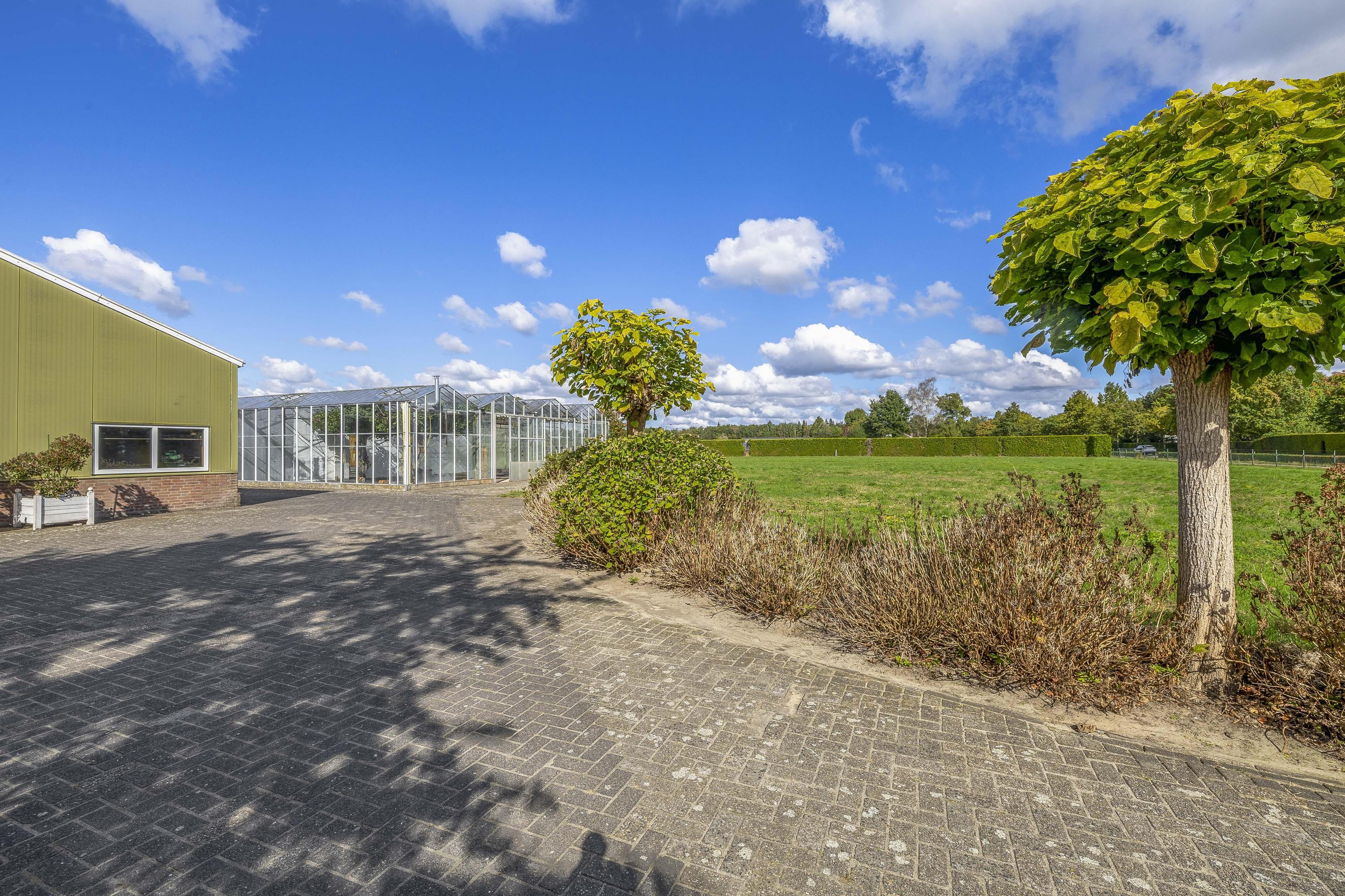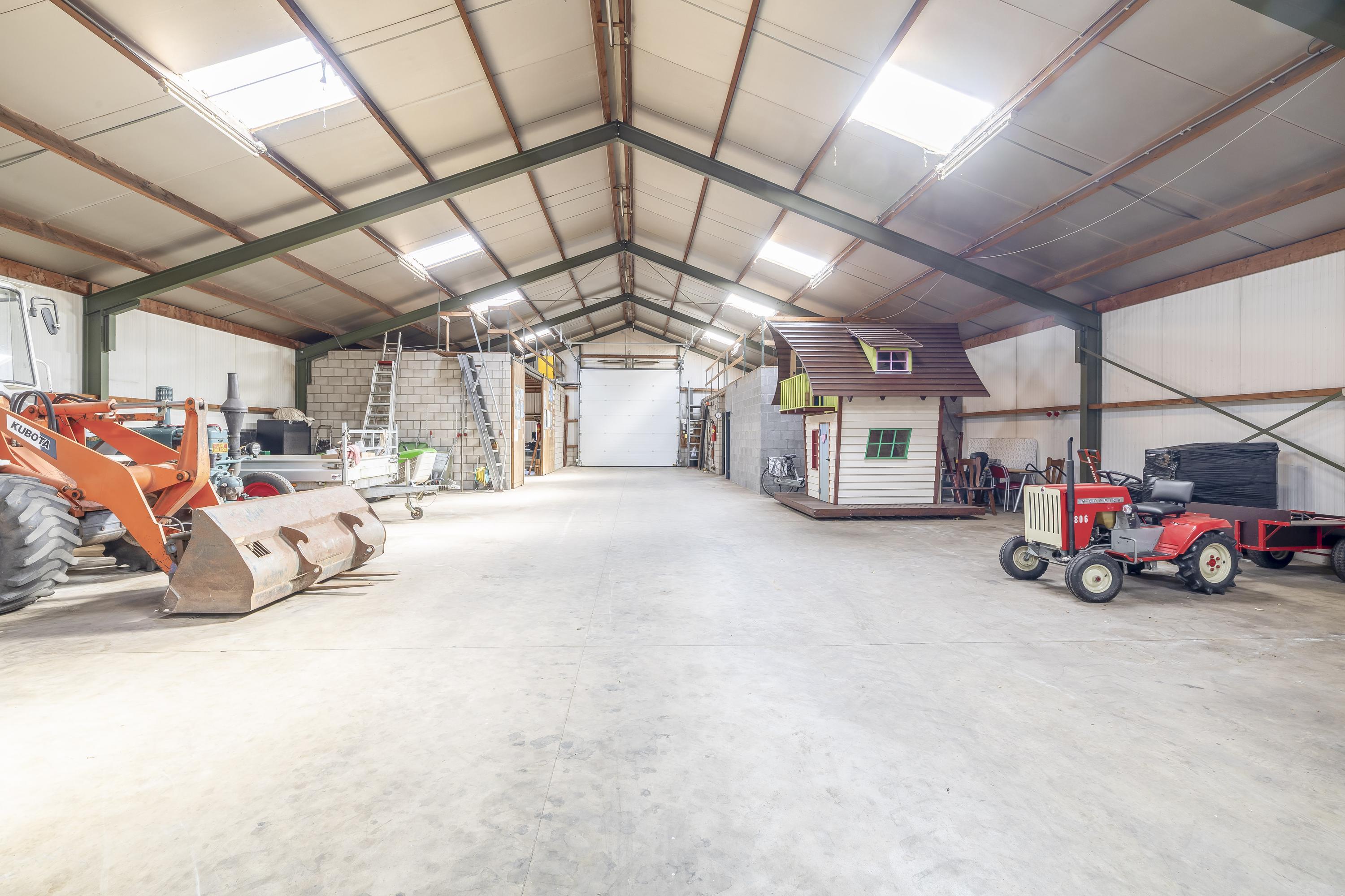 en-suite bathroom. There is also a practical utility room and an indoor garage. Outside, a spacious, well-maintained garden awaits you, featuring a large lawn, mature trees that add character, natural hedges, a terrace at the rear and a covered terrace. The detached barn and adjacent greenhouse offer plenty of opportunities for establishing an (agricultural) business. In addition, the adjacent plot of cultivated land can also be used for commercial purposes, but it is of course also ideal for keeping horses as a hobby.