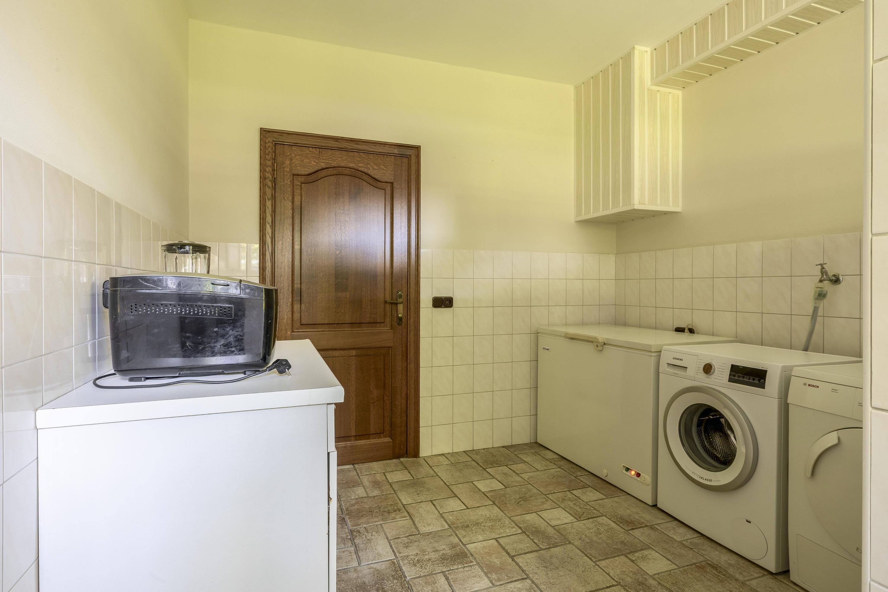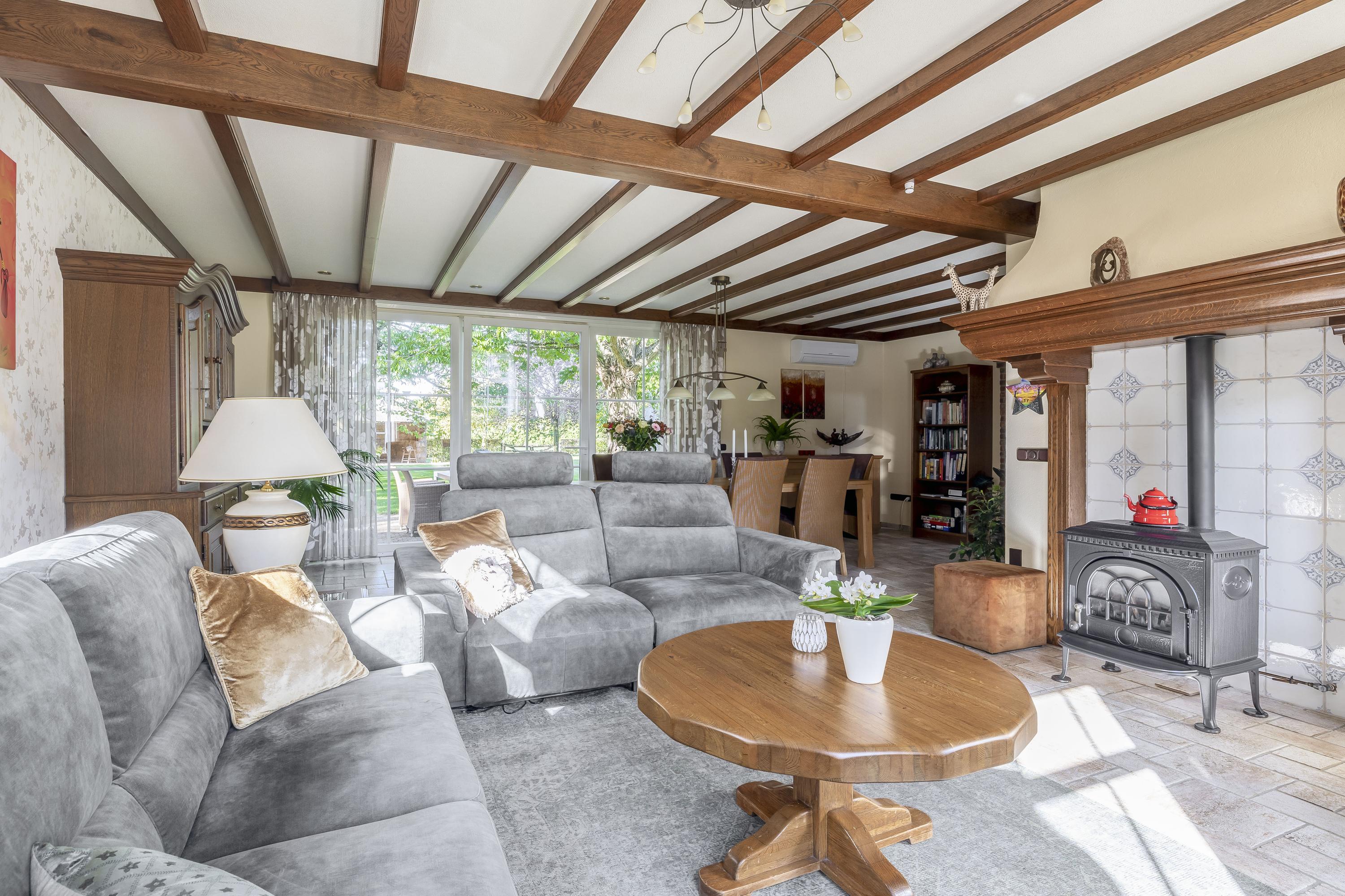 staircase provides access to the first floor. The spacious living room is a wonderful space. The large windows and sliding doors offer a beautiful unobstructed view of the garden. The wooden beamed ceiling and the fireplace with gas stove add extra atmosphere to the room. There is also air conditioning. The kitchen is corner-shaped and equipped with a dishwasher, sink, ceramic hob, oven, microwave and refrigerator. The windows from the kitchen also offer a view of the garden. The utility room is partially tiled and equipped with connections for washing appliances. A door provides access to the back garden. The bathroom is fully tiled and equipped with a bathtub, a double sink with cabinet and a designer radiator. The bedroom is adjacent to the bathroom.