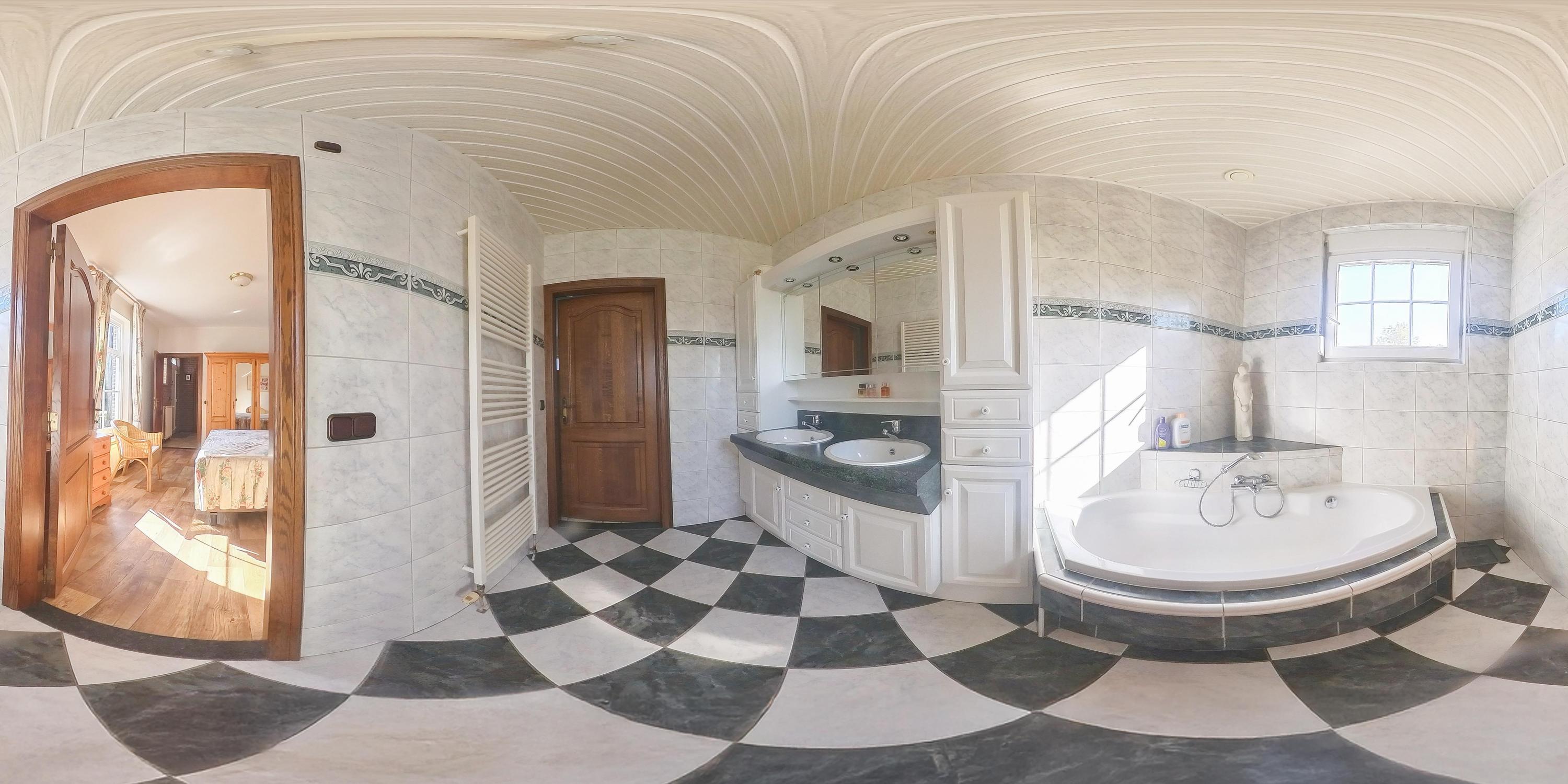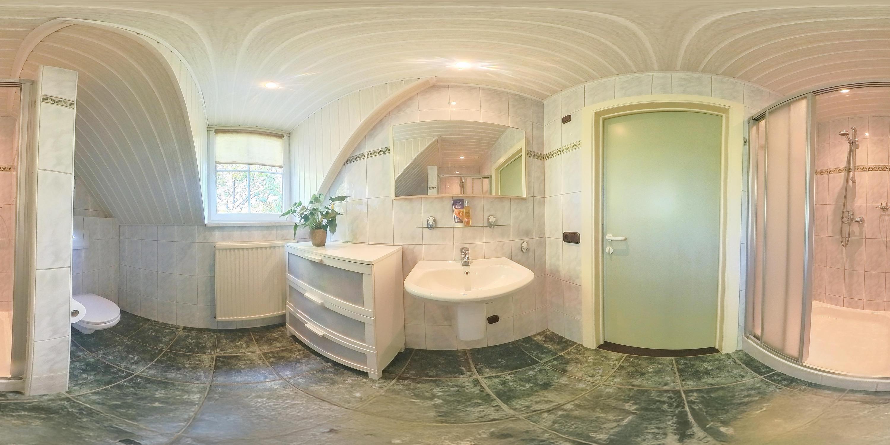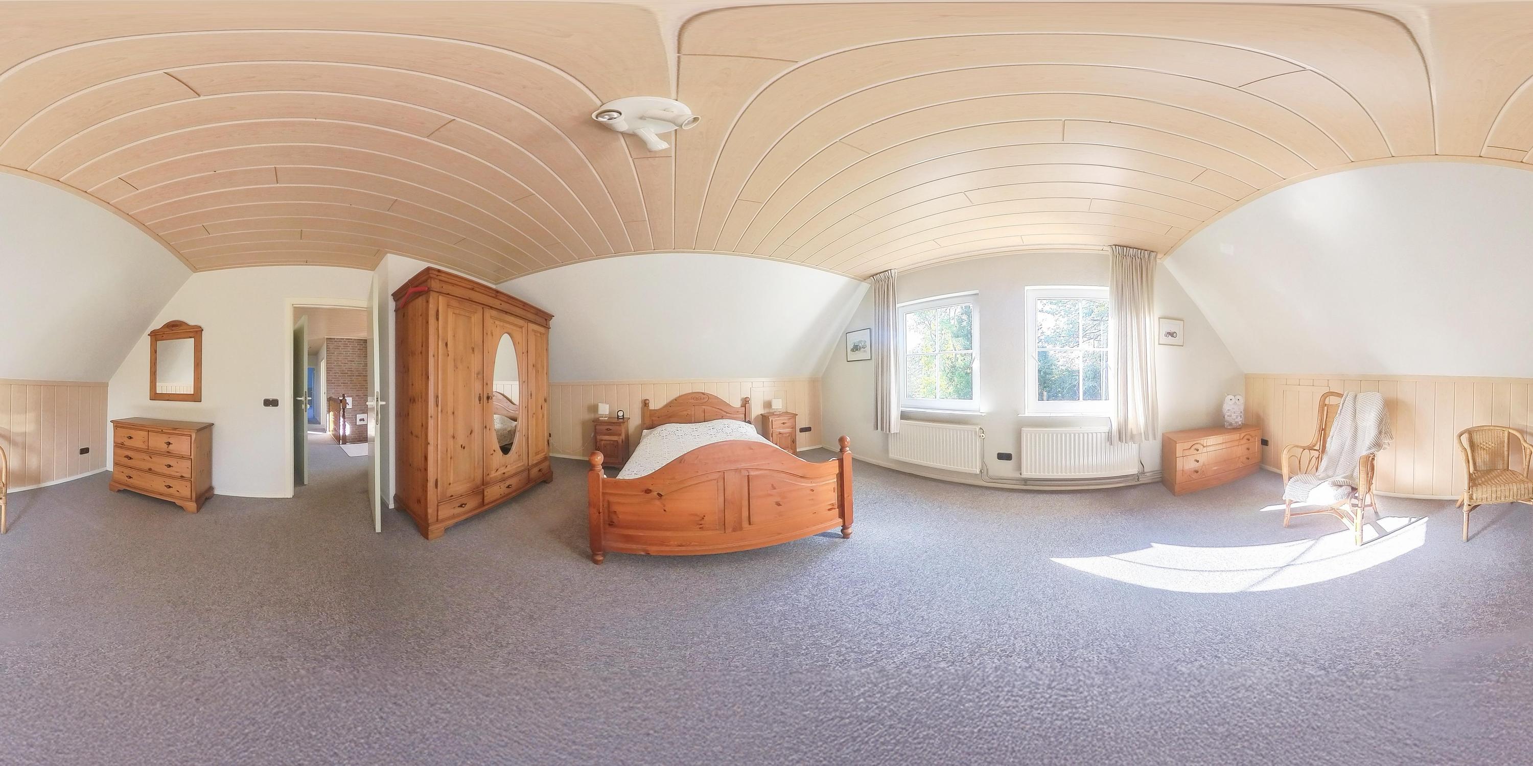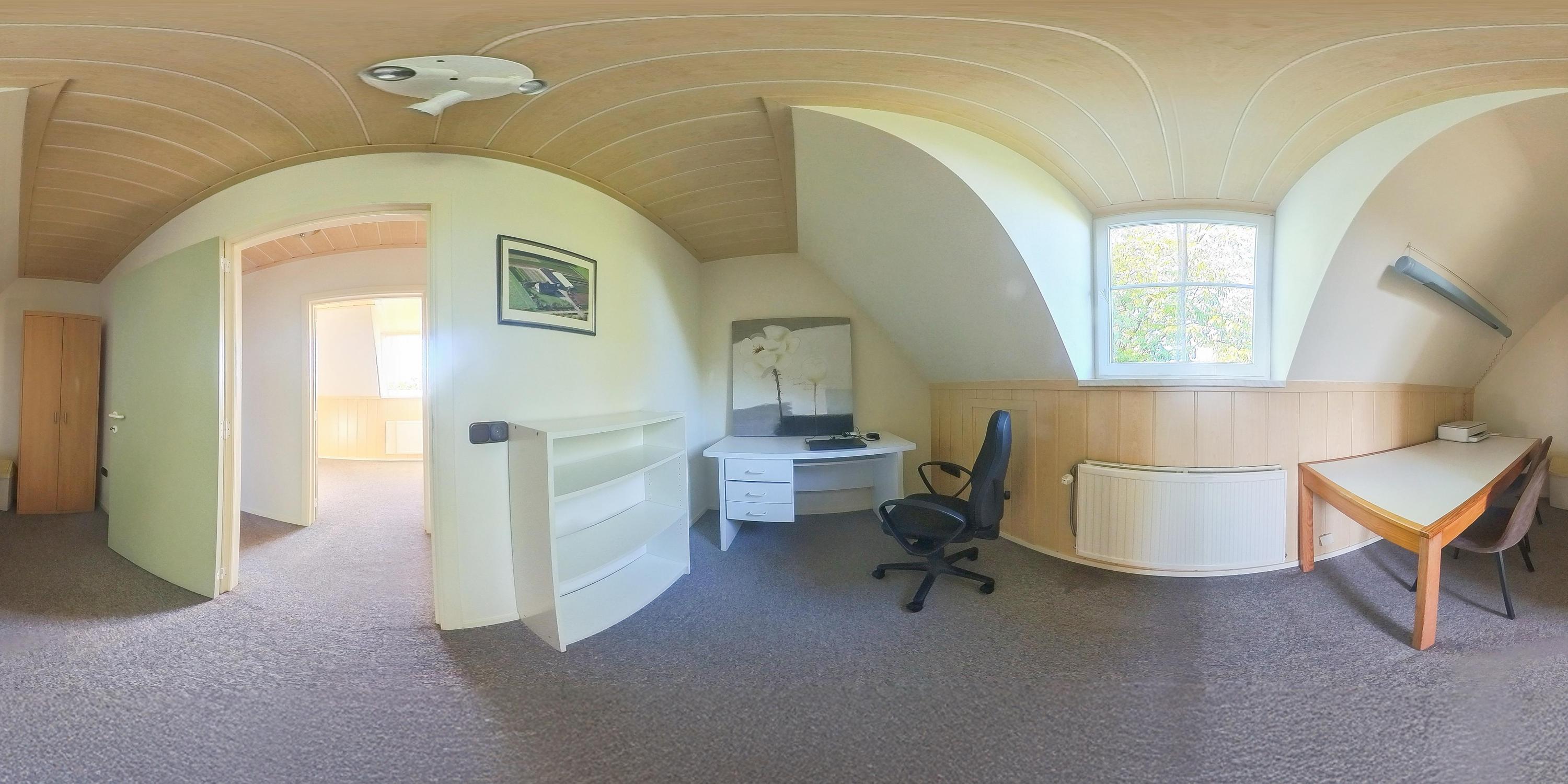 The first floor has three bedrooms, a bathroom and an attic space. All bedrooms and the attic space are carpeted. Windows provide natural light and ventilation. Storage space has been created under the sloping roof. The attic space is equipped with the central heating boiler (Vaillant) and a vacuum system. A hatch provides access to the loft.