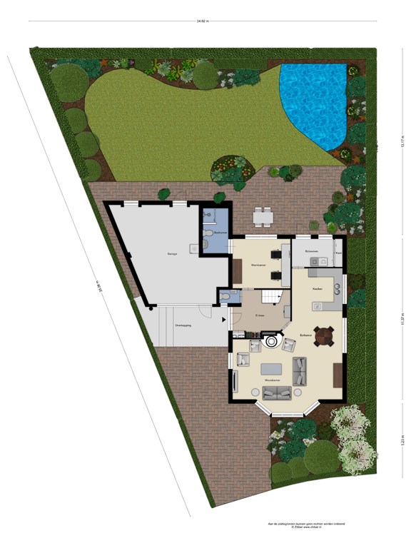 De tuin rondom is tot in de puntjes verzorgd. Aan de voorzijde biedt de brede oprit plaats aan meerdere auto’s, onder de carport staat uw auto beschut. Vanaf hier heeft u bovendien direct toegang tot de garage, met overhead- en loopdeur – een bijzonder ruime en multifunctionele ruimte van maar liefst 57 m². Ideaal voor dagelijks gebruik, voor het veilig stallen van fietsen, het uitvoeren van klusprojecten of het inrichten van een royale werk- of hobbyruimte met eigen entree. De achtertuin is een lust voor het oog: een groot zonneterras met sierbestrating, strak gazon, een vijver en borders vol kleur en variatie. Dankzij de volgroeide hagen, bomen en de achterliggende bosschage geniet u hier in alle rust en privacy. Of u nu buiten wilt ontbijten, een boek leest onder de boom of gasten ontvangt tijdens een zomeravond – het kan hier allemaal. En met directe toegang vanuit de woonkamer, bijkeuken én garage is deze tuin ook nog eens bijzonder praktisch ingedeeld.