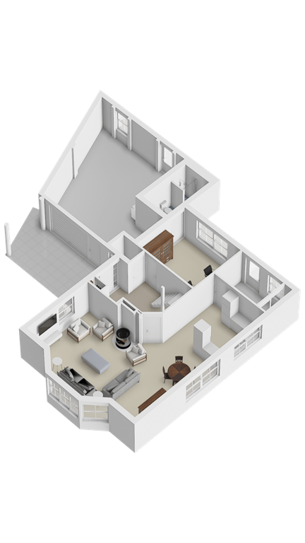 De sfeervolle woonkamer is opvallend licht dankzij de grote erker aan de voorzijde en het brede raam aan de zijkant. De zithoek rondom de open haard vormt een gezellige plek voor lange avonden met familie of vrienden. Richting de achterzijde is ruimte voor een royale eethoek bij de open keuken. De keuken is een U-opstelling met schiereiland, voorzien van crèmekleurige fronten, donker werkblad en complete inbouwapparatuur: een inductiekookplaat, vlakscherm afzuigkap, combimagnetron, oven, koel-/vriescombinatie en een vaatwasser. Aansluitend ligt de praktische bijkeuken met witgoedaansluitingen, opbergruimte en een buitendeur naar het terras. Tot slot bevindt zich op de begane grond een extra kamer – ideaal als thuiskantoor, hobbyruimte of speelkamer. Via deze kamer bereikt u binnendoor de badkamer – met douche, toilet en wastafel – handig voor wie levensbestendig wil wonen of gasten ontvangt.