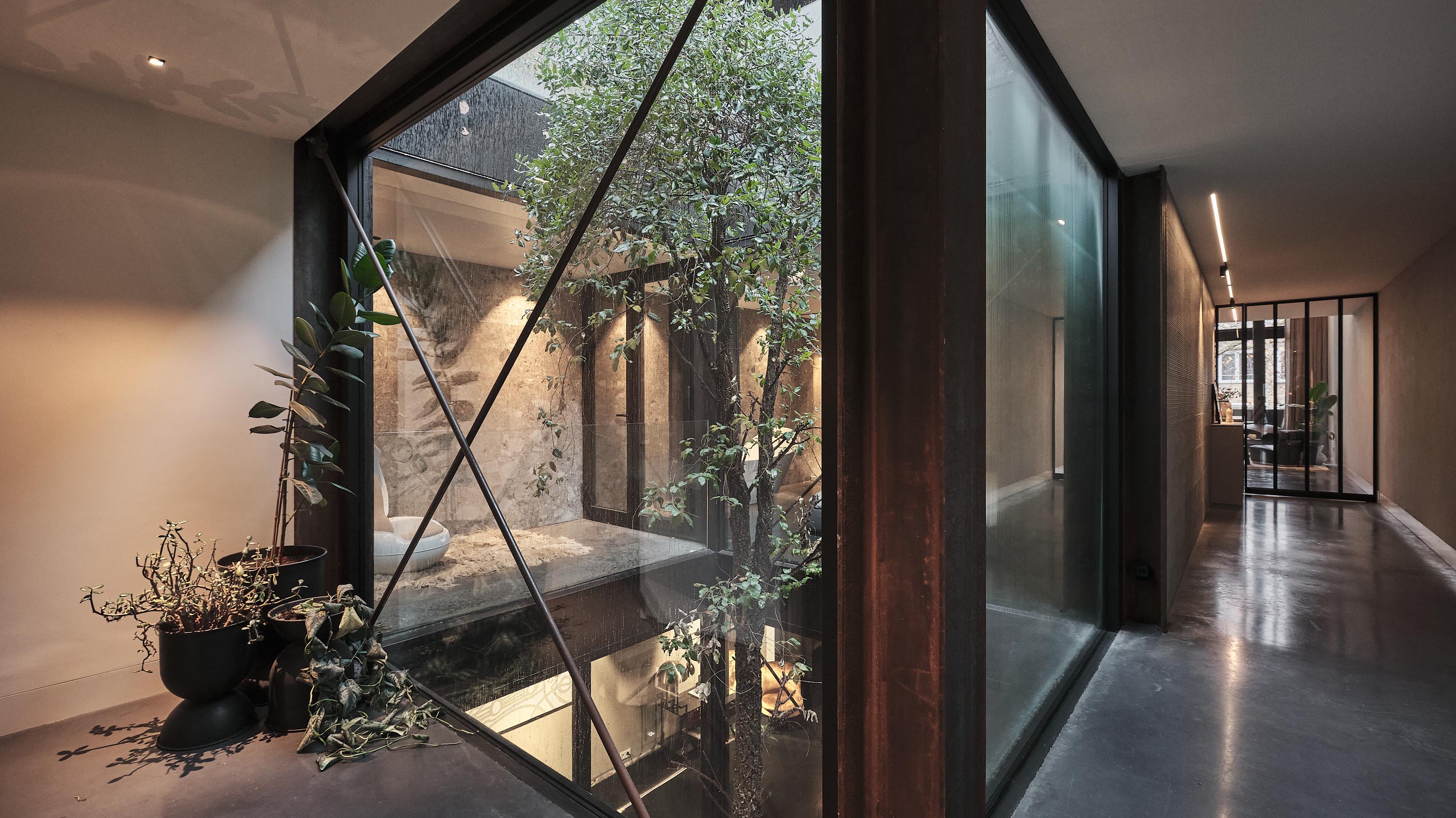 De woning aan de Cedron vormt een serene oase met hoogwaardige materialen en een iconische verticale glazen schacht met een Toscaanse kurkeik als levende sculptuur. De presentatieruimte aan de Nieuwstraat is juist een ingetogen, doordachte werkruimte waarin helderheid, focus en creativiteit centraal staan.
