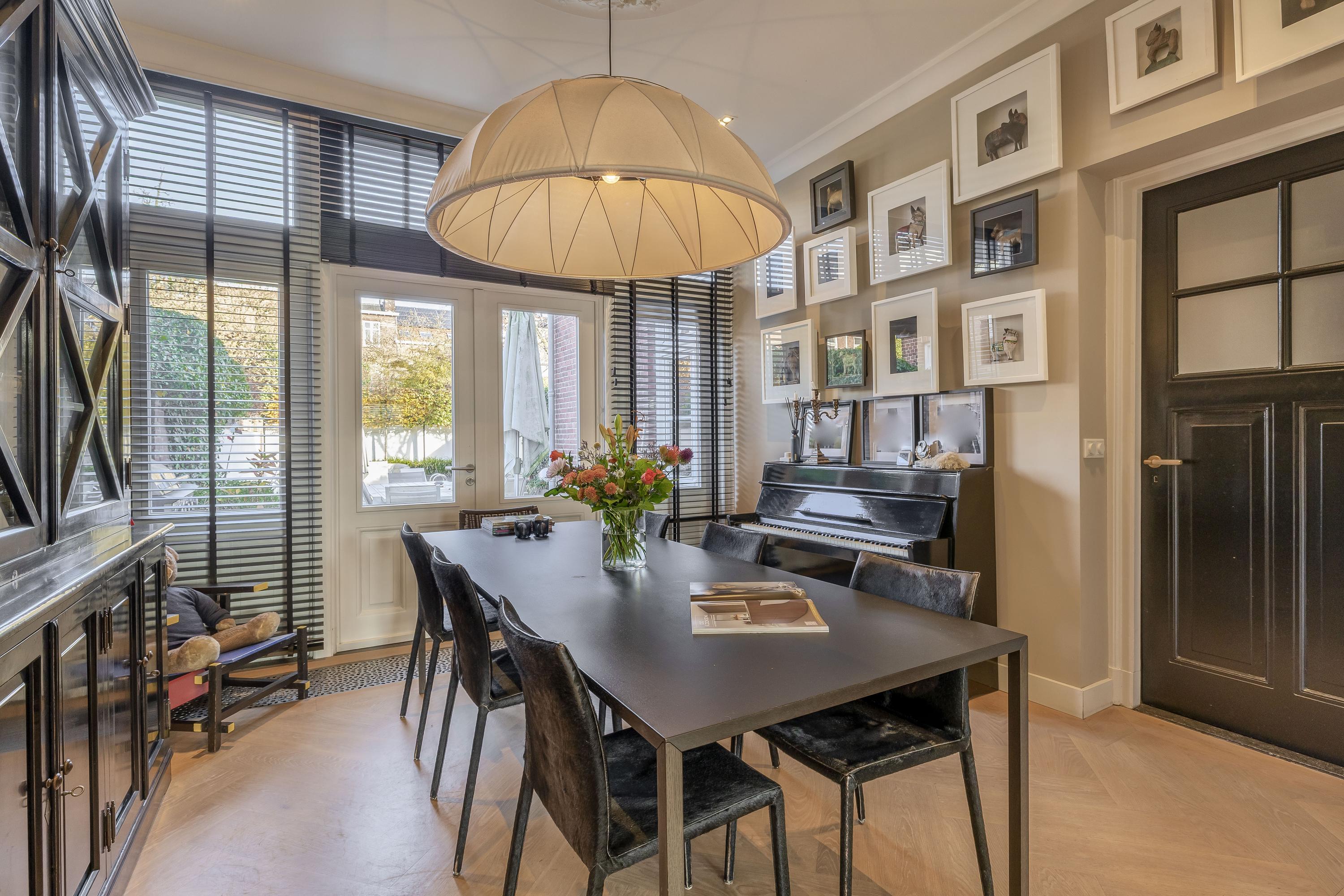 The deep and wide living room is fitted with extra-wide French oak herringbone parquet flooring. The impressive high ceiling features original ornaments and cornices with integrated dimmable lighting. At the front, you enjoy unobstructed views of the Rosarium. A gas fireplace adds extra ambience, while the air conditioning provides both cooling and heating. Due to the raised position of the windows relative to the pavement, there is no visibility from outside. At the rear, French doors open directly onto the garden.