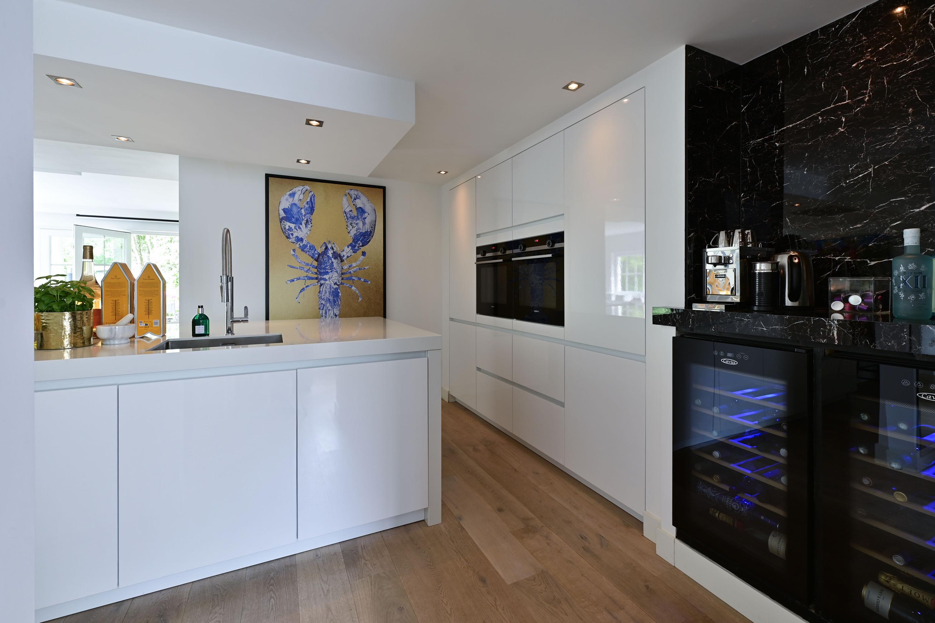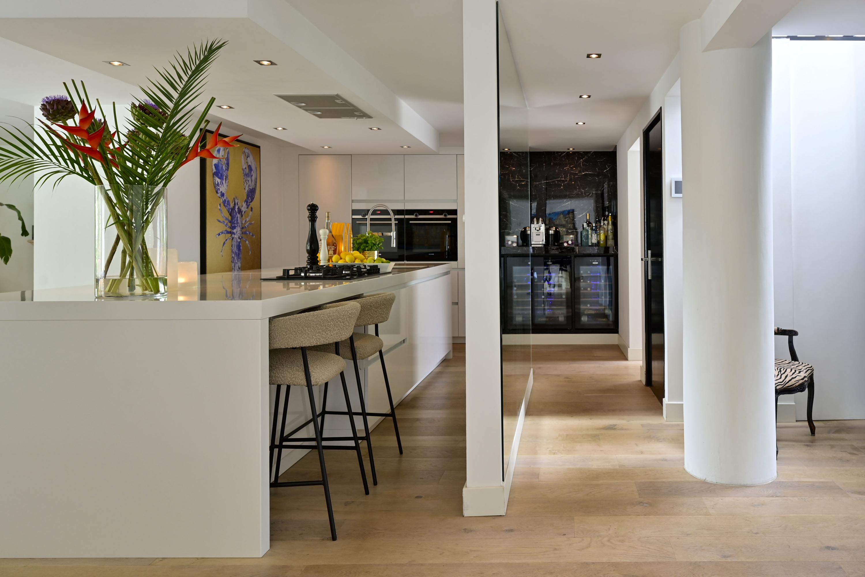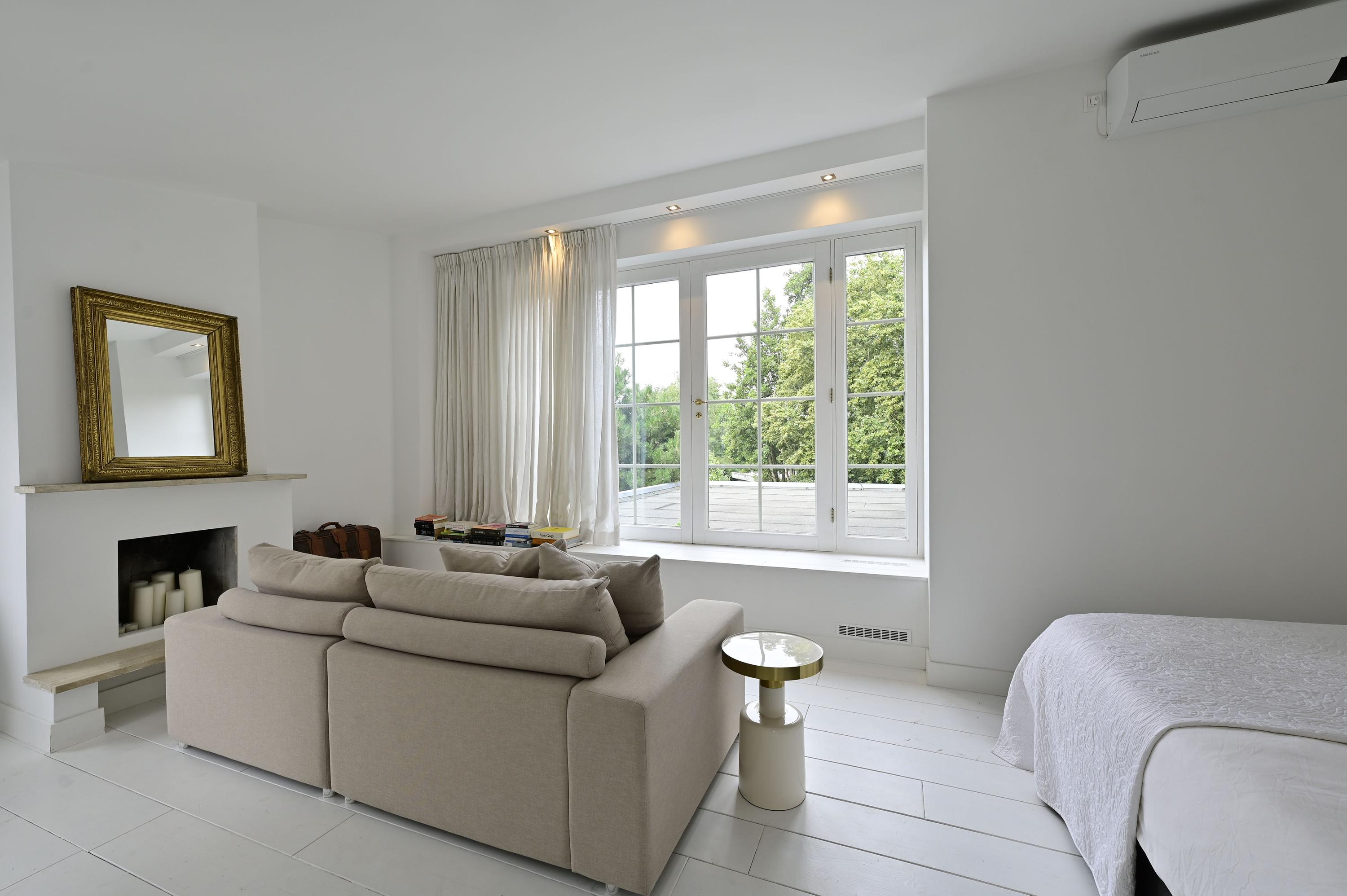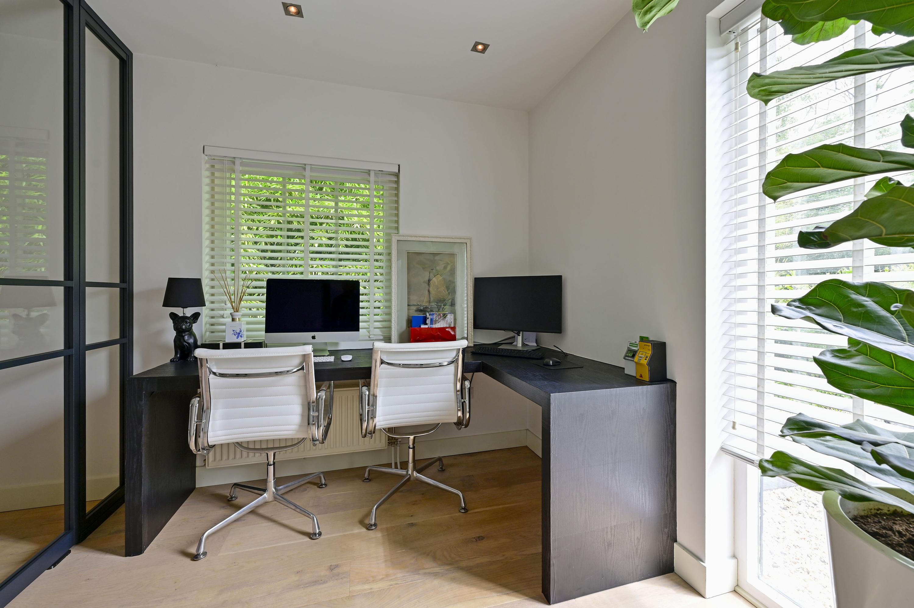 Inside, the home offers a spacious and bright living area where the kitchen, dining room and living room flow seamlessly together. The luxurious open-plan kitchen with cooking island is equipped with high-end Siemens built-in appliances, including two ovens, two dishwashers and two wine climate cabinets. Adjacent are a practical utility room and a modern office with a stylish pivot door.