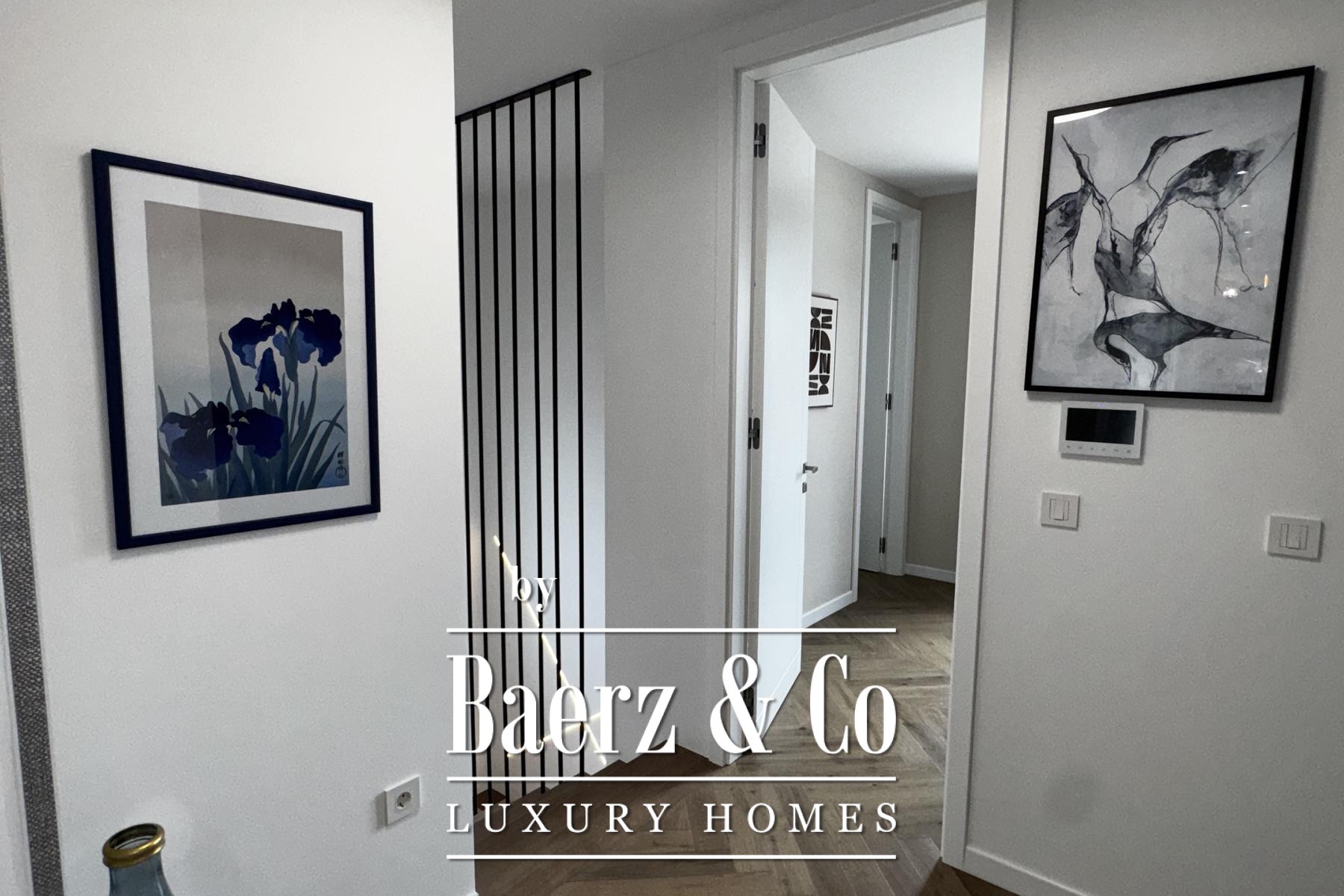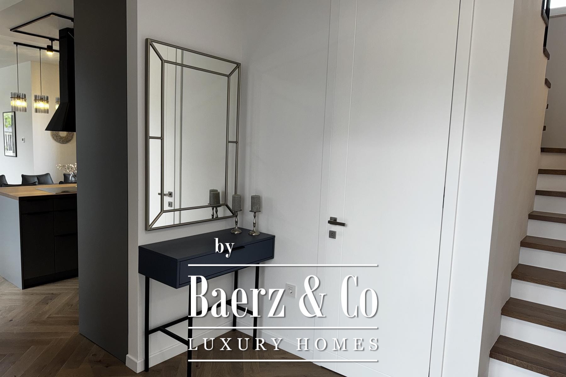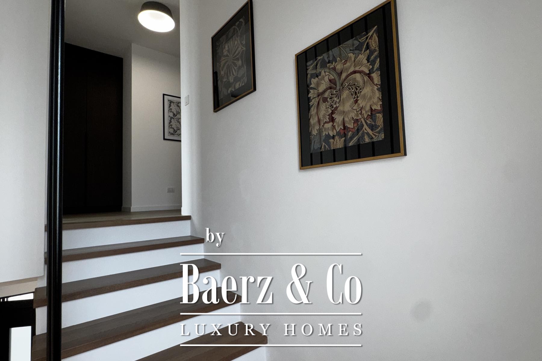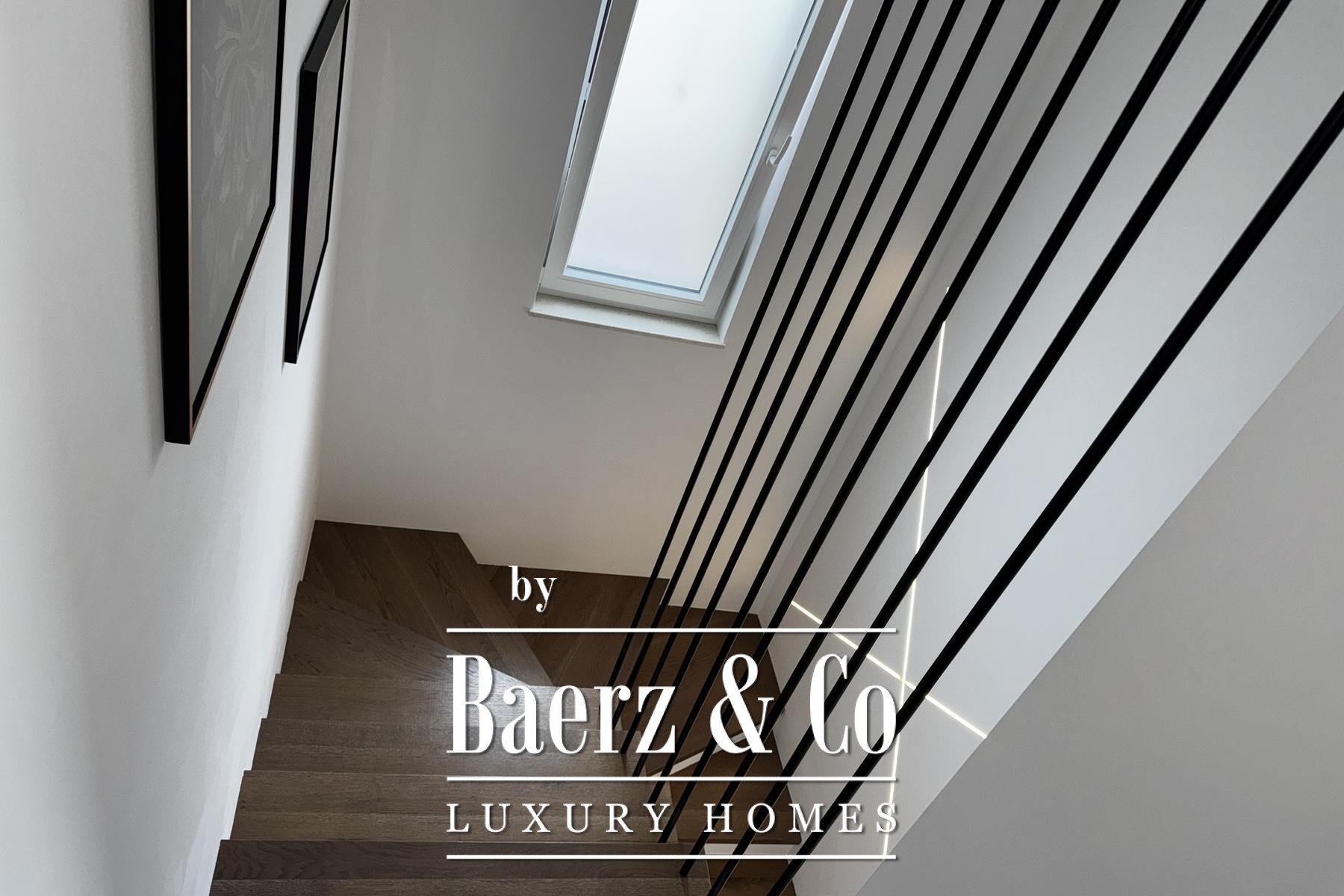 Upstairs, three bedrooms, including a master suite with walk-in wardrobe and a secondary suite with private bathroom and terrace access, deliver a thoughtful balance of privacy and light. Rich materiality abounds: three-layer parquet flooring, solid wood stairs, full-height doors, and quality finishes establish an atmosphere of understated elegance.