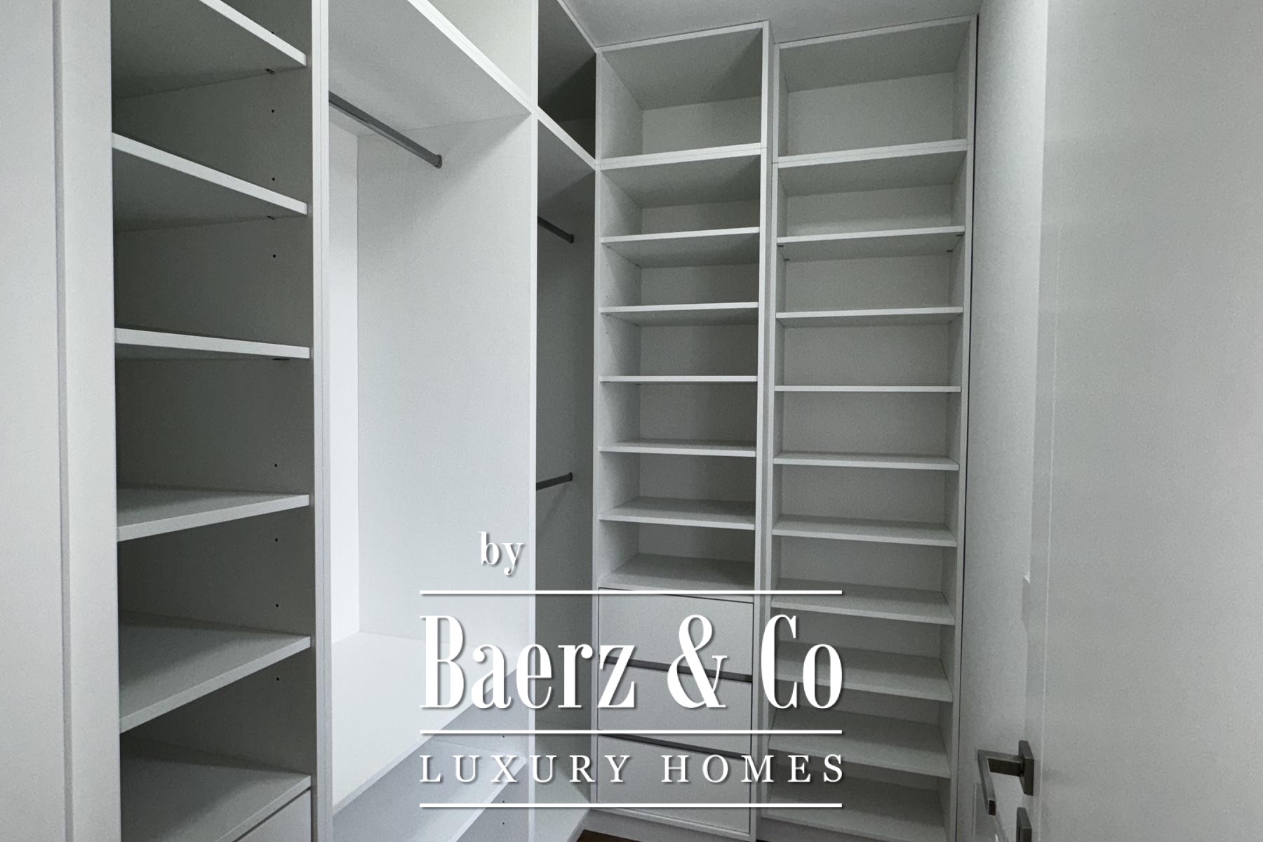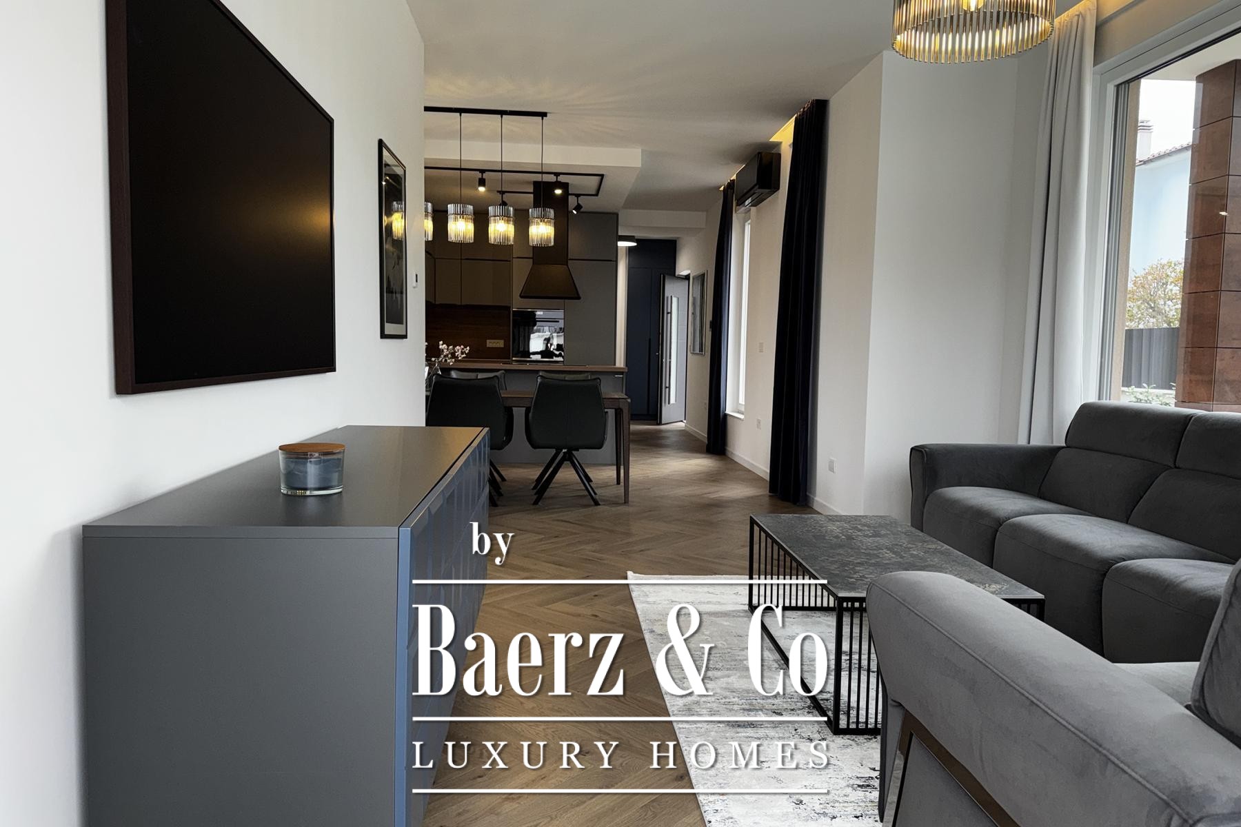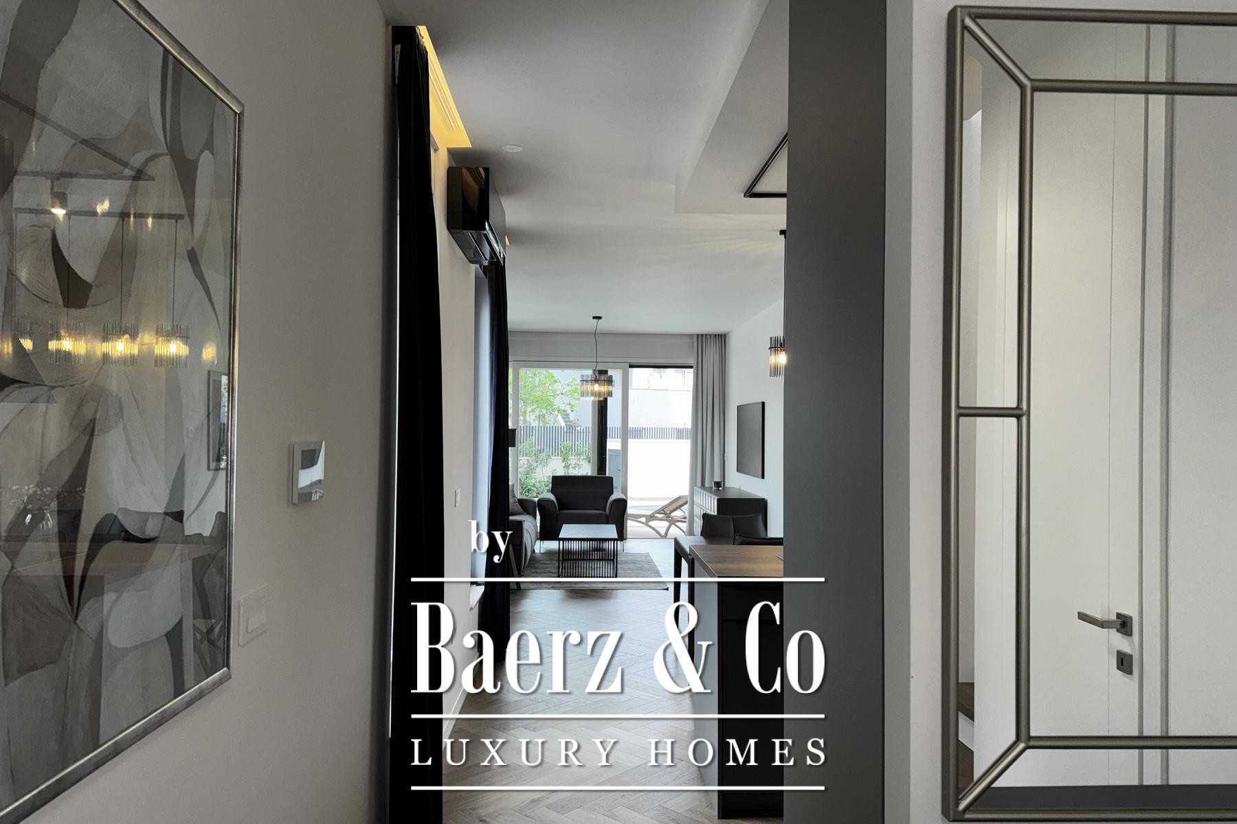 Upstairs, three bedrooms, including a master suite with walk-in wardrobe and a secondary suite with private bathroom and terrace access, deliver a thoughtful balance of privacy and light. Rich materiality abounds: three-layer parquet flooring, solid wood stairs, full-height doors, and quality finishes establish an atmosphere of understated elegance.