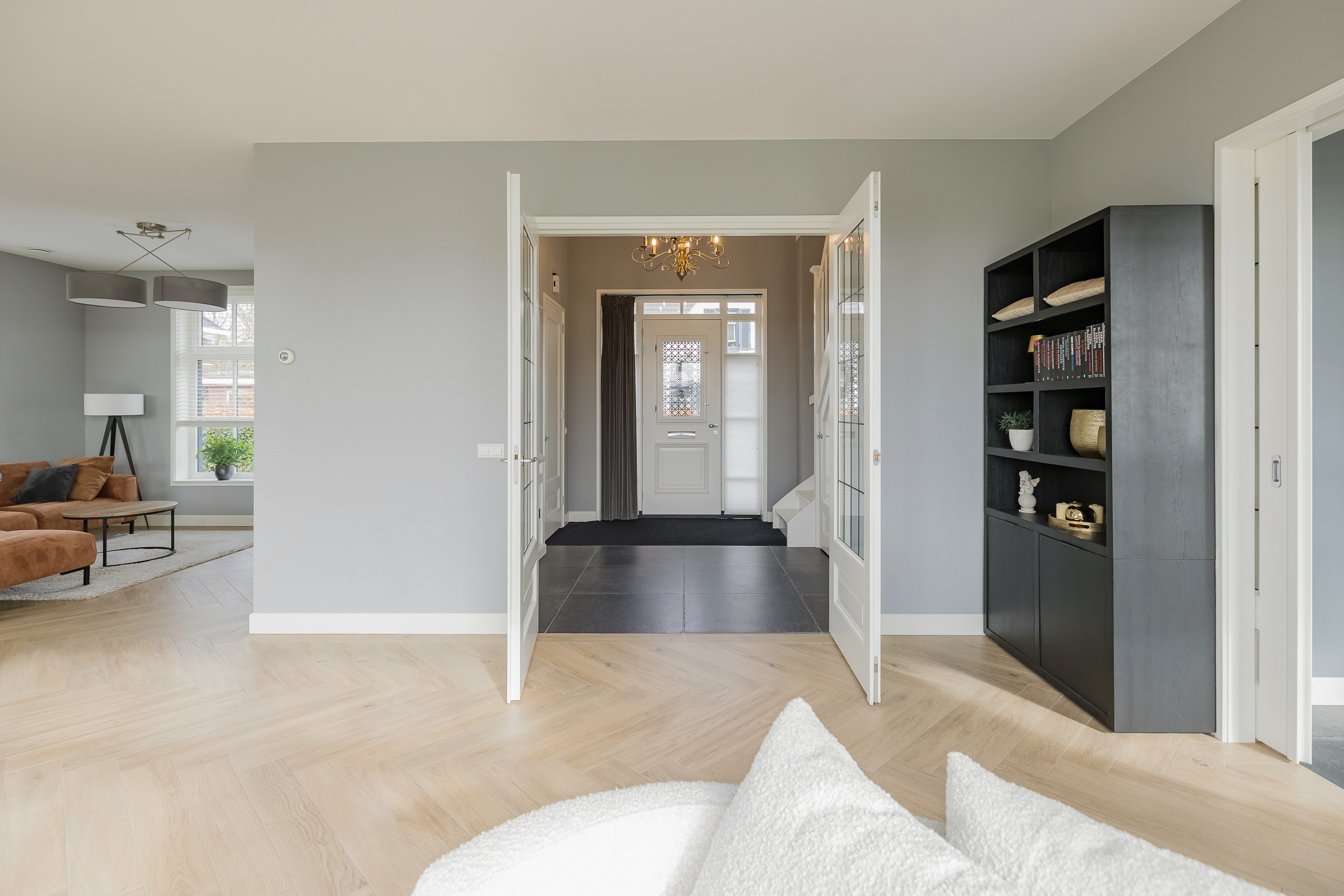The living room is spacious and bright thanks to the large windows with white muntin bars and French doors leading to the terrace and the surrounding garden. The floor features stylish light wood flooring. At the rear, you can enjoy a fantastic unobstructed view of the bulb fields.
