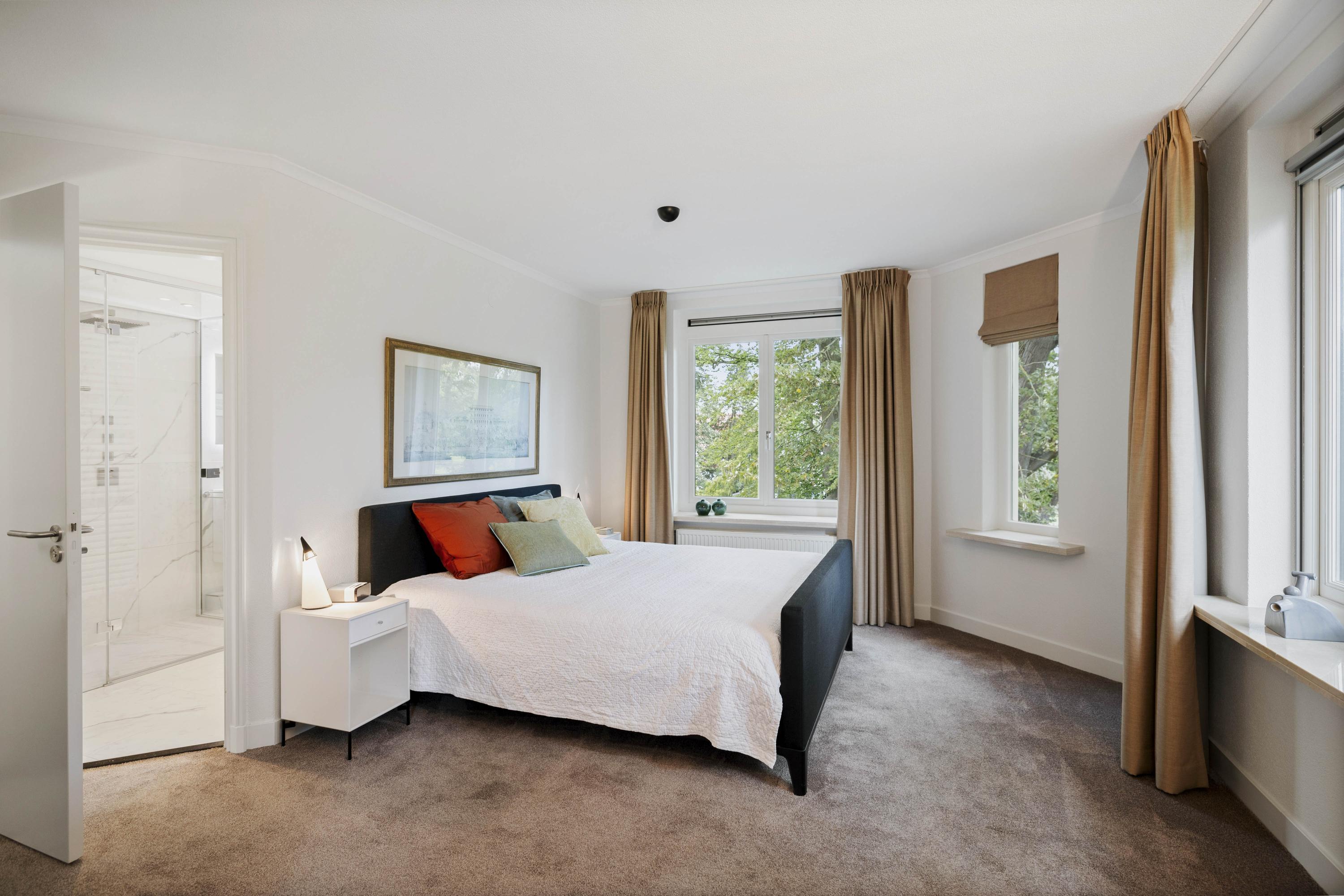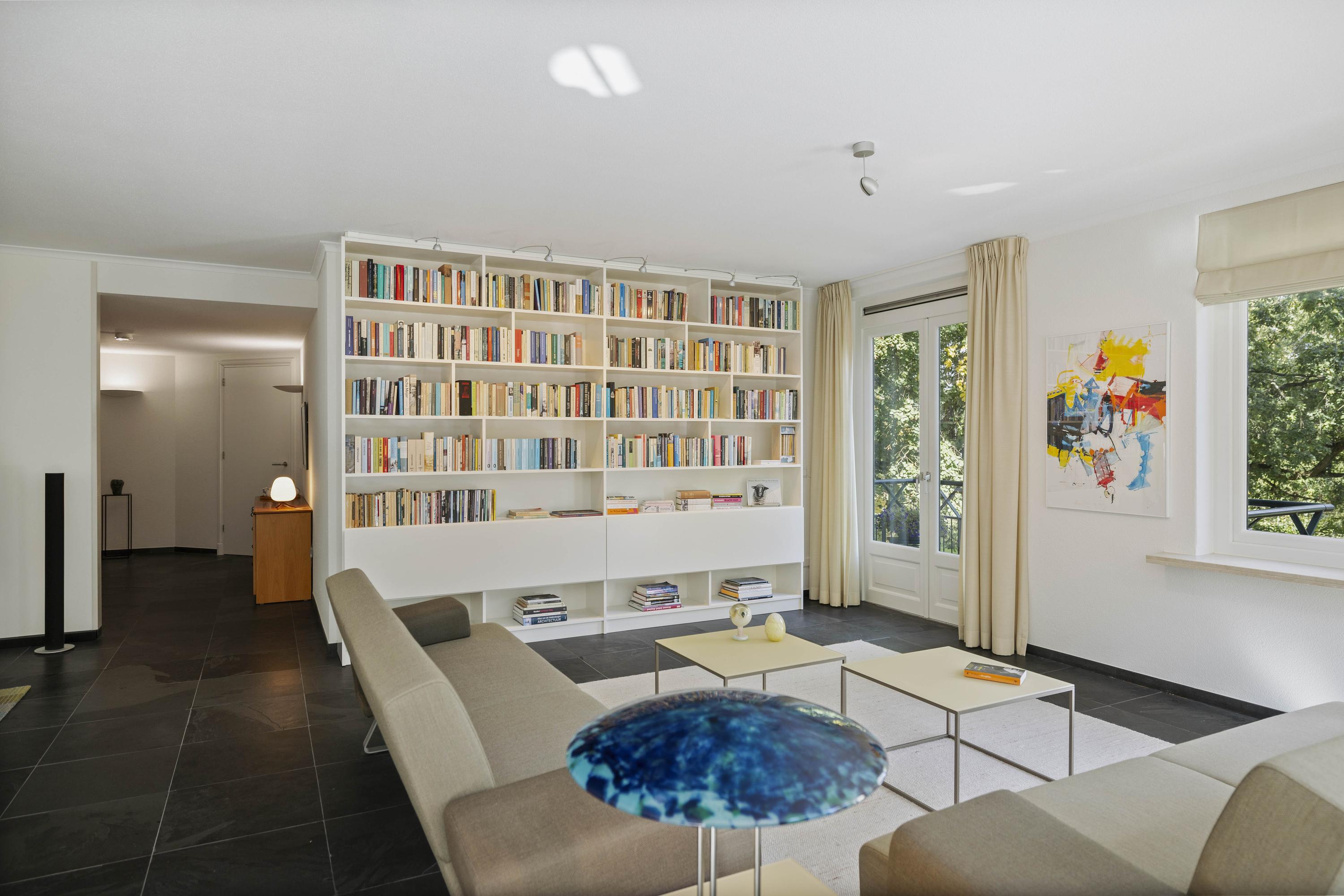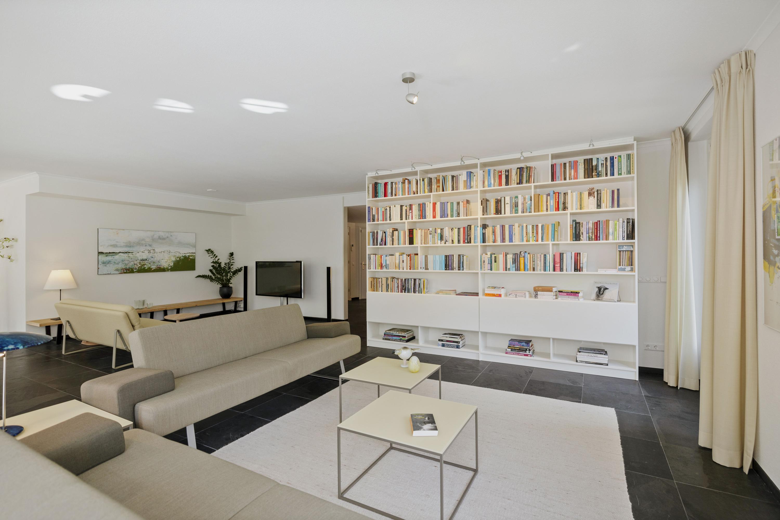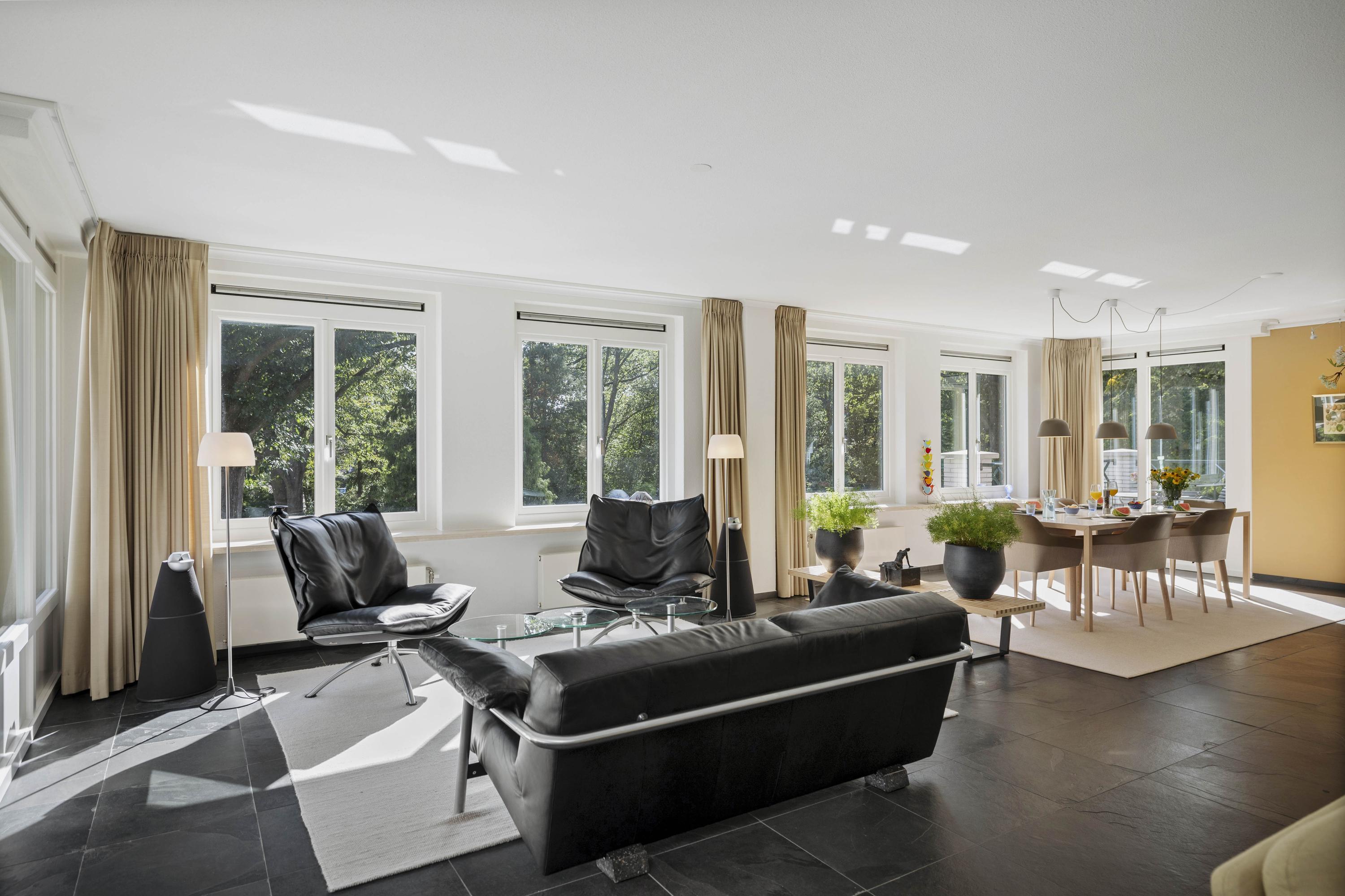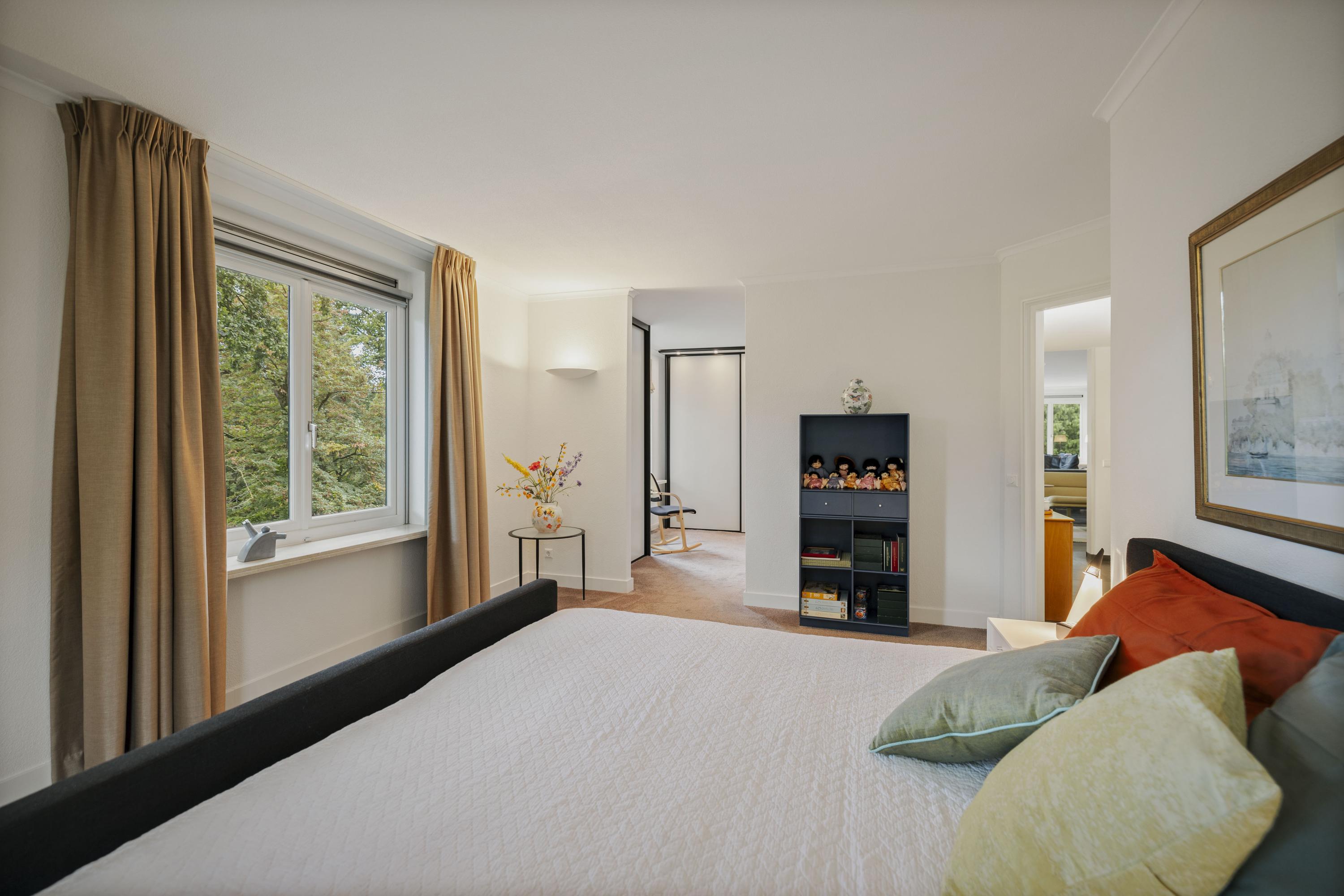 The flat is accessible from the central entrance, both by stairs and by lift. The private entrance is a spacious reception hall. Here you will find a guest toilet and access to the living room and the master bedroom. The living room is very spacious and light because of the numerous windows. In the heart of the room is a beautiful modern open gas fireplace. On the floor Brazilian slate. The kitchen is equipped with a black granite top with light yellow fronts and includes a pharmacy cabinet. All the necessary appliances (Miele) are available, including a five-burner induction hob. From the hall you can also reach the bright master bedroom with a fantastic spacious walk-in closet (15 m2) and a lovely bathroom. In 2017, it was completely renovated and equipped with a steam/shower cabin with rain, neck and hand shower, a Geberit shower toilet, bath furniture, double wash basins with Dornbracht taps, a towel radiator and underfloor heating. Connected tot the living room is a spacious study en suite, which can be closed off with glass sliding doors. Along the second hall are the second and third bedroom, and the second bathroom. The third bedroom is now in use as a second study. The bathroom is bright and spacious, with a walk-in shower, bathtub, toilet and double wash basin. On the right side of the hall, you’ll find access to the utility room with a stainless steel sink, the central heating boiler (2021), washing machine and dryer, water softener and storage.