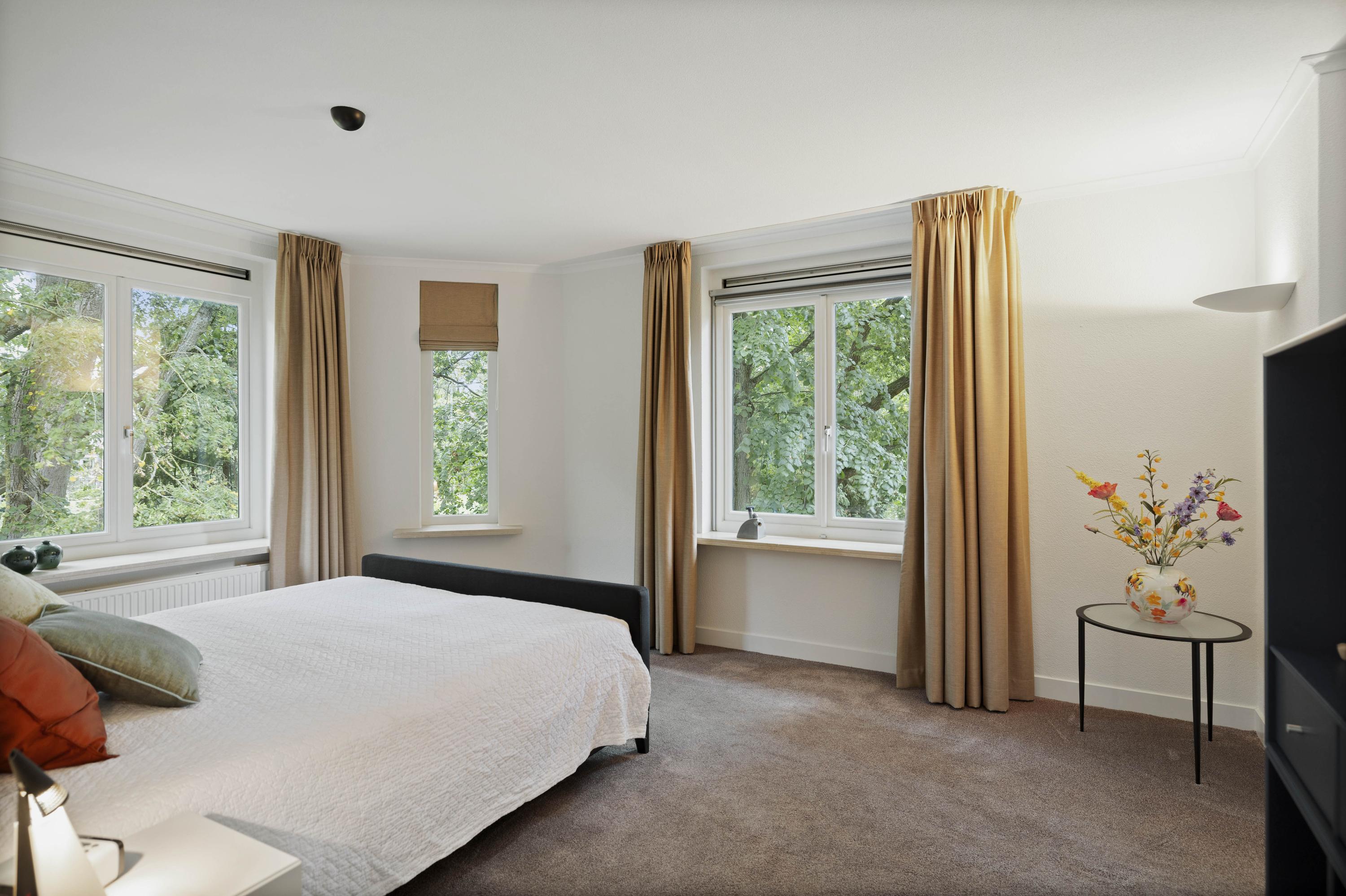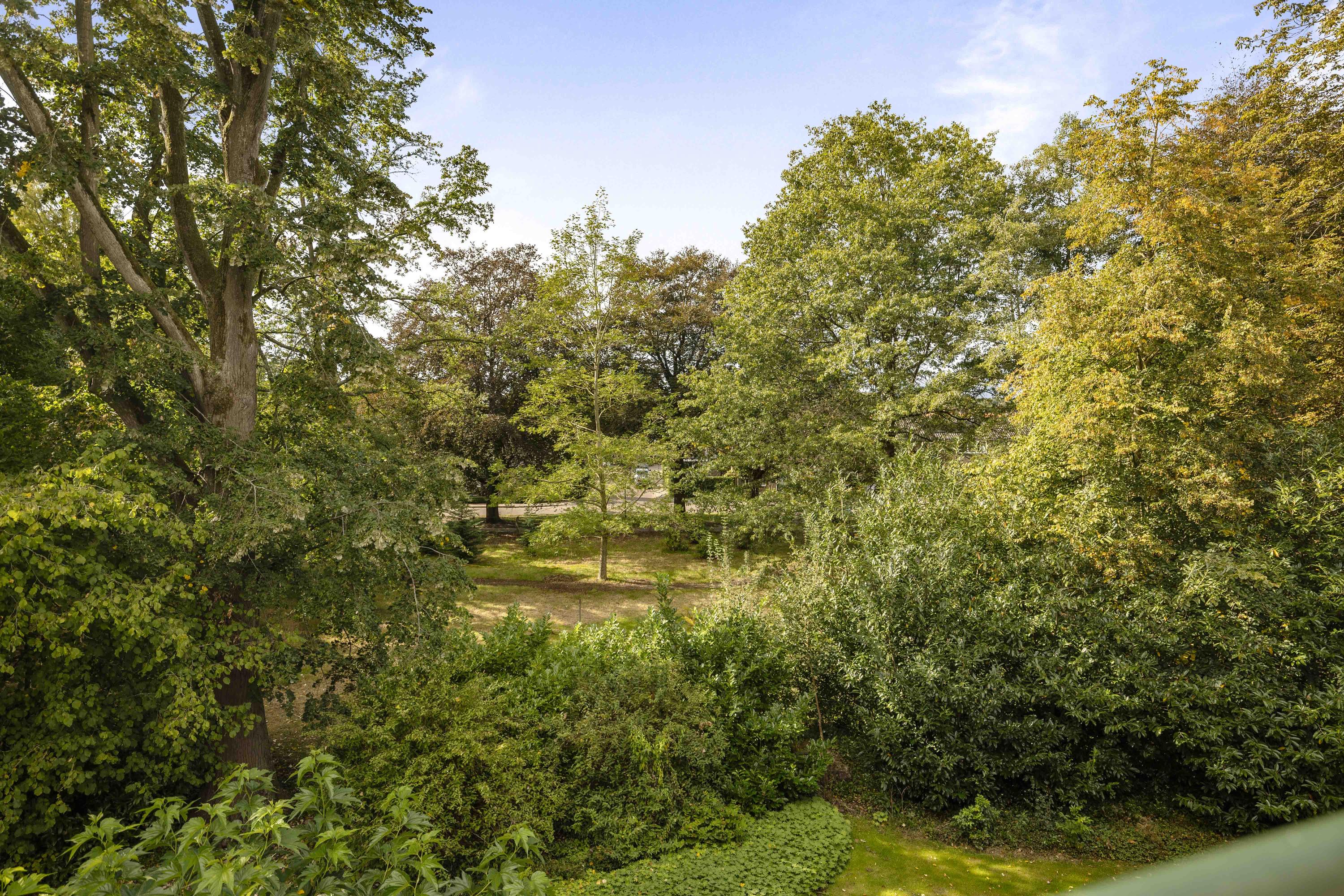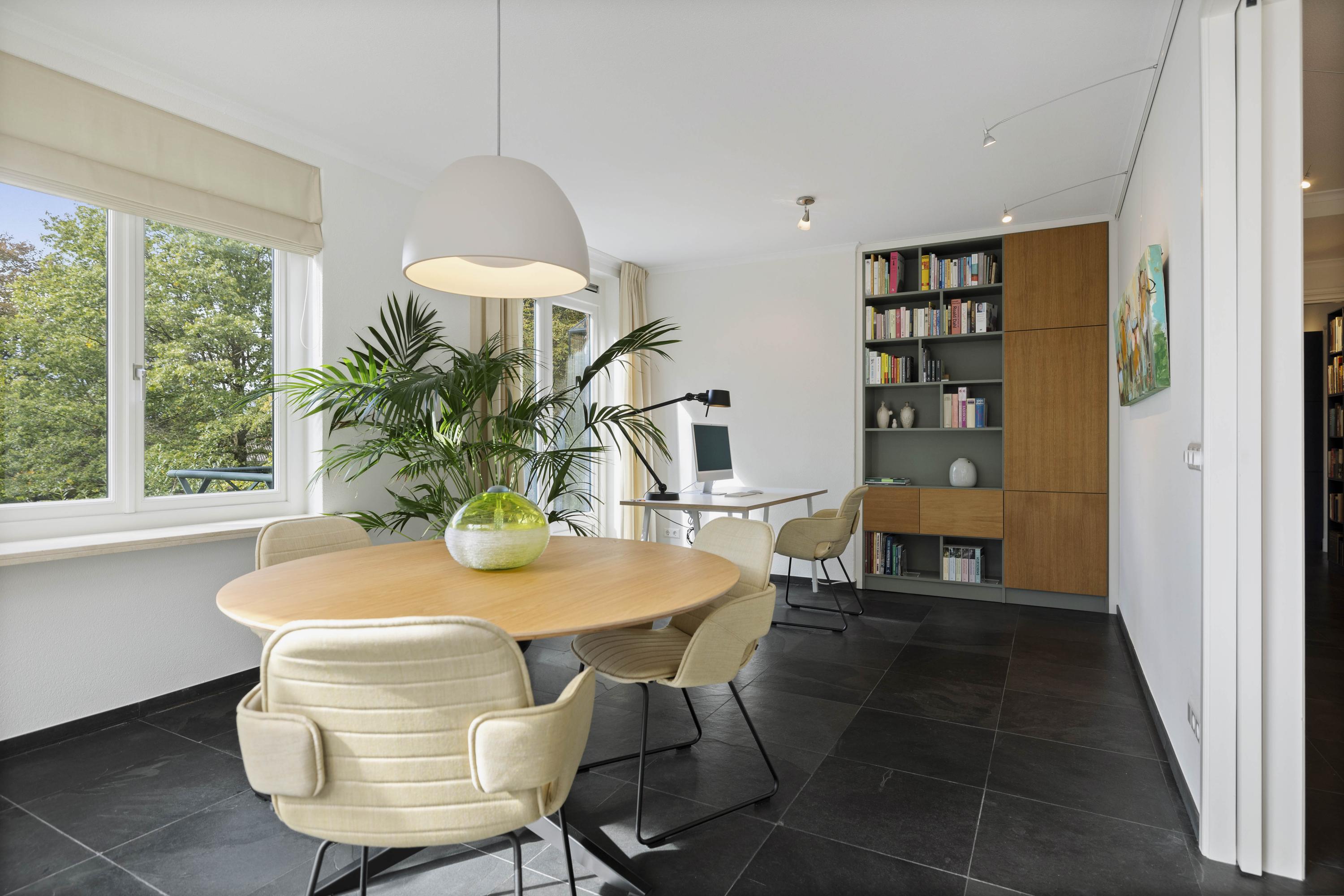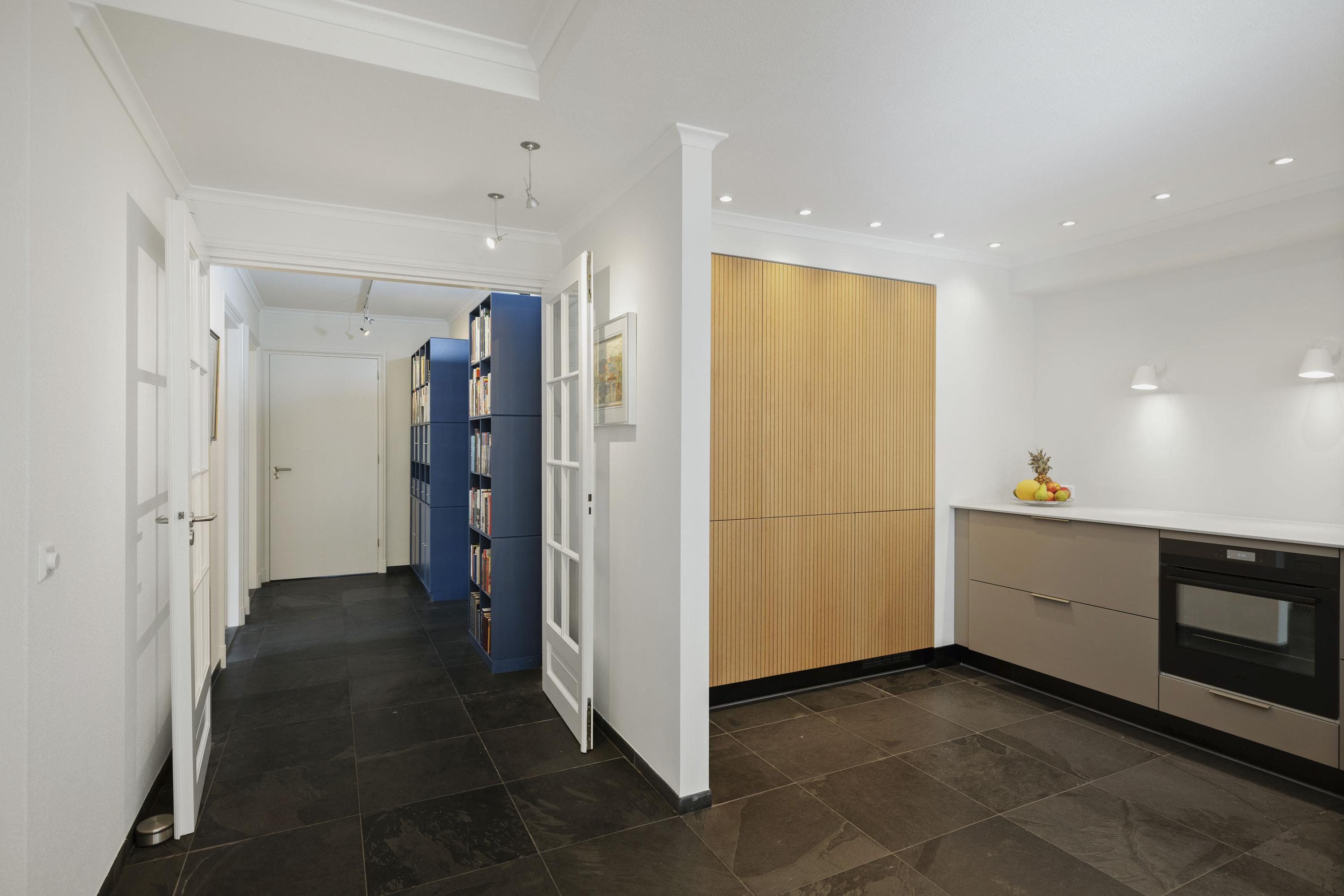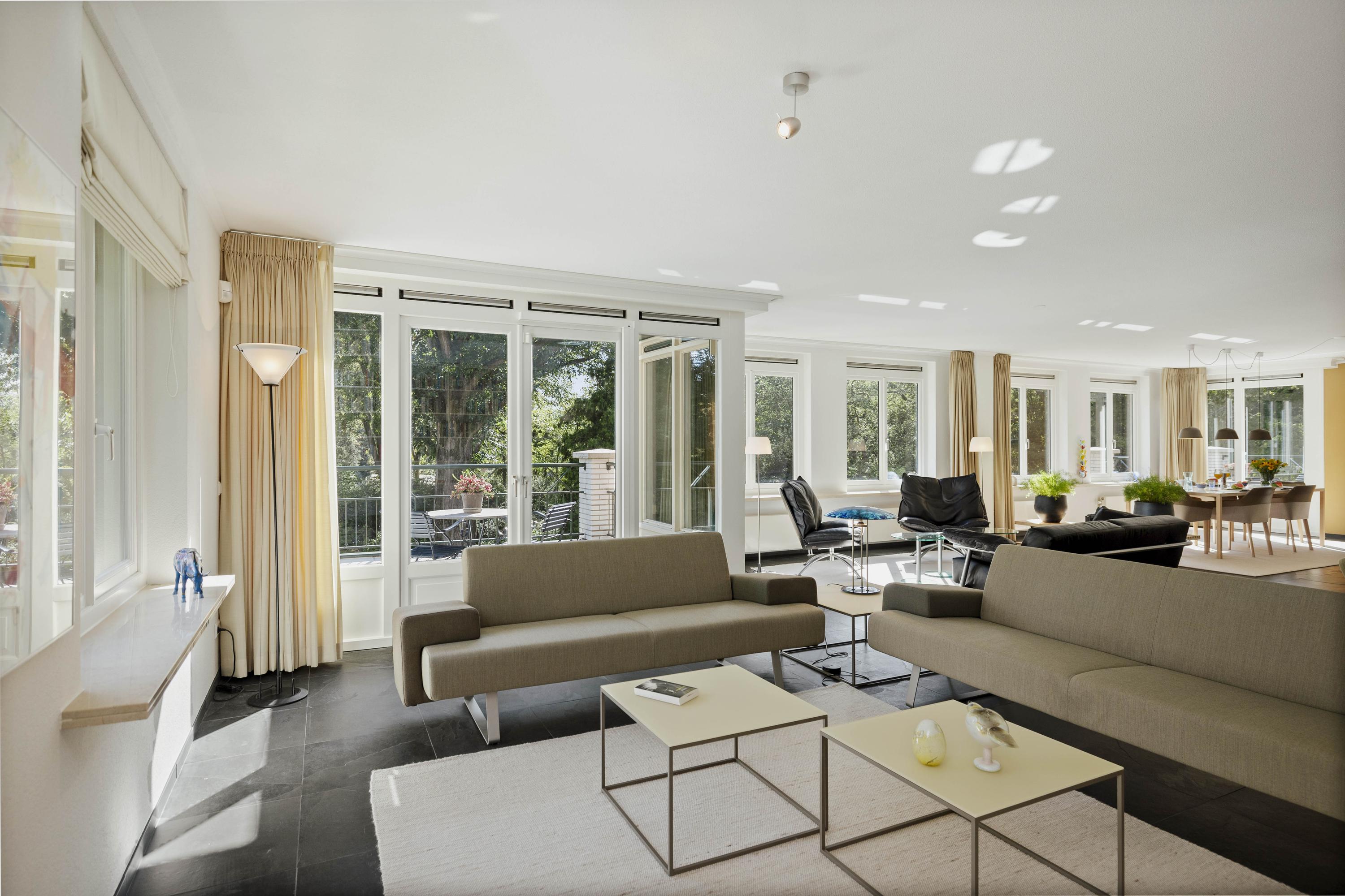The flat is accessible from the central entrance, both by stairs and by lift. The private entrance is a spacious reception hall. Here you will find a guest toilet and access to the living room and the master bedroom. The living room is very spacious and light because of the numerous windows. In the heart of the room is a beautiful modern open gas fireplace. On the floor Brazilian slate. The kitchen is equipped with a black granite top with light yellow fronts and includes a pharmacy cabinet. All the necessary appliances (Miele) are available, including a five-burner induction hob. From the hall you can also reach the bright master bedroom with a fantastic spacious walk-in closet (15 m2) and a lovely bathroom. In 2017, it was completely renovated and equipped with a steam/shower cabin with rain, neck and hand shower, a Geberit shower toilet, bath furniture, double wash basins with Dornbracht taps, a towel radiator and underfloor heating. Connected tot the living room is a spacious study en suite, which can be closed off with glass sliding doors. Along the second hall are the second and third bedroom, and the second bathroom. The third bedroom is now in use as a second study. The bathroom is bright and spacious, with a walk-in shower, bathtub, toilet and double wash basin. On the right side of the hall, you’ll find access to the utility room with a stainless steel sink, the central heating boiler (2021), washing machine and dryer, water softener and storage.