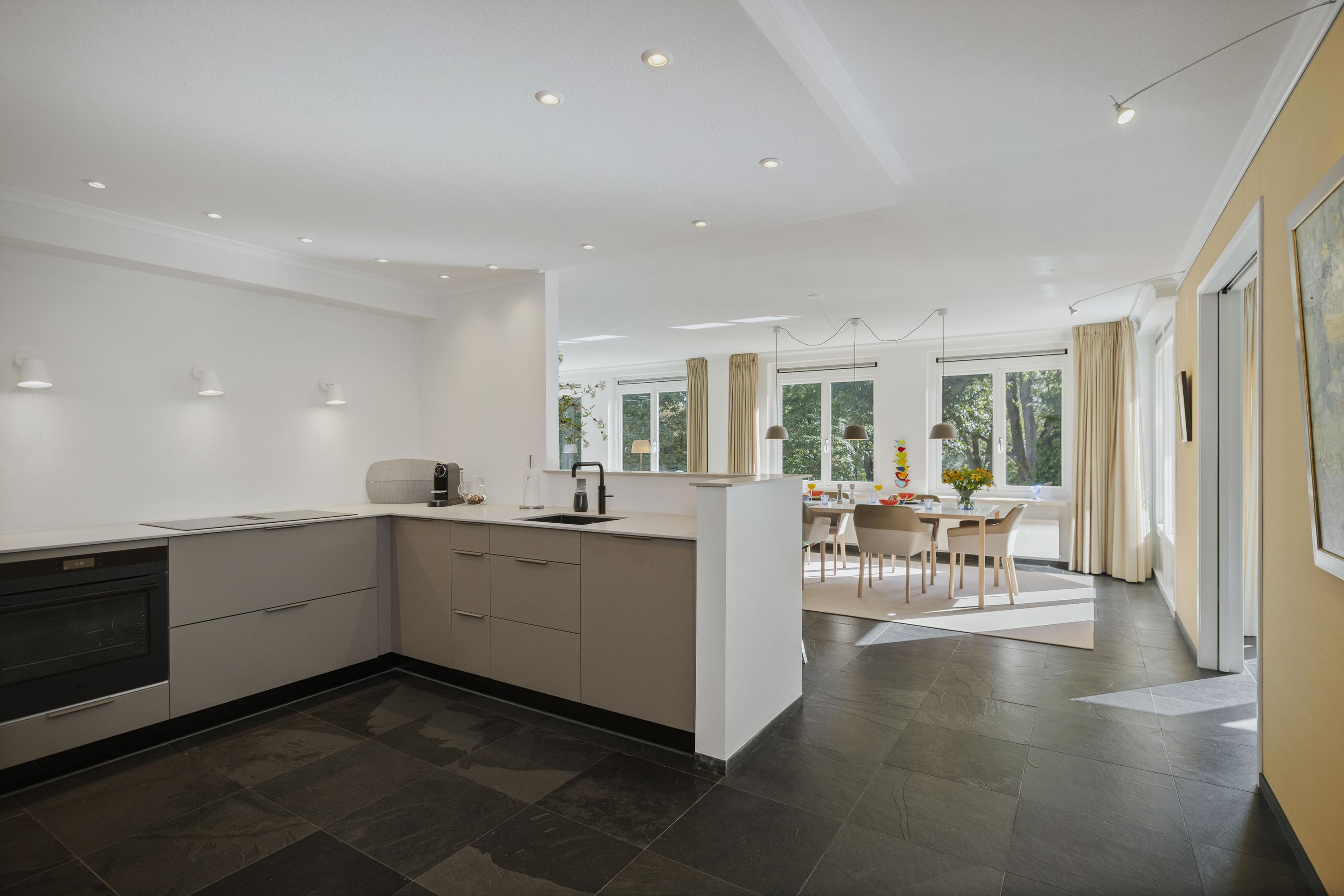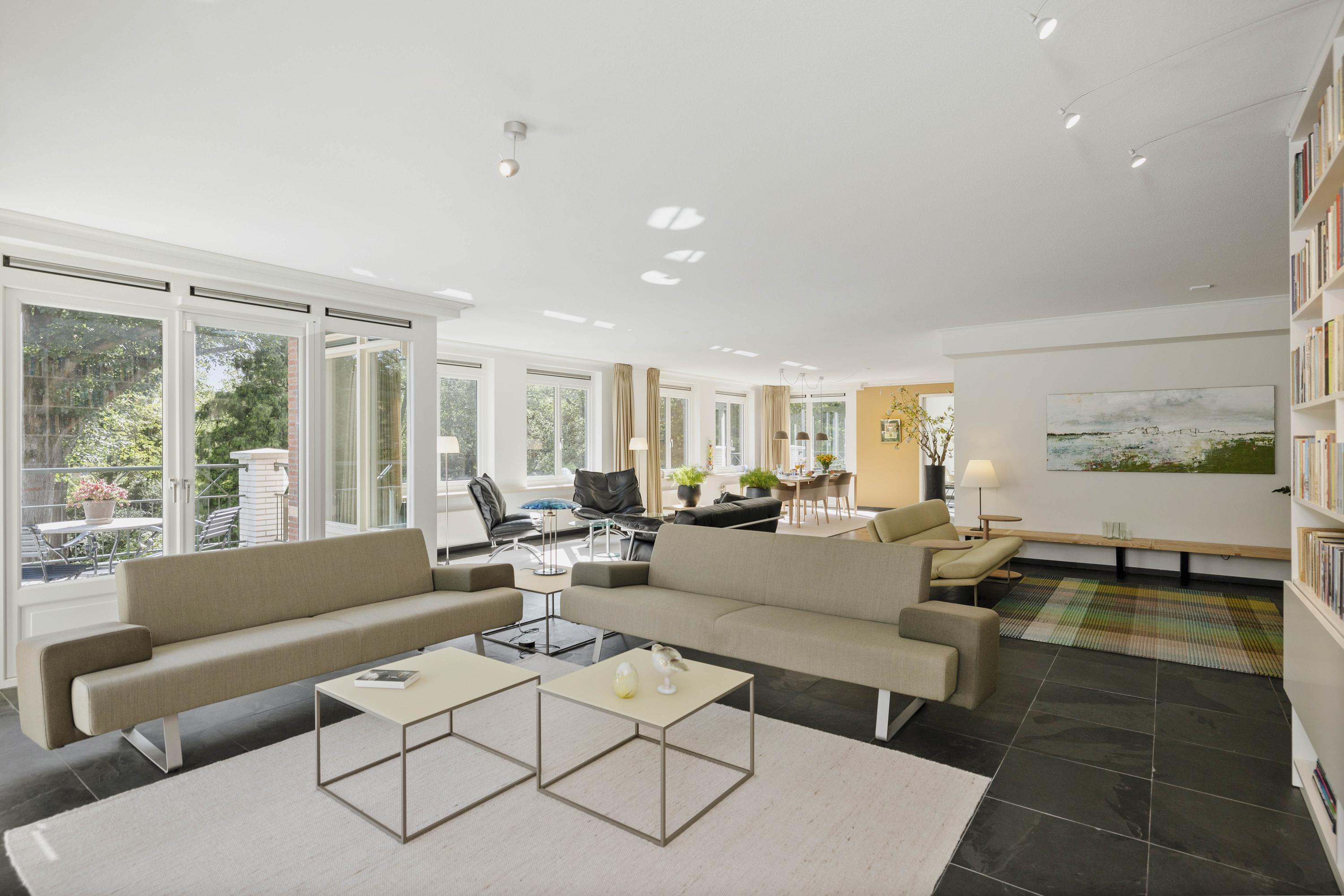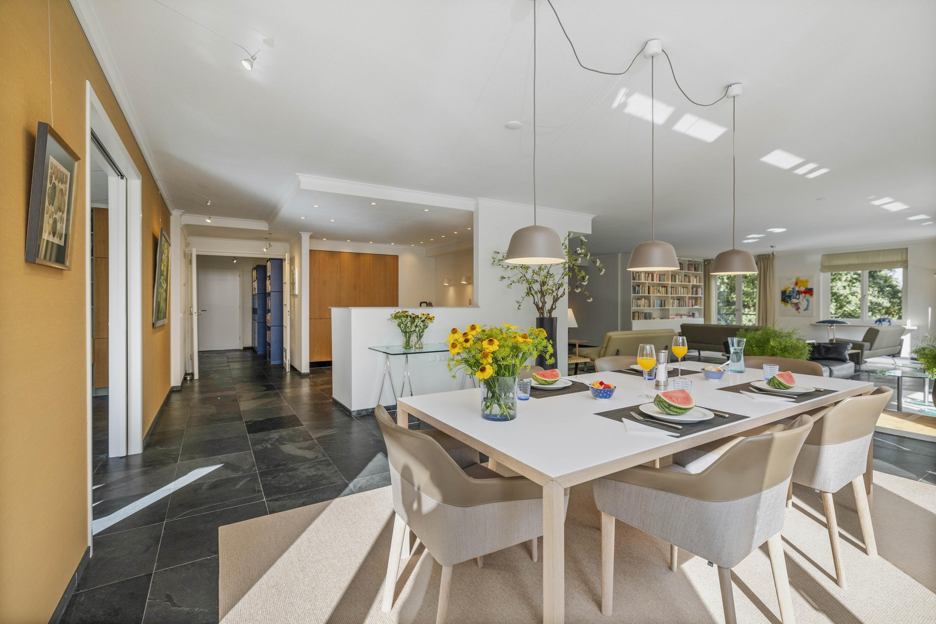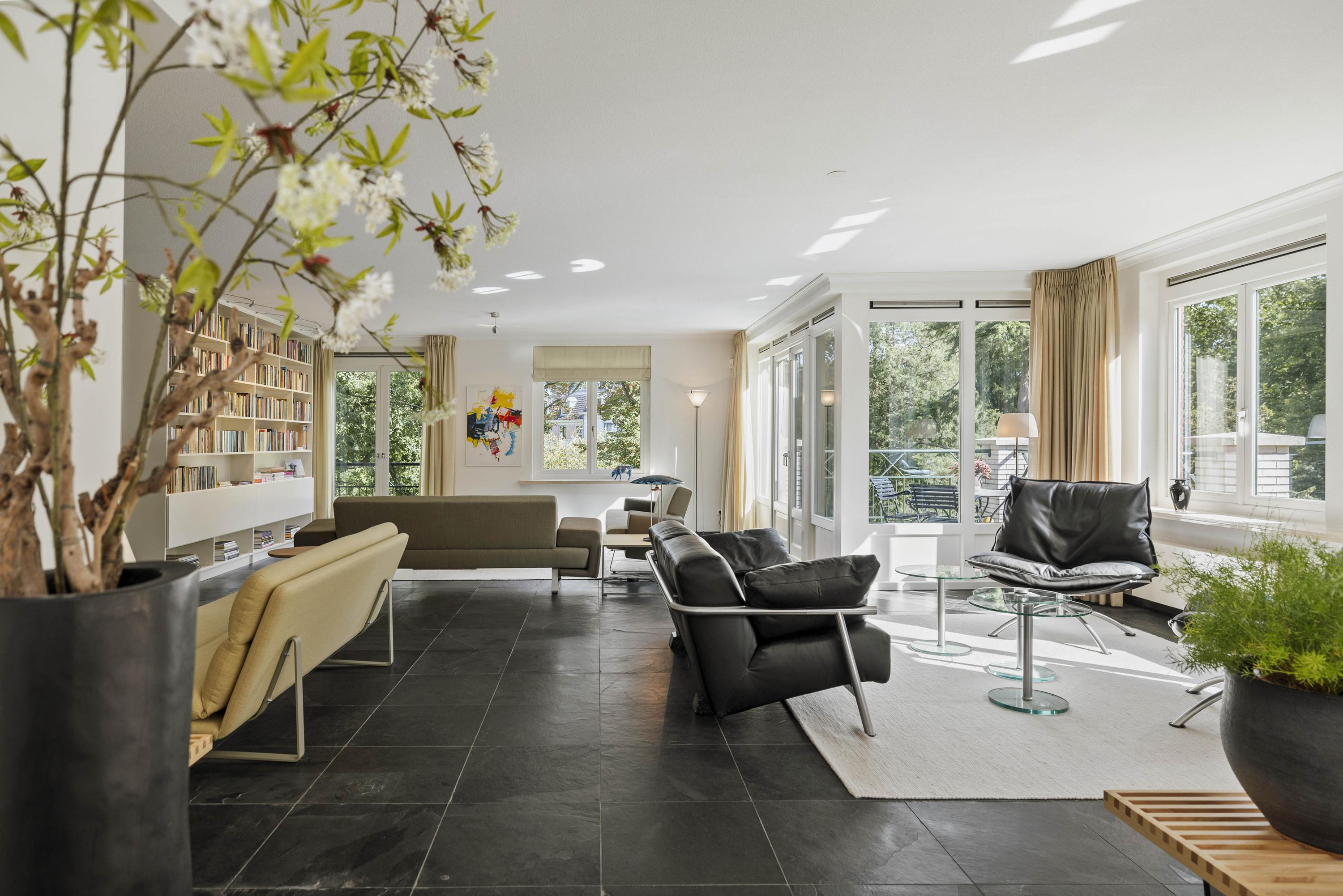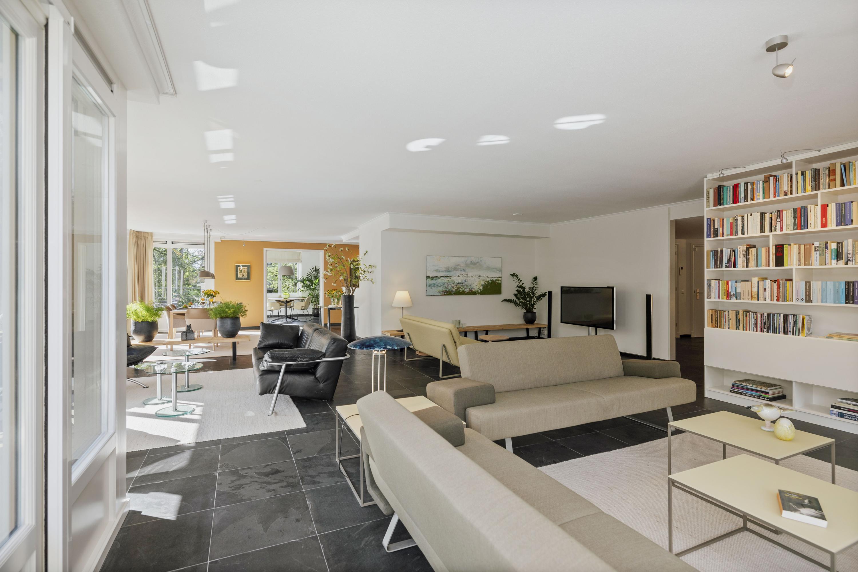 The flat is accessible from the central entrance, both by stairs and by lift. The private entrance is a spacious reception hall. Here you will find a guest toilet and access to the living room and the master bedroom. The living room is very spacious and light because of the numerous windows. In the heart of the room is a beautiful modern open gas fireplace. On the floor Brazilian slate. The kitchen is equipped with a black granite top with light yellow fronts and includes a pharmacy cabinet. All the necessary appliances (Miele) are available, including a five-burner induction hob. From the hall you can also reach the bright master bedroom with a fantastic spacious walk-in closet (15 m2) and a lovely bathroom. In 2017, it was completely renovated and equipped with a steam/shower cabin with rain, neck and hand shower, a Geberit shower toilet, bath furniture, double wash basins with Dornbracht taps, a towel radiator and underfloor heating. Connected tot the living room is a spacious study en suite, which can be closed off with glass sliding doors. Along the second hall are the second and third bedroom, and the second bathroom. The third bedroom is now in use as a second study. The bathroom is bright and spacious, with a walk-in shower, bathtub, toilet and double wash basin. On the right side of the hall, you’ll find access to the utility room with a stainless steel sink, the central heating boiler (2021), washing machine and dryer, water softener and storage.
