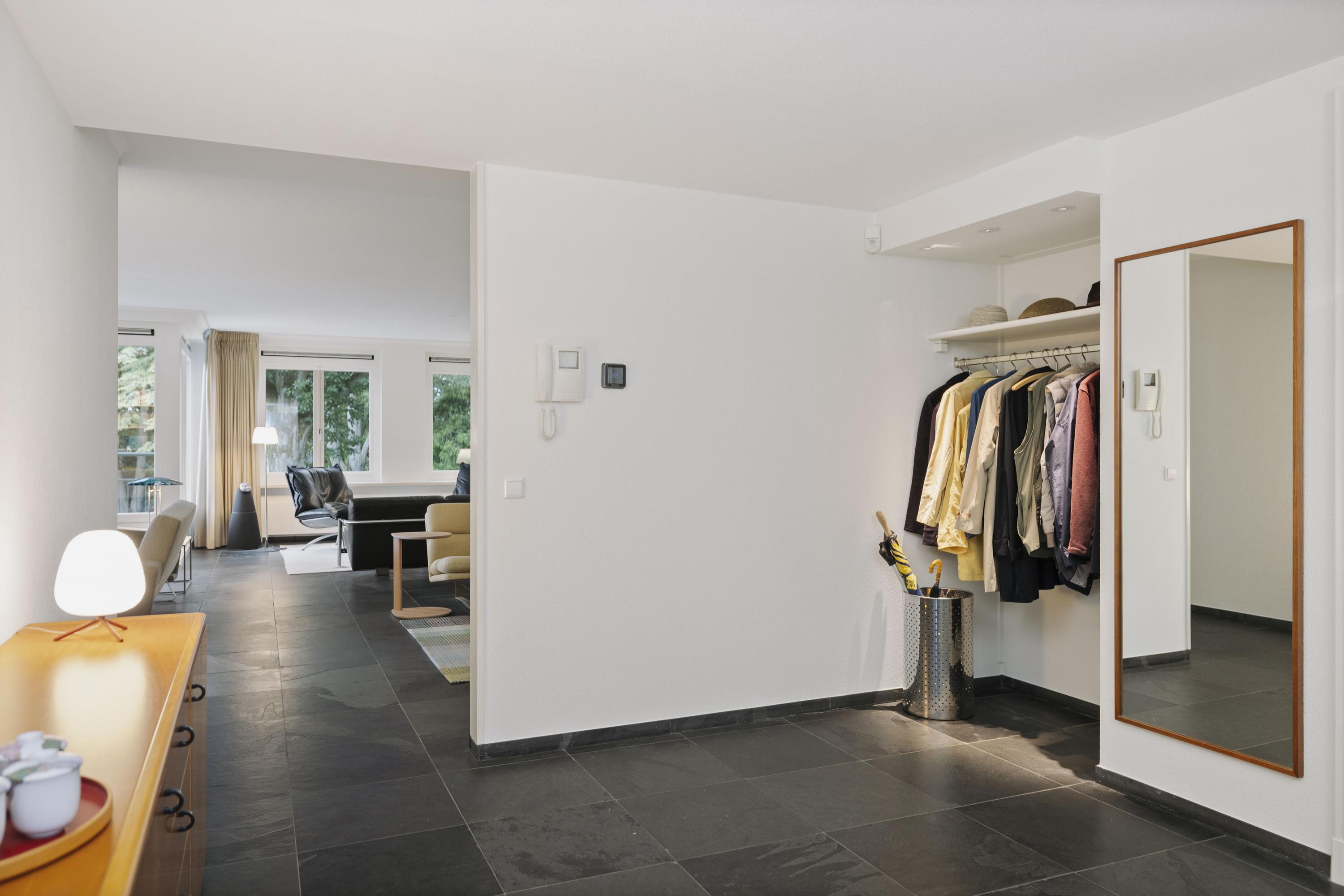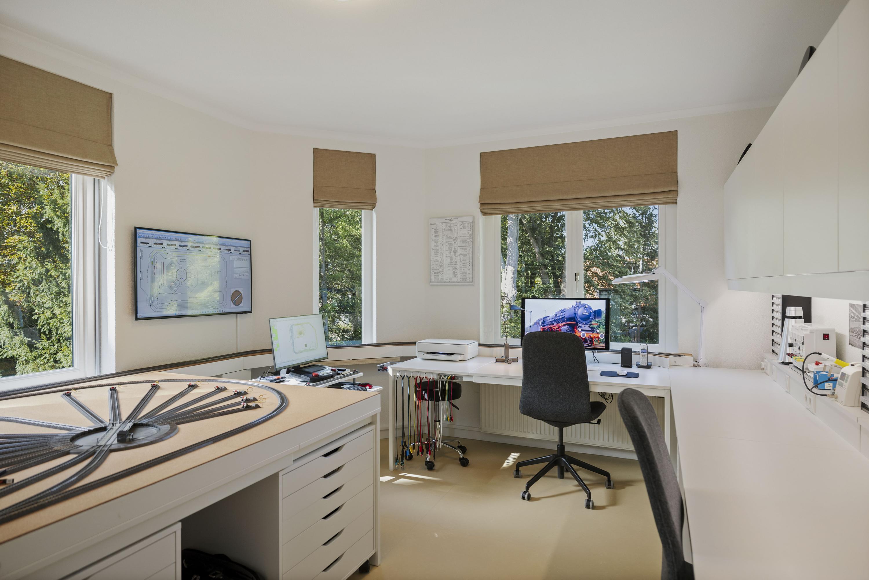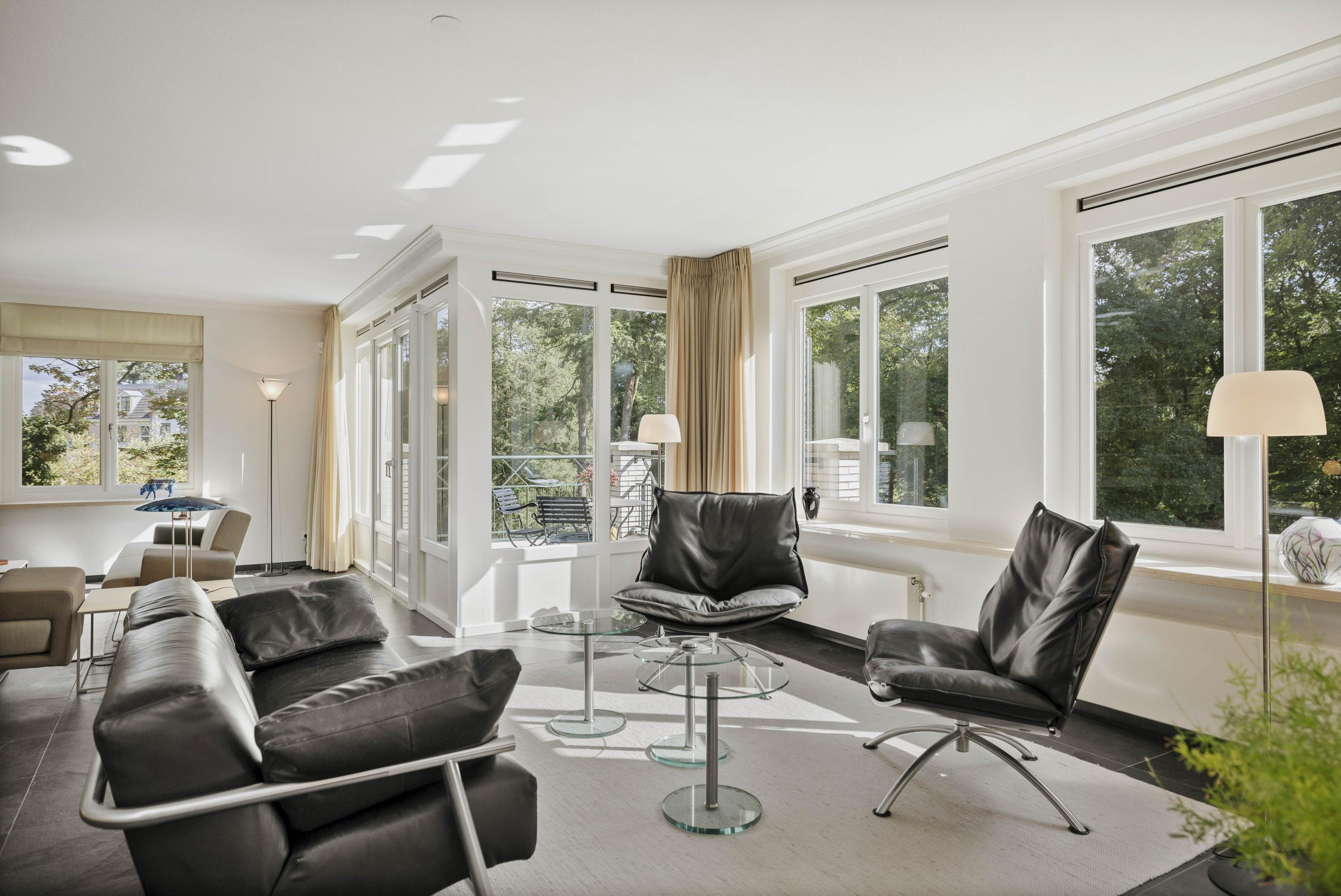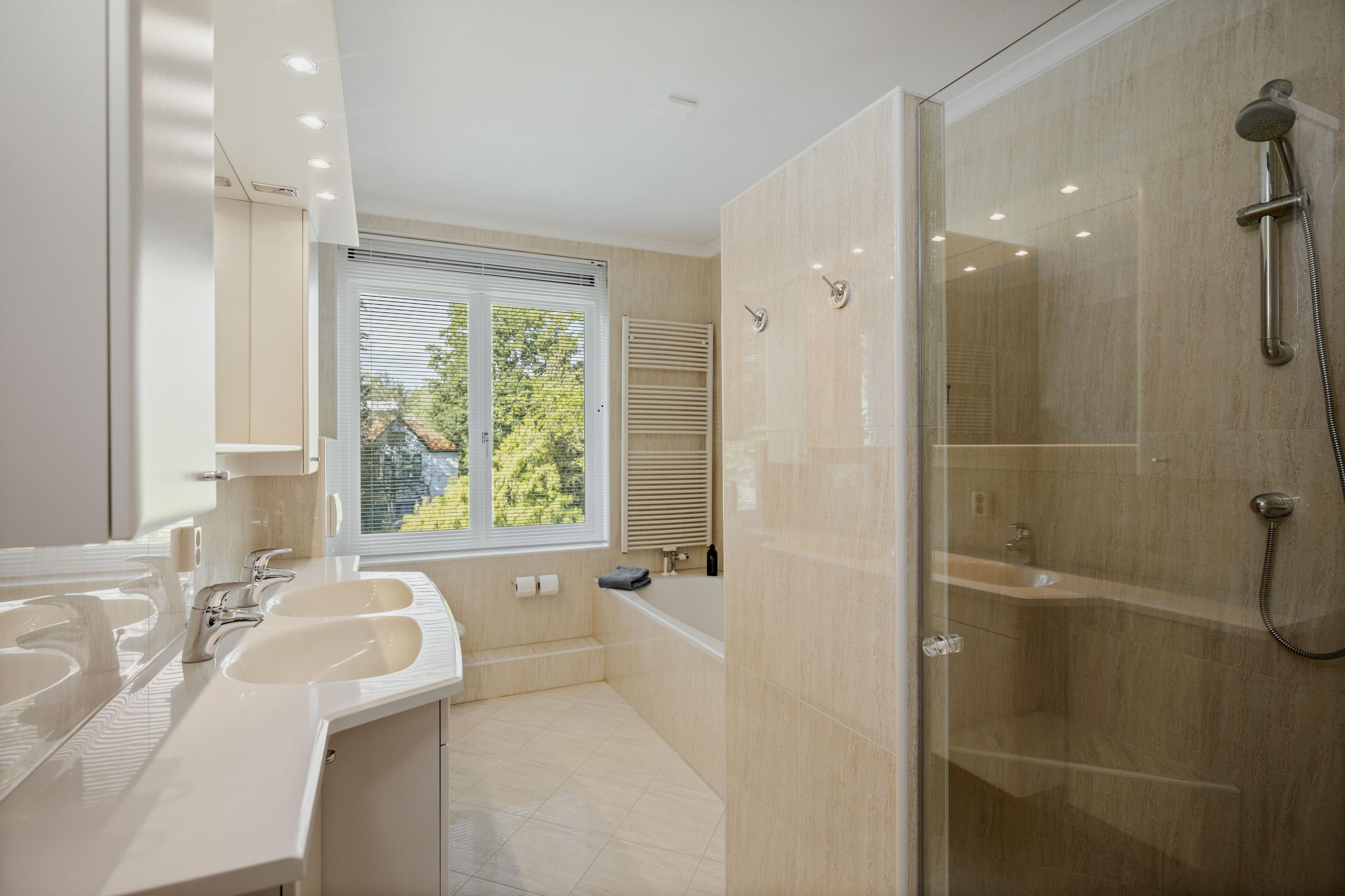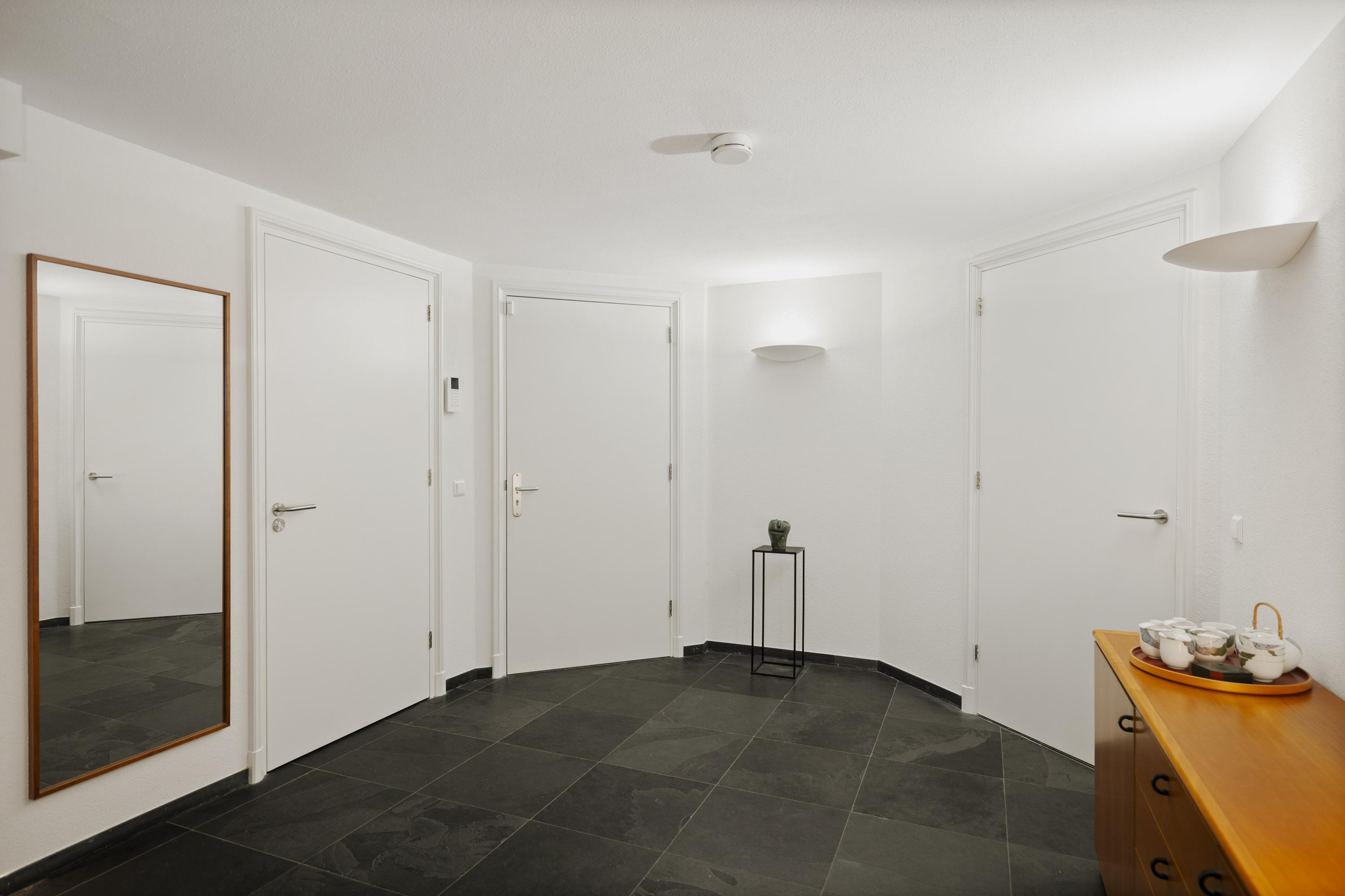 The flat is accessible from the central entrance, both by stairs and by lift. The private entrance is a spacious reception hall. Here you will find a guest toilet and access to the living room and the master bedroom. The living room is very spacious and light because of the numerous windows. In the heart of the room is a beautiful modern open gas fireplace. On the floor Brazilian slate. The kitchen is equipped with a black granite top with light yellow fronts and includes a pharmacy cabinet. All the necessary appliances (Miele) are available, including a five-burner induction hob. From the hall you can also reach the bright master bedroom with a fantastic spacious walk-in closet (15 m2) and a lovely bathroom. In 2017, it was completely renovated and equipped with a steam/shower cabin with rain, neck and hand shower, a Geberit shower toilet, bath furniture, double wash basins with Dornbracht taps, a towel radiator and underfloor heating. Connected tot the living room is a spacious study en suite, which can be closed off with glass sliding doors. Along the second hall are the second and third bedroom, and the second bathroom. The third bedroom is now in use as a second study. The bathroom is bright and spacious, with a walk-in shower, bathtub, toilet and double wash basin. On the right side of the hall, you’ll find access to the utility room with a stainless steel sink, the central heating boiler (2021), washing machine and dryer, water softener and storage.