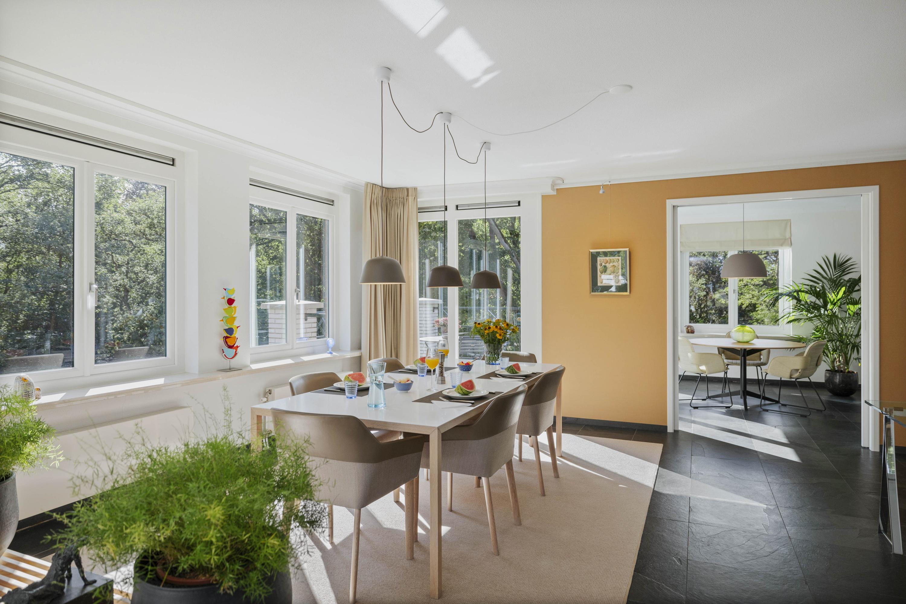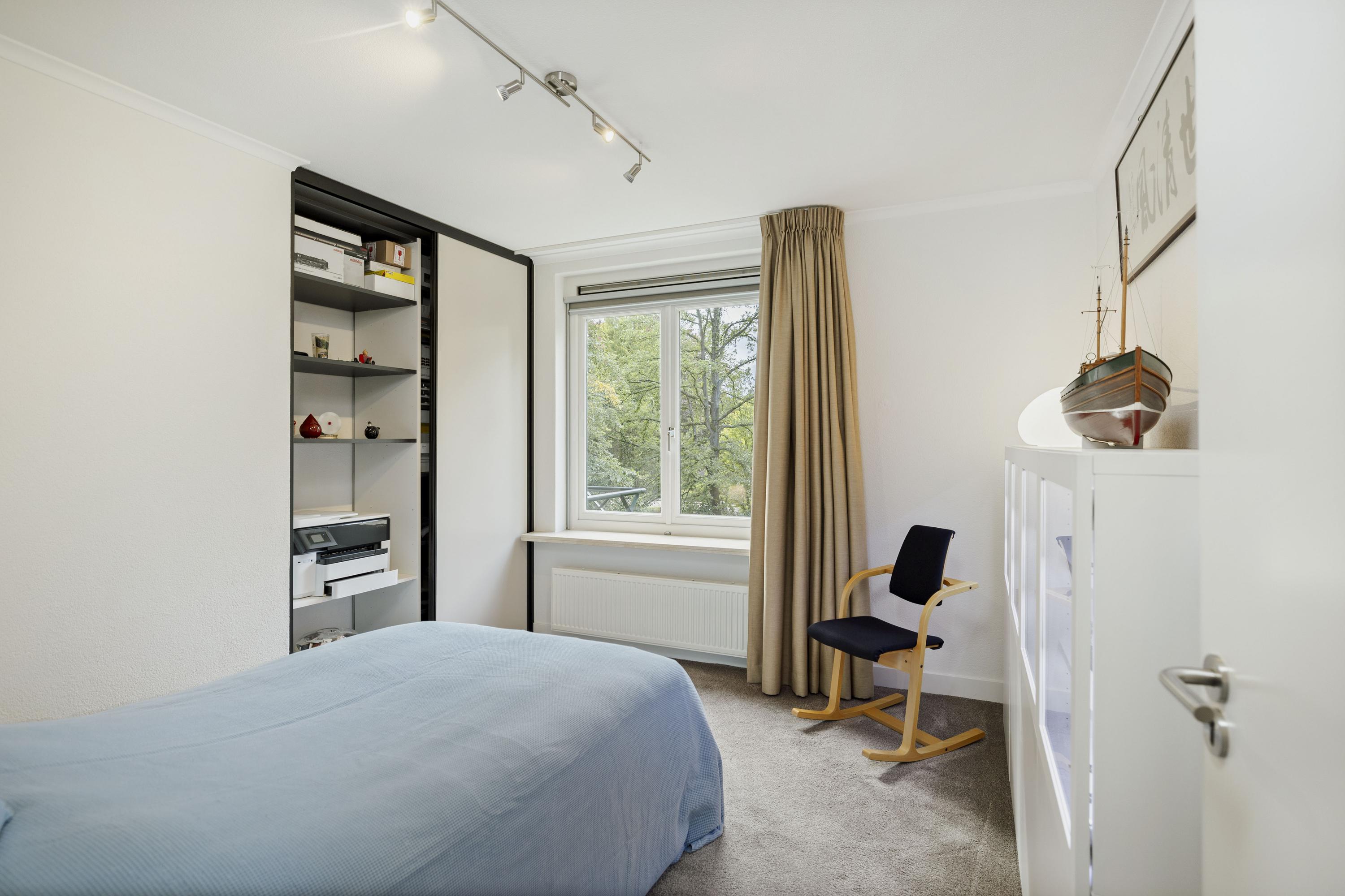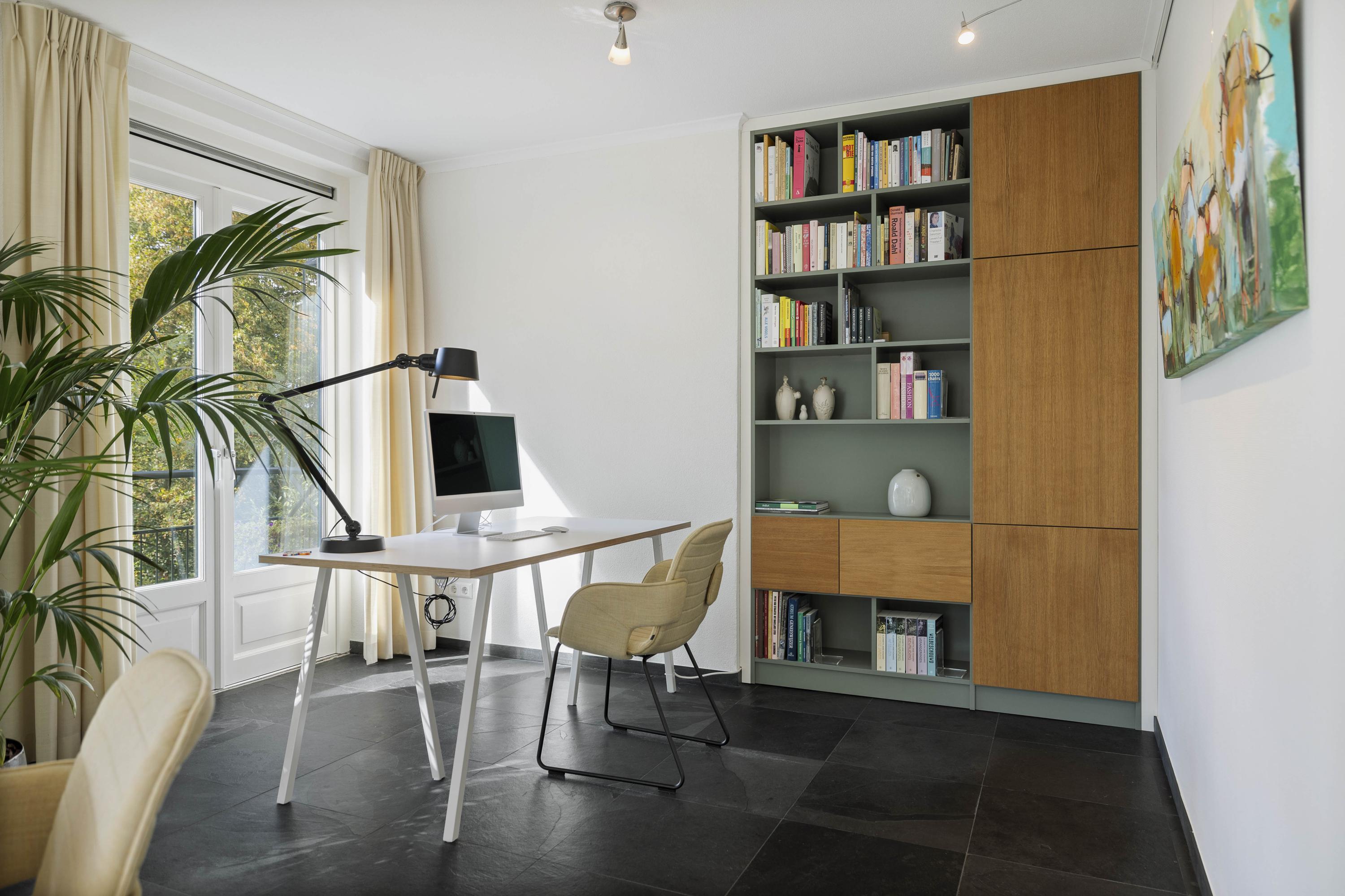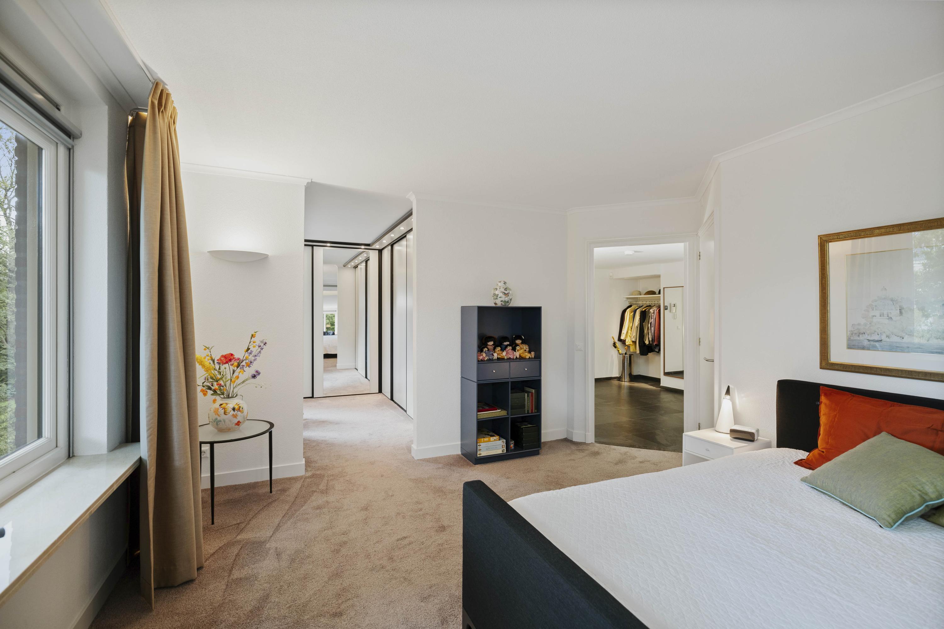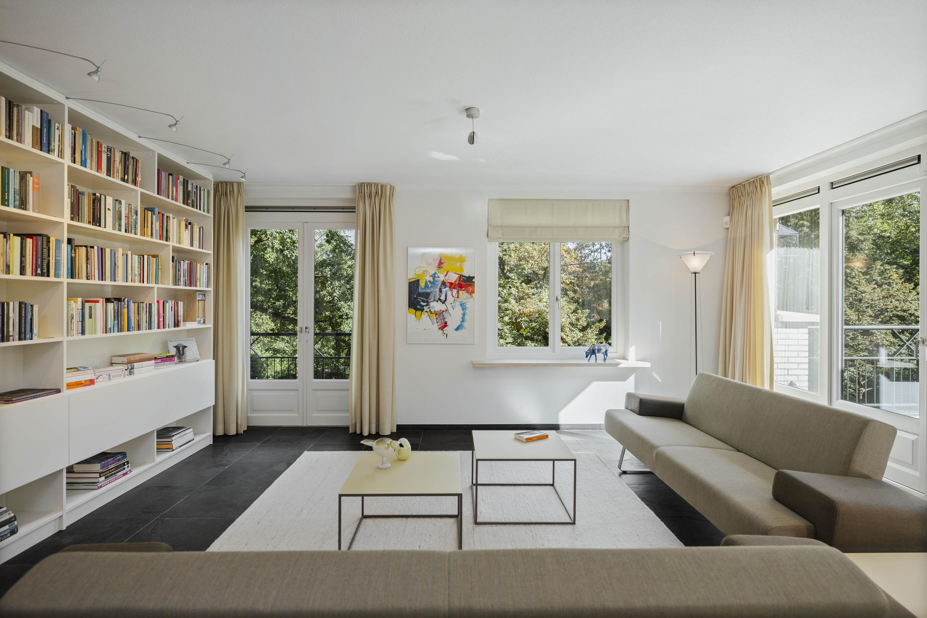 The flat is accessible from the central entrance, both by stairs and by lift. The private entrance is a spacious reception hall. Here you will find a guest toilet and access to the living room and the master bedroom. The living room is very spacious and light because of the numerous windows. In the heart of the room is a beautiful modern open gas fireplace. On the floor Brazilian slate. The kitchen is equipped with a black granite top with light yellow fronts and includes a pharmacy cabinet. All the necessary appliances (Miele) are available, including a five-burner induction hob. From the hall you can also reach the bright master bedroom with a fantastic spacious walk-in closet (15 m2) and a lovely bathroom. In 2017, it was completely renovated and equipped with a steam/shower cabin with rain, neck and hand shower, a Geberit shower toilet, bath furniture, double wash basins with Dornbracht taps, a towel radiator and underfloor heating. Connected tot the living room is a spacious study en suite, which can be closed off with glass sliding doors. Along the second hall are the second and third bedroom, and the second bathroom. The third bedroom is now in use as a second study. The bathroom is bright and spacious, with a walk-in shower, bathtub, toilet and double wash basin. On the right side of the hall, you’ll find access to the utility room with a stainless steel sink, the central heating boiler (2021), washing machine and dryer, water softener and storage.