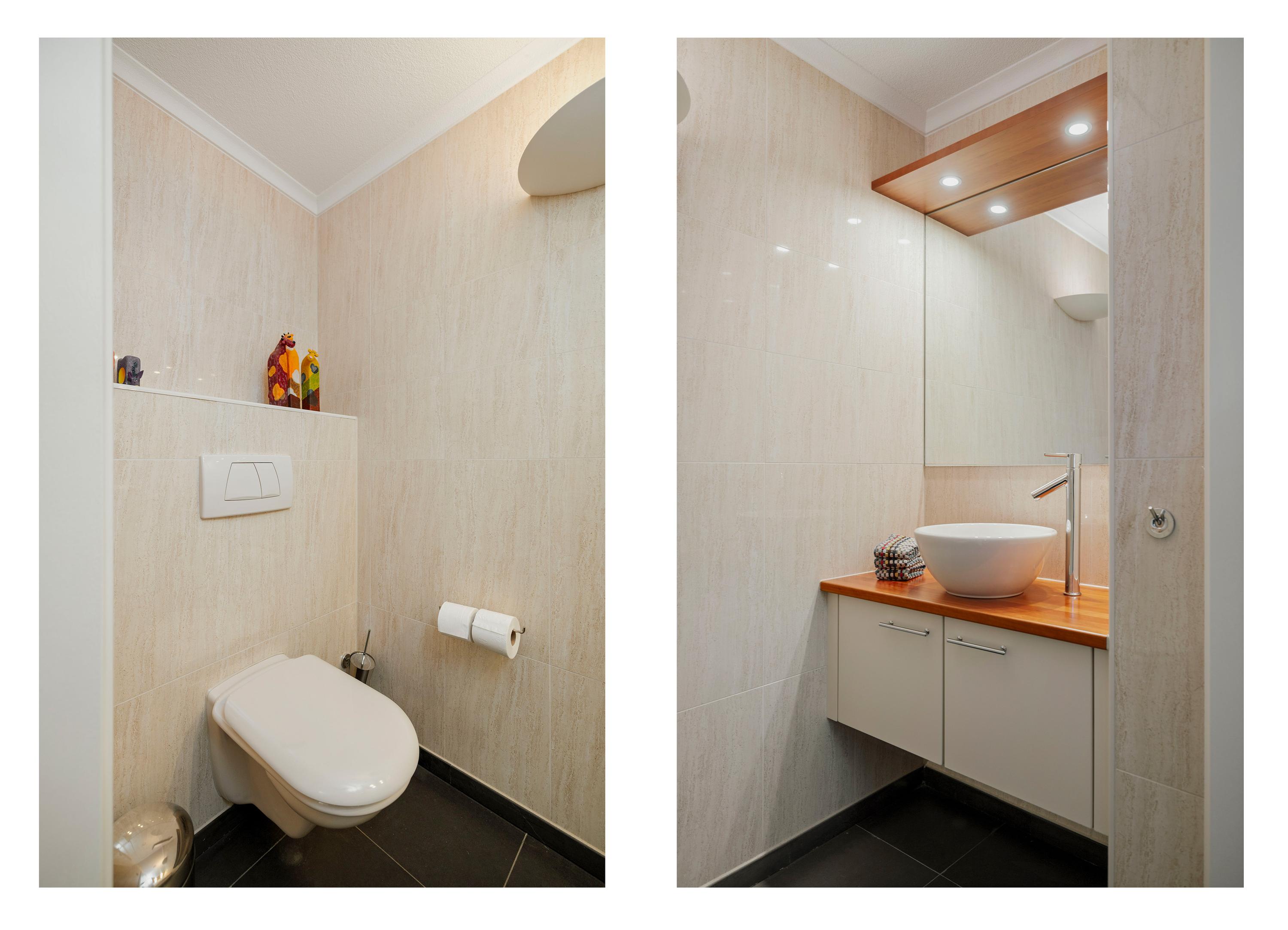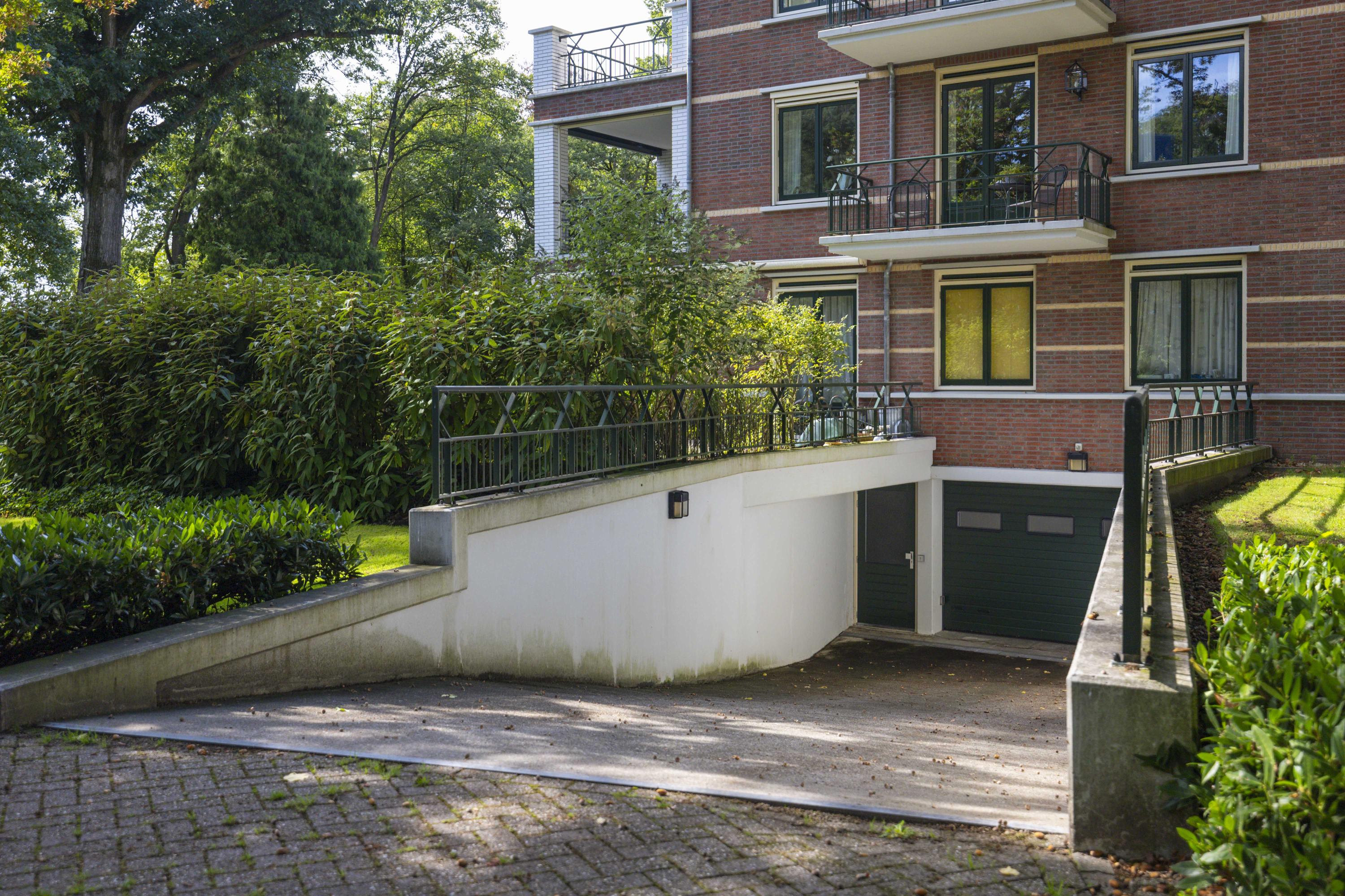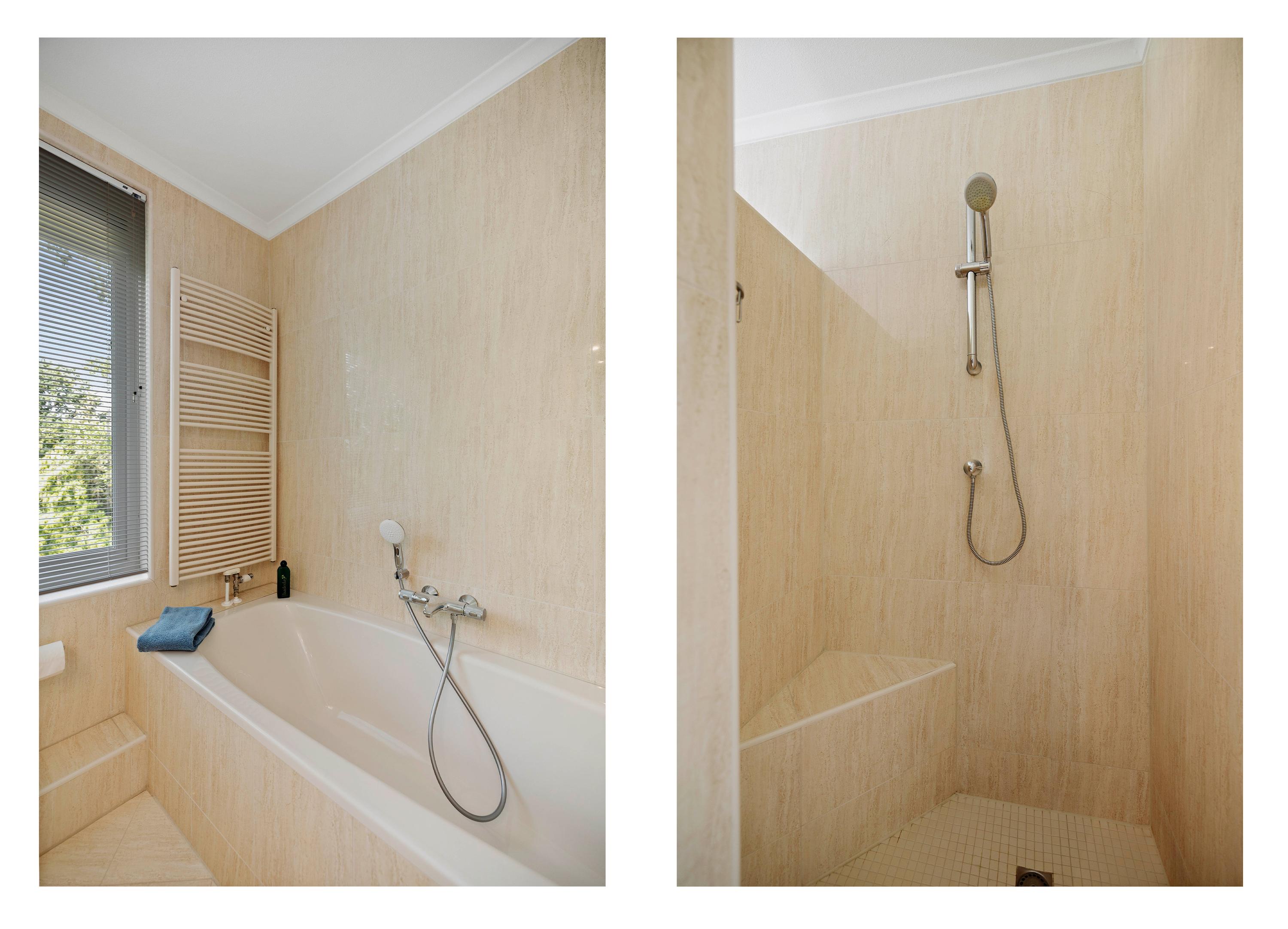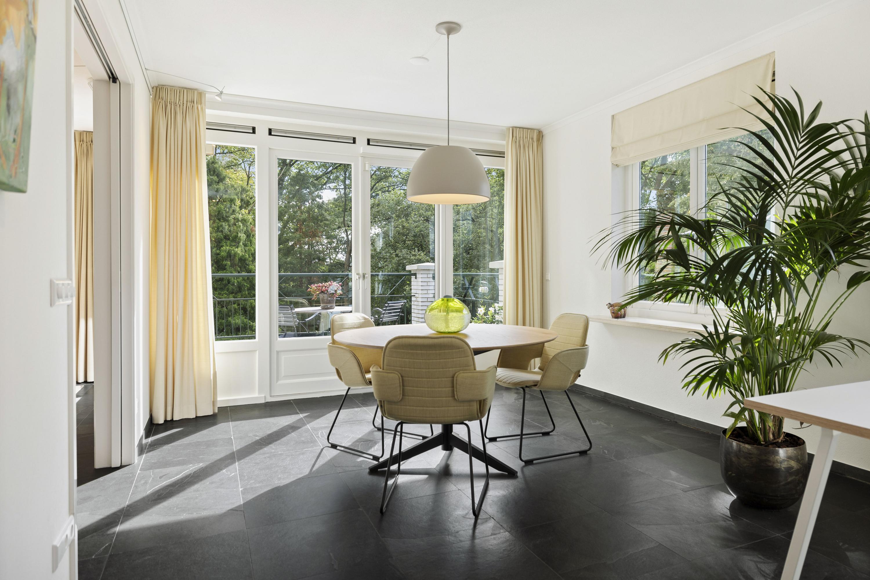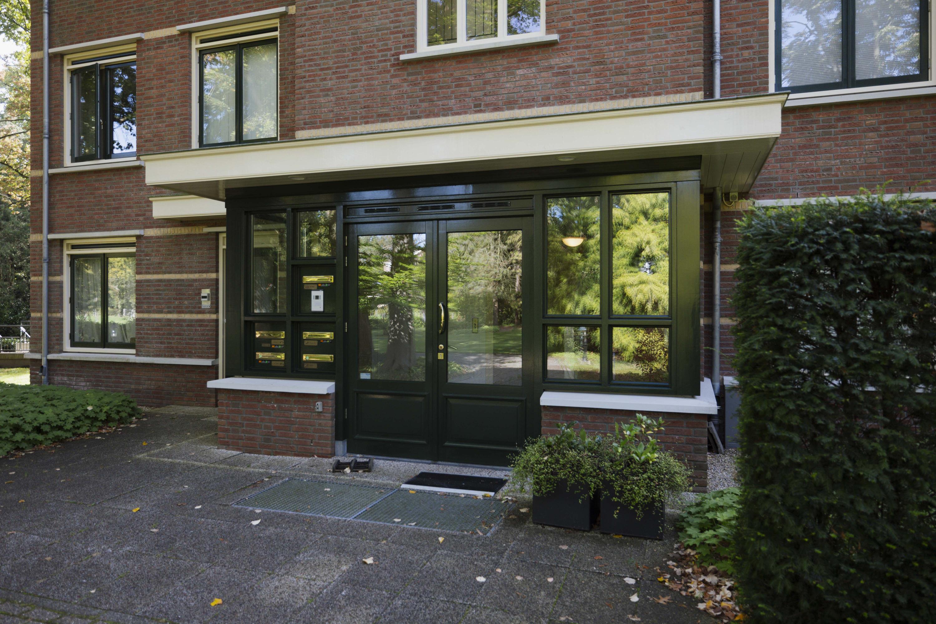 The flat is accessible from the central entrance, both by stairs and by lift. The private entrance is a spacious reception hall. Here you will find a guest toilet and access to the living room and the master bedroom. The living room is very spacious and light because of the numerous windows. In the heart of the room is a beautiful modern open gas fireplace. On the floor Brazilian slate. The kitchen is equipped with a black granite top with light yellow fronts and includes a pharmacy cabinet. All the necessary appliances (Miele) are available, including a five-burner induction hob. From the hall you can also reach the bright master bedroom with a fantastic spacious walk-in closet (15 m2) and a lovely bathroom. In 2017, it was completely renovated and equipped with a steam/shower cabin with rain, neck and hand shower, a Geberit shower toilet, bath furniture, double wash basins with Dornbracht taps, a towel radiator and underfloor heating. Connected tot the living room is a spacious study en suite, which can be closed off with glass sliding doors. Along the second hall are the second and third bedroom, and the second bathroom. The third bedroom is now in use as a second study. The bathroom is bright and spacious, with a walk-in shower, bathtub, toilet and double wash basin. On the right side of the hall, you’ll find access to the utility room with a stainless steel sink, the central heating boiler (2021), washing machine and dryer, water softener and storage.