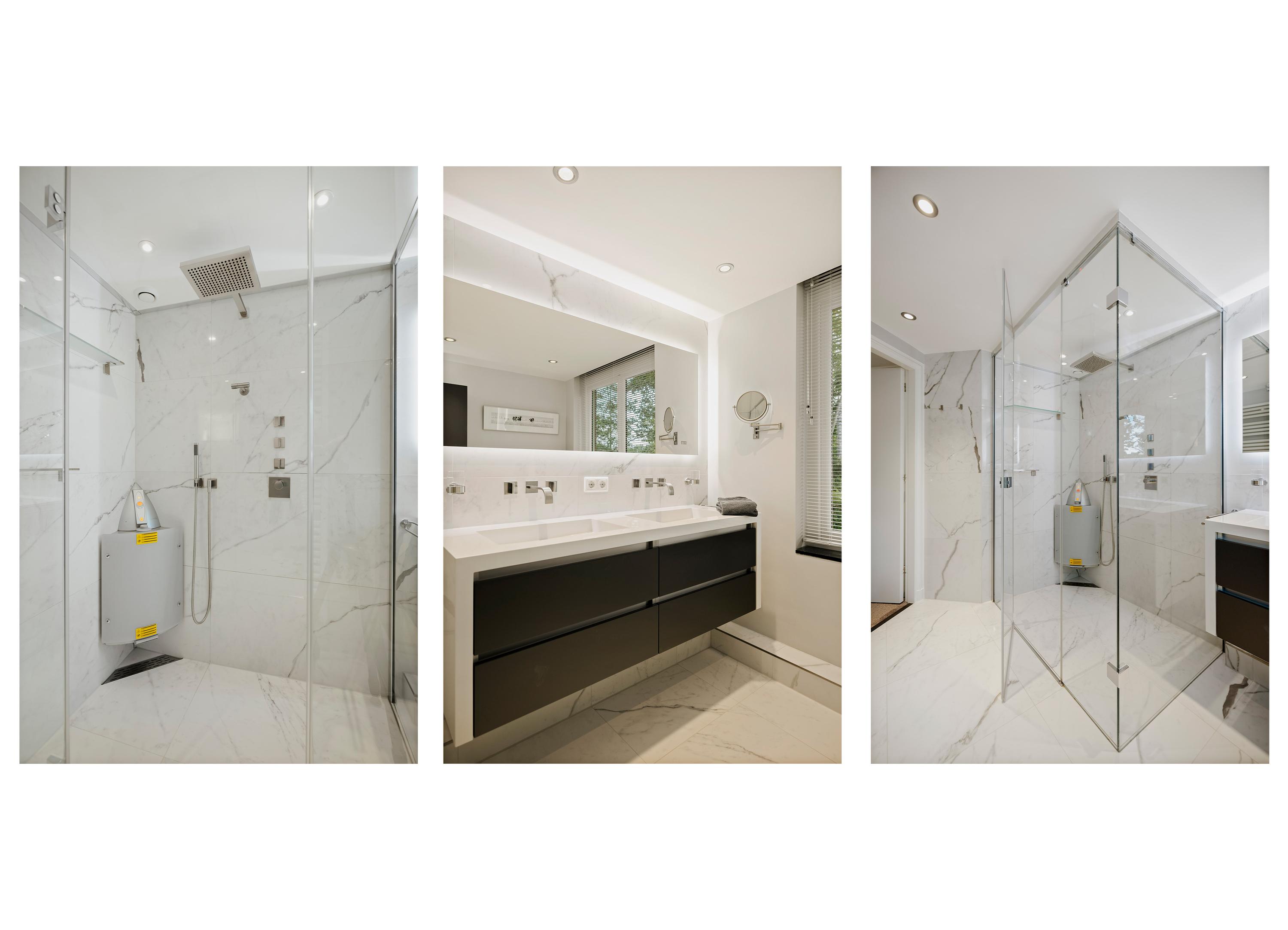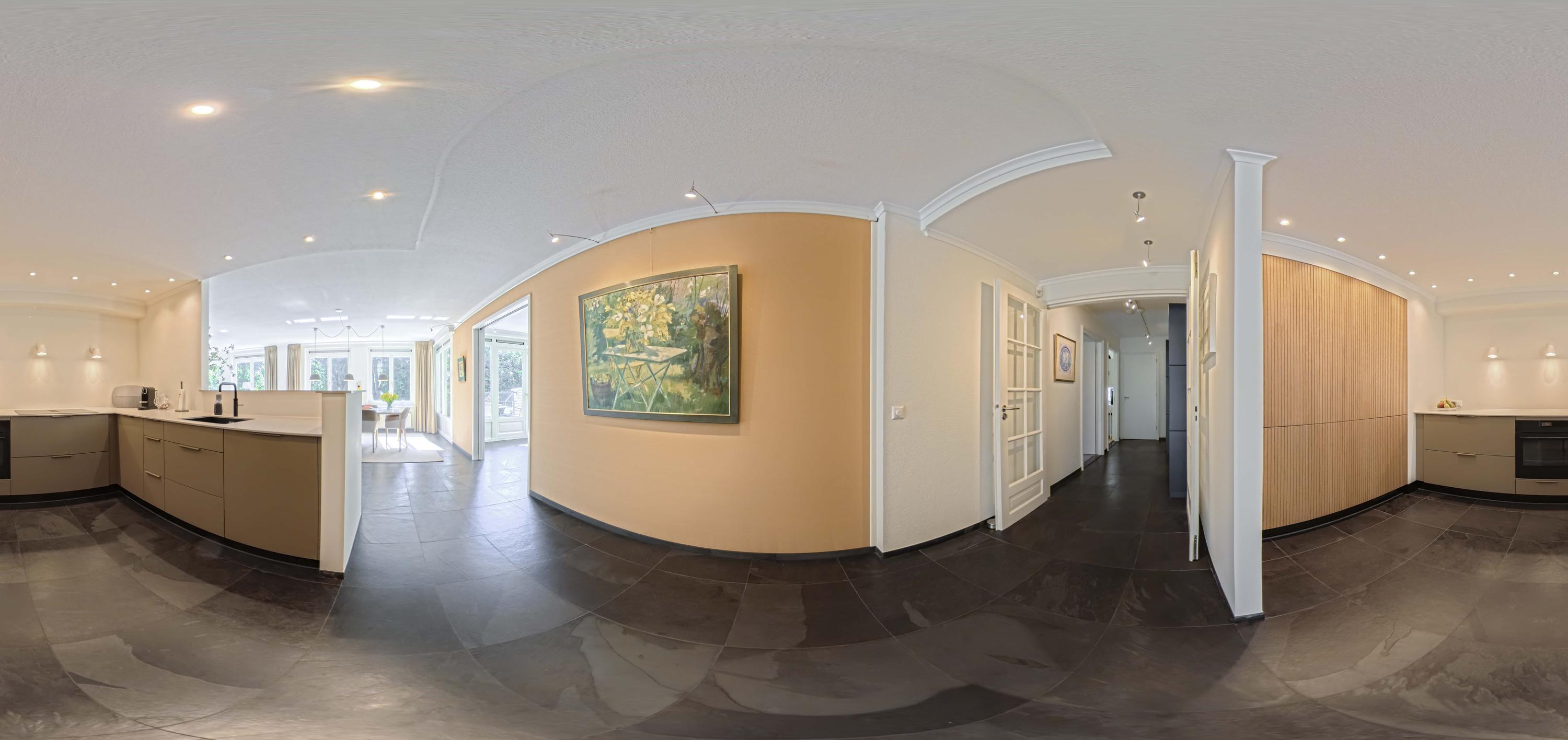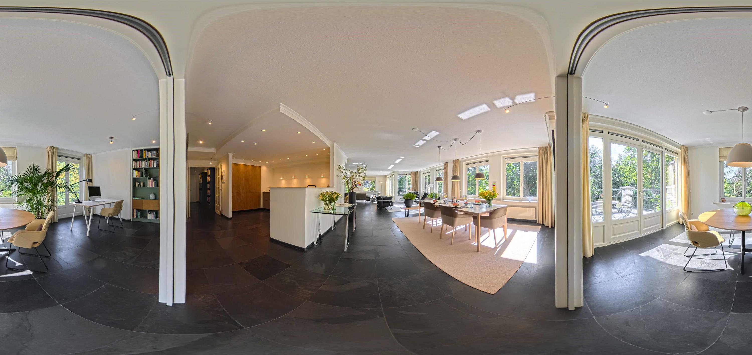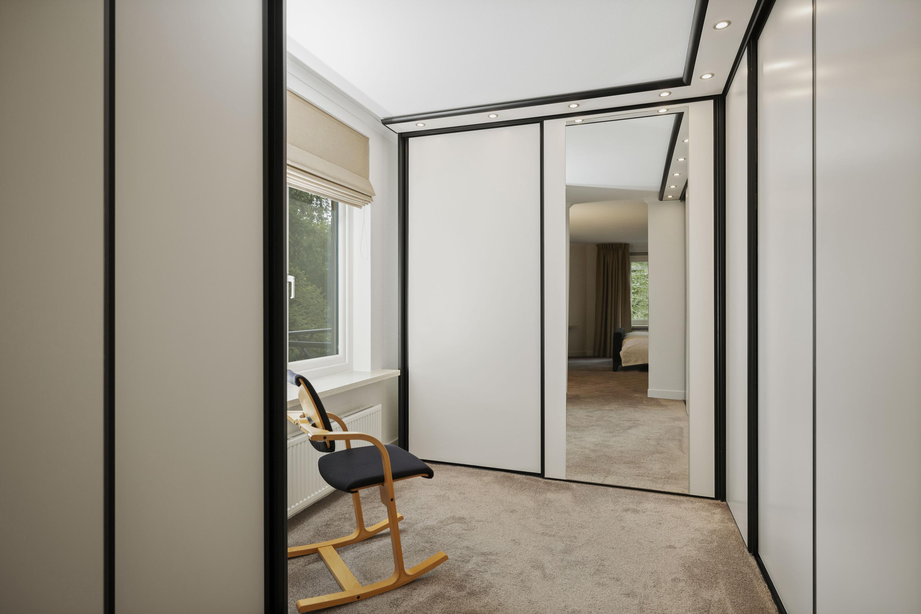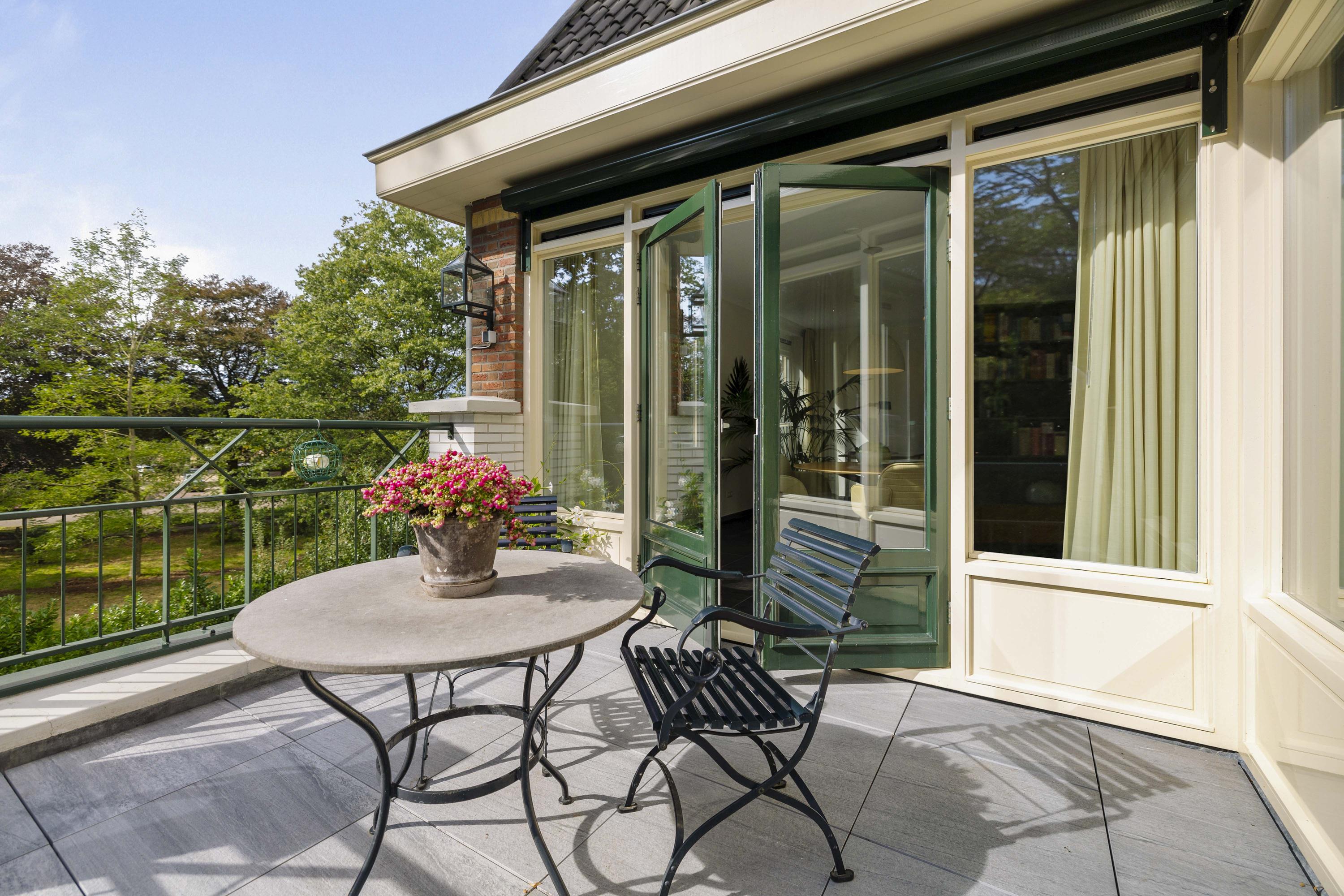 The flat is accessible from the central entrance, both by stairs and by lift. The private entrance is a spacious reception hall. Here you will find a guest toilet and access to the living room and the master bedroom. The living room is very spacious and light because of the numerous windows. In the heart of the room is a beautiful modern open gas fireplace. On the floor Brazilian slate. The kitchen is equipped with a black granite top with light yellow fronts and includes a pharmacy cabinet. All the necessary appliances (Miele) are available, including a five-burner induction hob. From the hall you can also reach the bright master bedroom with a fantastic spacious walk-in closet (15 m2) and a lovely bathroom. In 2017, it was completely renovated and equipped with a steam/shower cabin with rain, neck and hand shower, a Geberit shower toilet, bath furniture, double wash basins with Dornbracht taps, a towel radiator and underfloor heating. Connected tot the living room is a spacious study en suite, which can be closed off with glass sliding doors. Along the second hall are the second and third bedroom, and the second bathroom. The third bedroom is now in use as a second study. The bathroom is bright and spacious, with a walk-in shower, bathtub, toilet and double wash basin. On the right side of the hall, you’ll find access to the utility room with a stainless steel sink, the central heating boiler (2021), washing machine and dryer, water softener and storage.