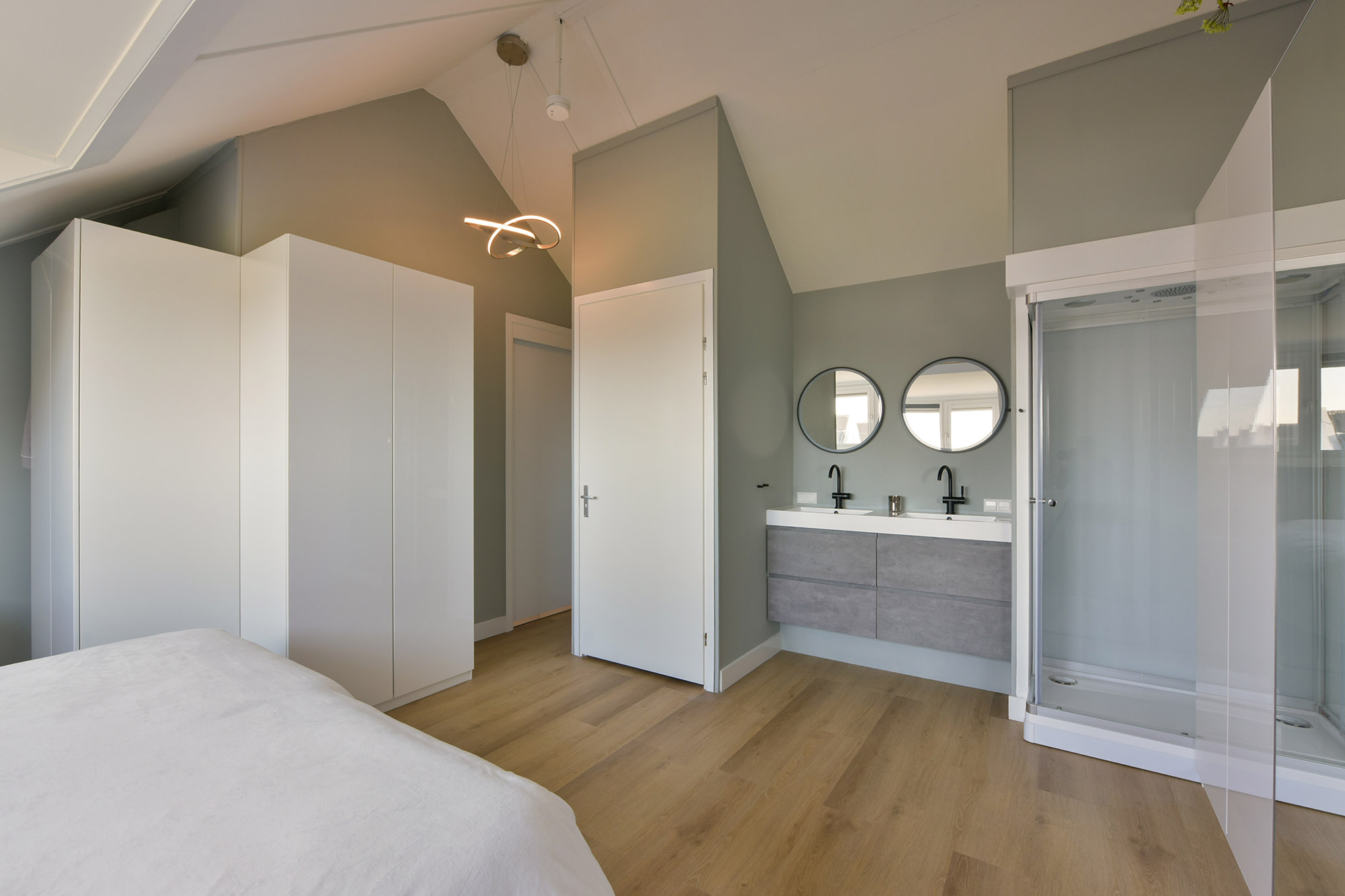 The bathroom feels like a luxury spa, with a large walk-in shower with glass door, a relaxing bathtub, a modern double vanity with heated and illuminated mirror, and a toilet. The high-quality tiling aligns with the style of the ground floor. The entire first floor features a PVC floor with underfloor heating, and most windows are fitted with screens.