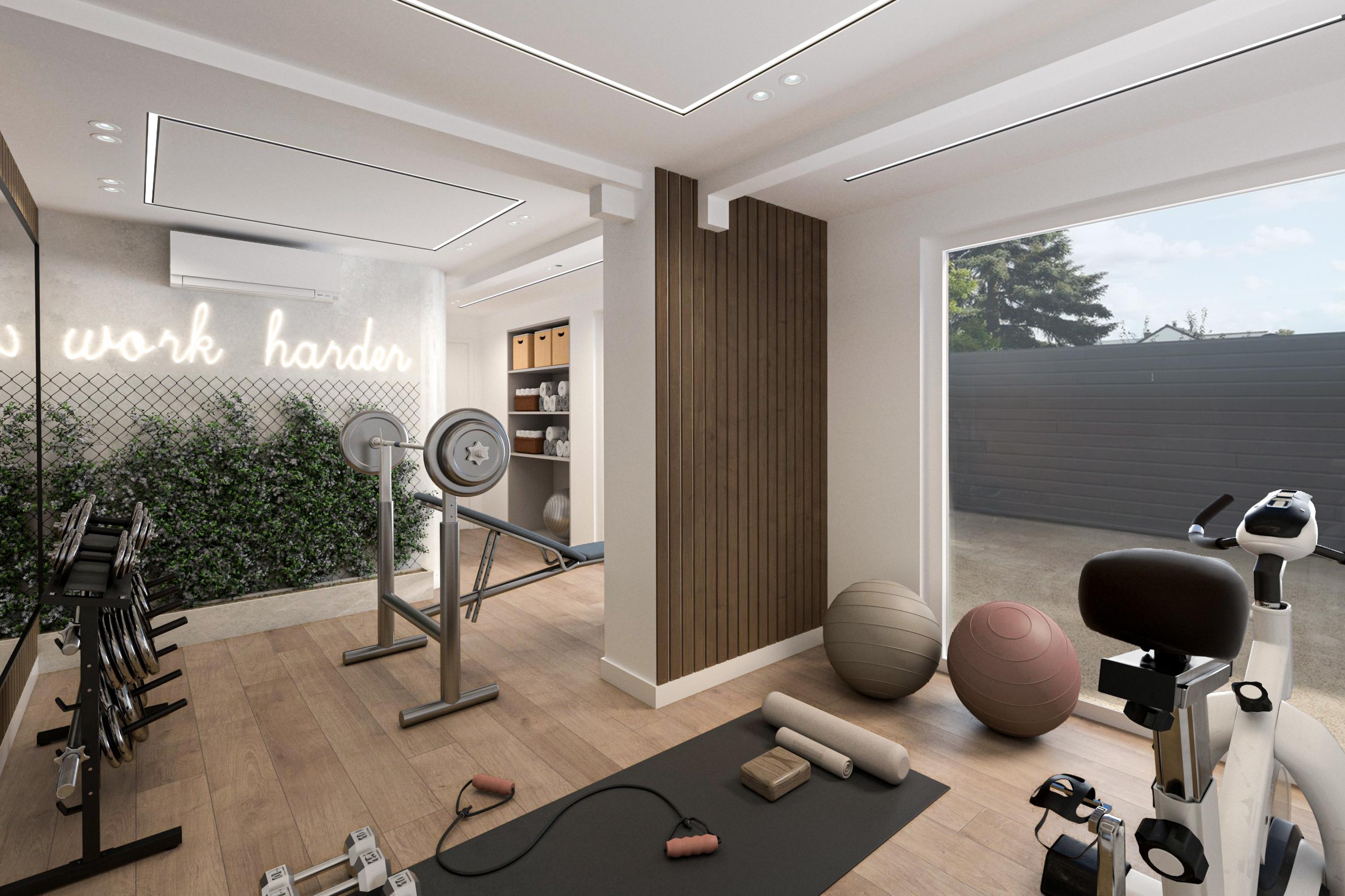 On the right side of the villa, you will find the wellness and fitness area. This section includes a bathroom, a room that can be used as a wellness space, and the option to create a full fitness room. An ideal place to relax or stay active, all within your own home.