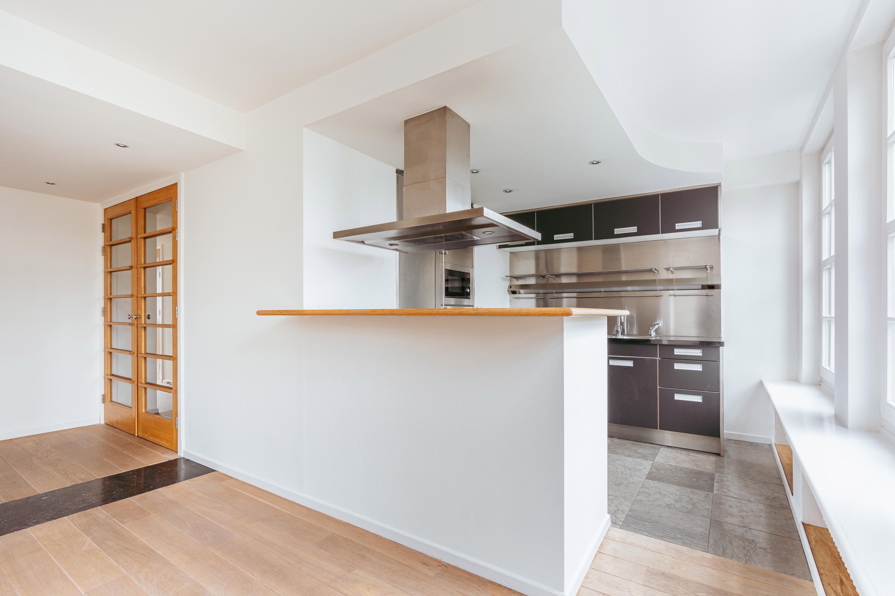 La cocina adyacente, diseñada tanto para la funcionalidad como para la convivencia, cuenta con lavavajillas, grifo Quooker y almacenamiento integrado, mientras que una amplia barra invita a reuniones informales. En la parte trasera, dos dormitorios de igual tamaño disfrutan de apacible luz natural, y el más grande dispone de tres armarios empotrados. Un práctico trastero alberga la lavadora y la secadora. La distribución del apartamento está cuidadosamente planificada y bien organizada, con opciones para su modernización según los gustos personales.